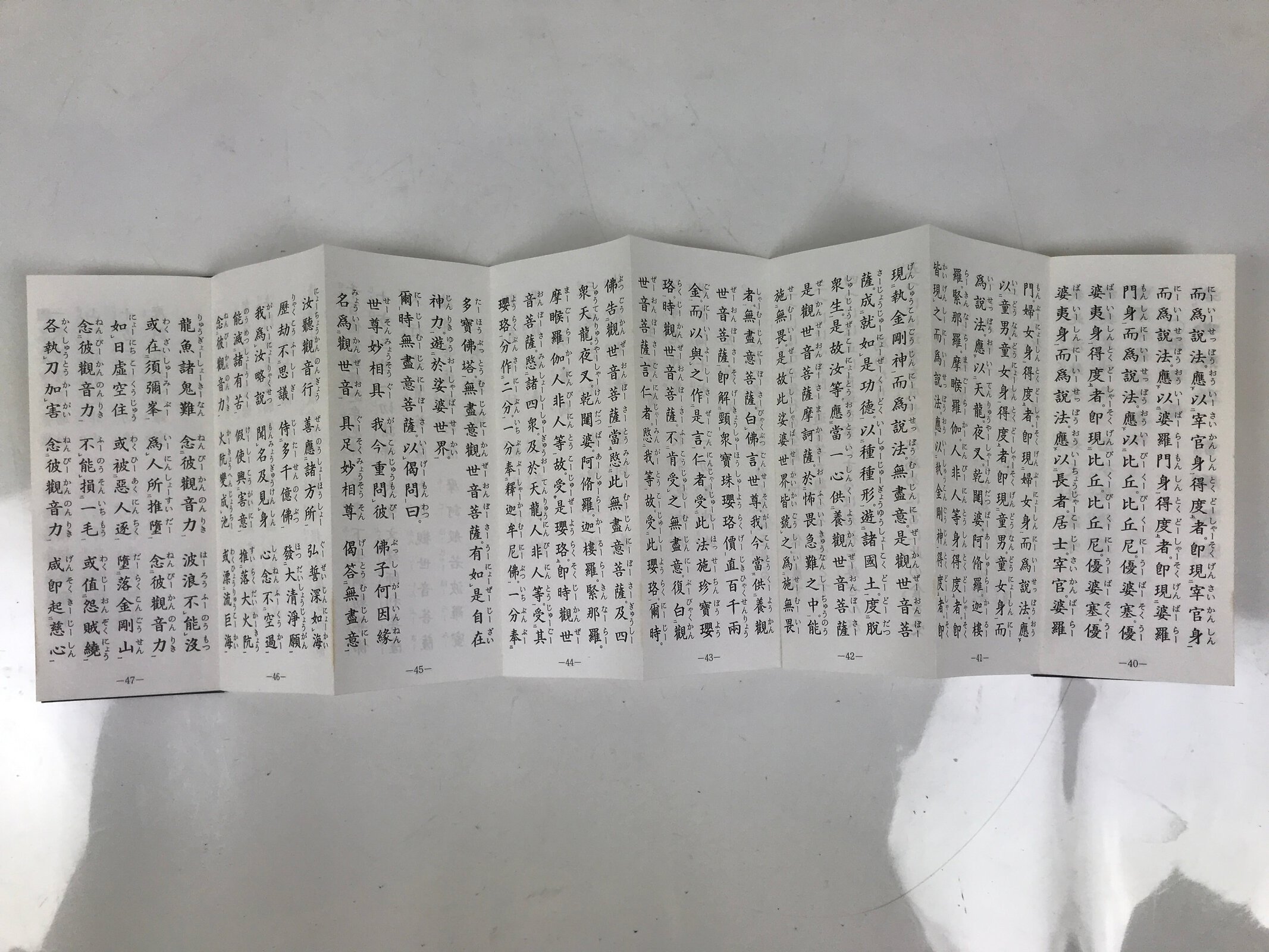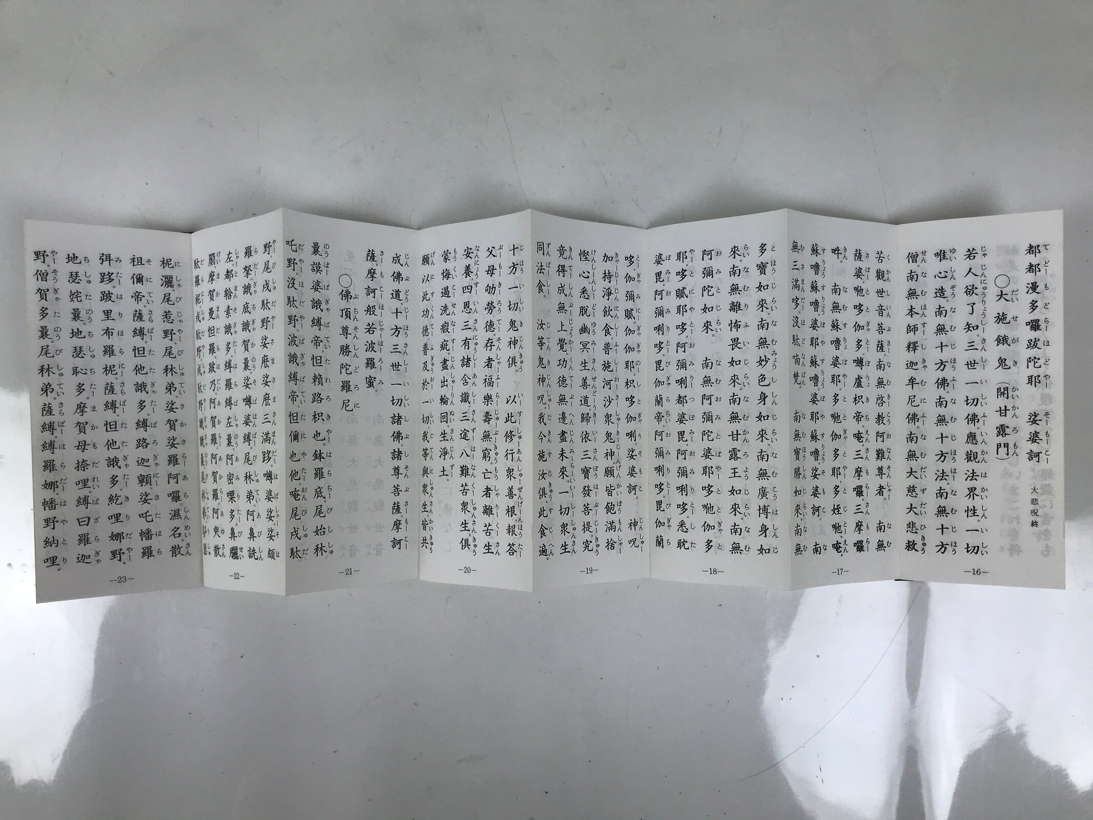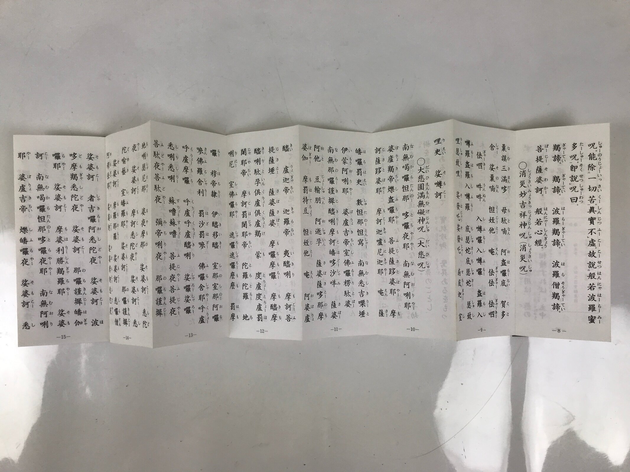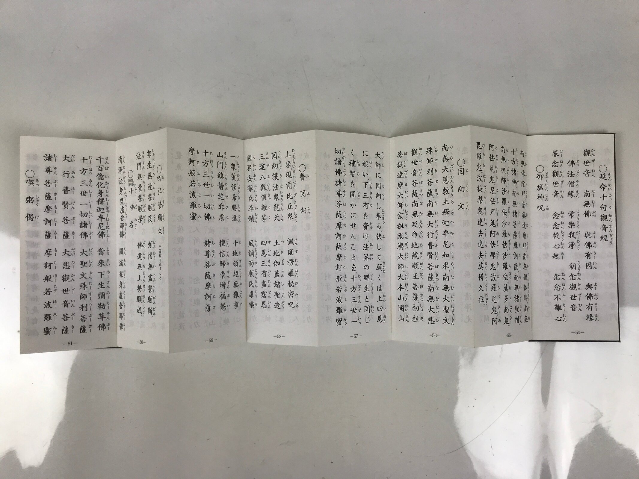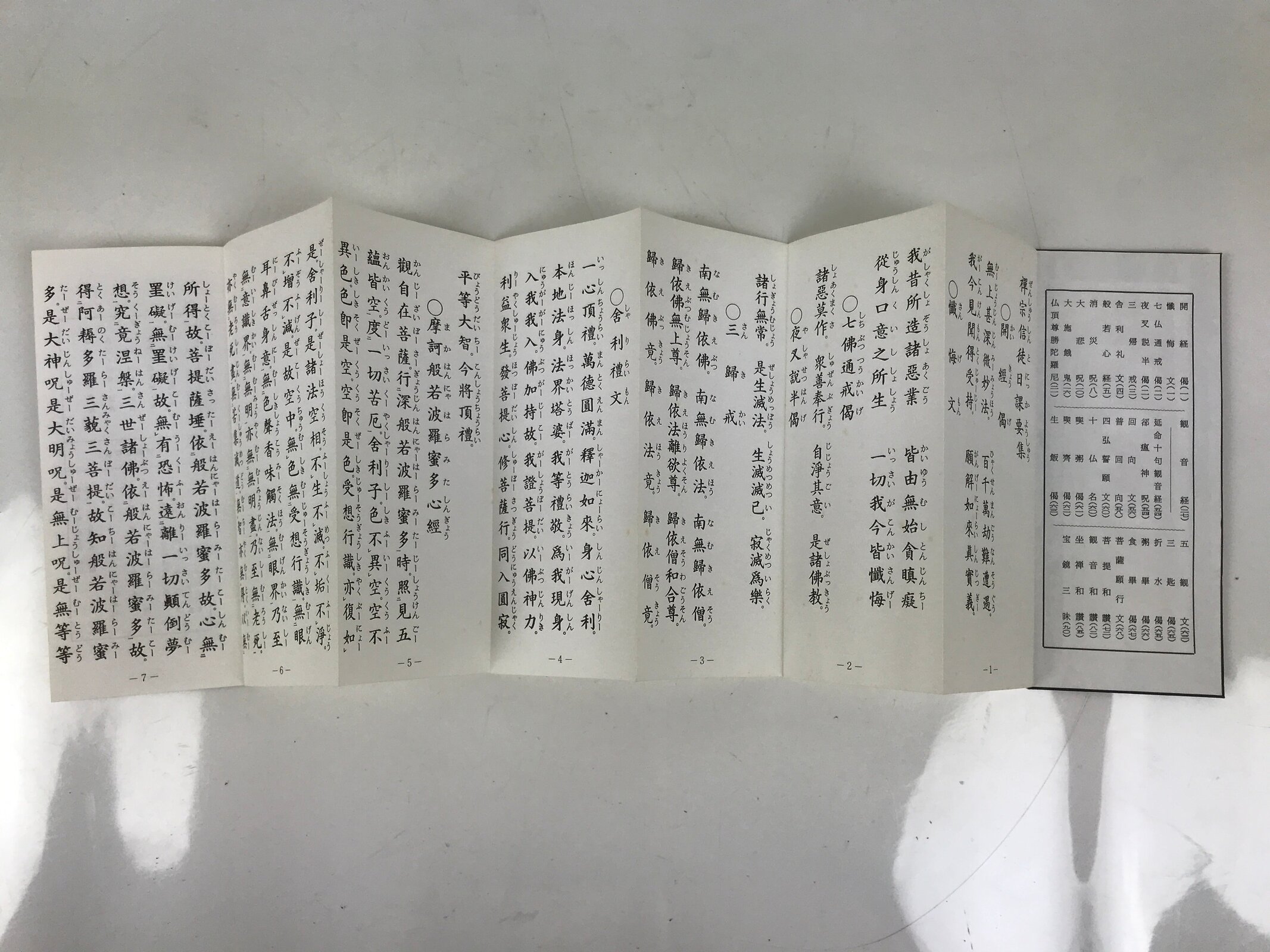 This vintage Japanese Buddhist accordion-type book with a brown cover features several texts and sutra for believers of the Linji (or Rinzai in Japanese) School for the practice of zen such as the Heart Sutra and the Enmei Jukku Kannon Gyo (The sutra of Kannon Bodhisattva in 10 phrases).