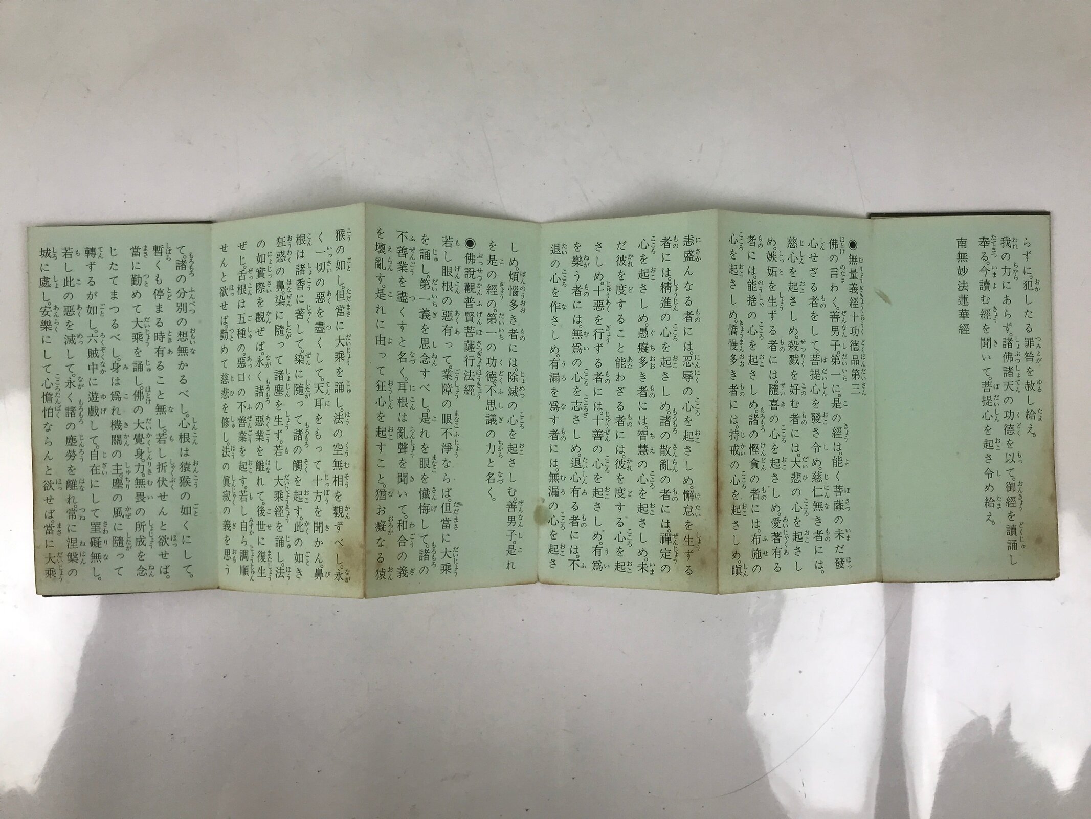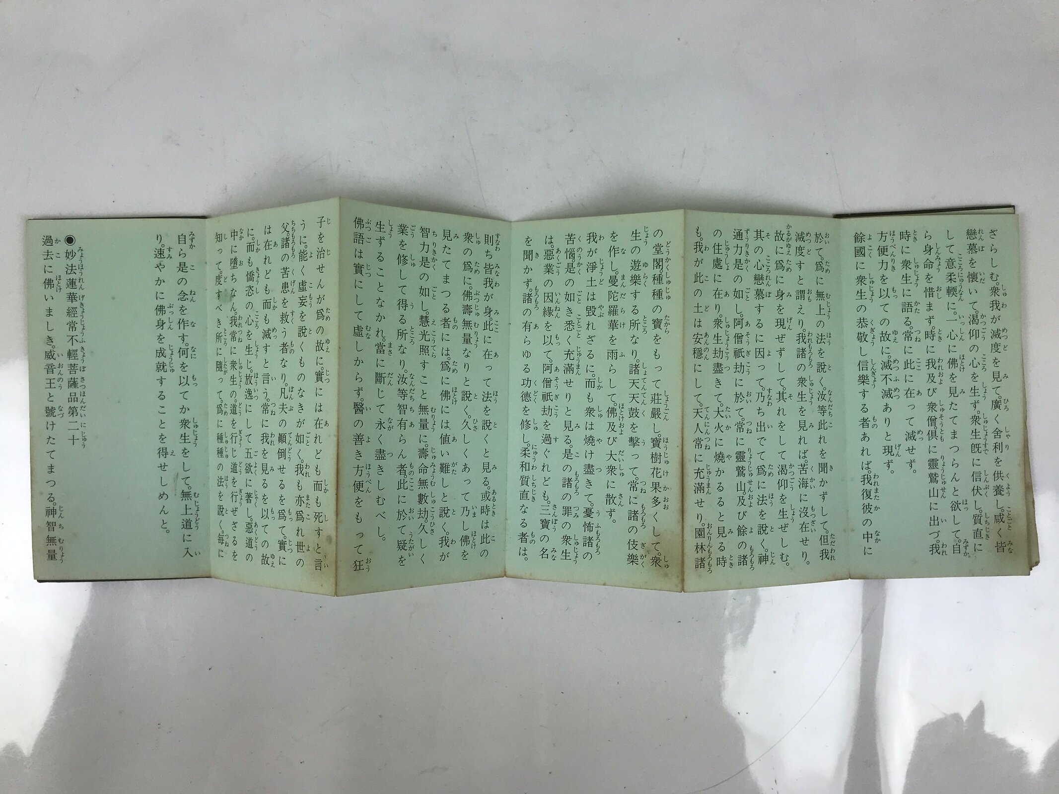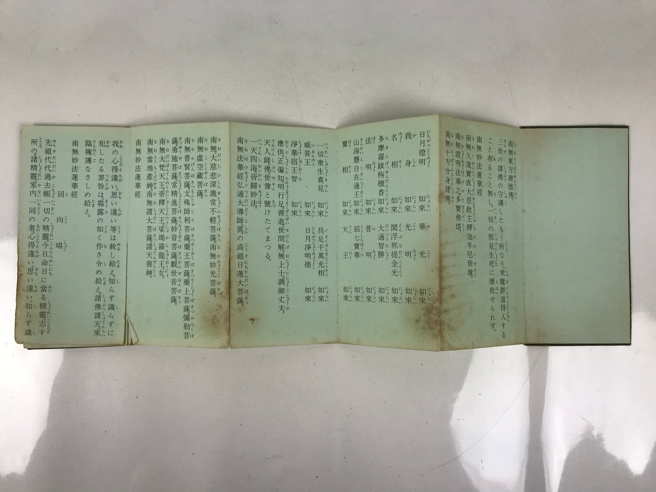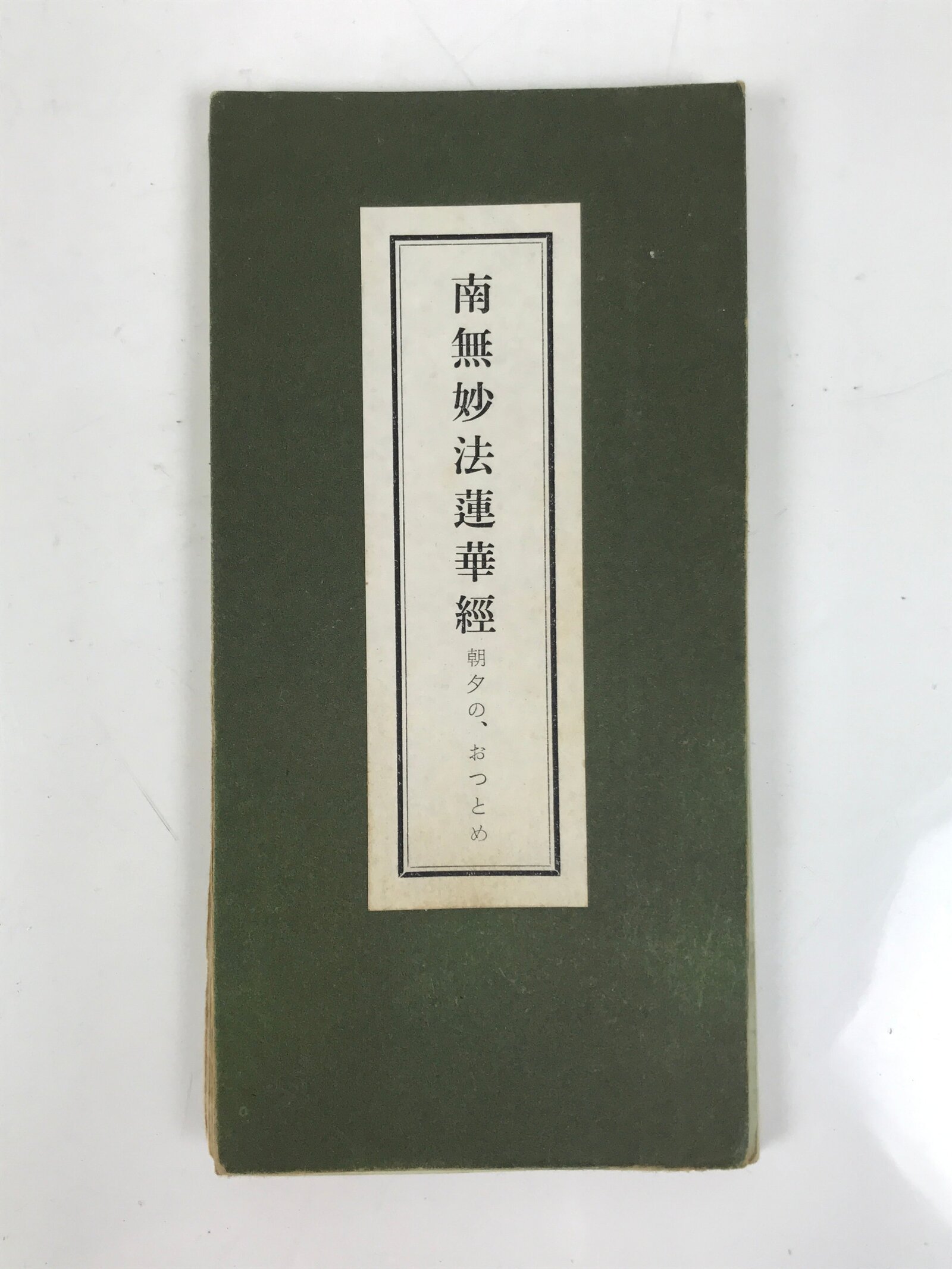 This vintage Japanese Buddhist book called Namu Myoho Renge Kyo (Devotion to the Mystic Dharma of the Lotus Flower Sutra) is an accordion-type book with a green cover. The pages are printed on one side only.