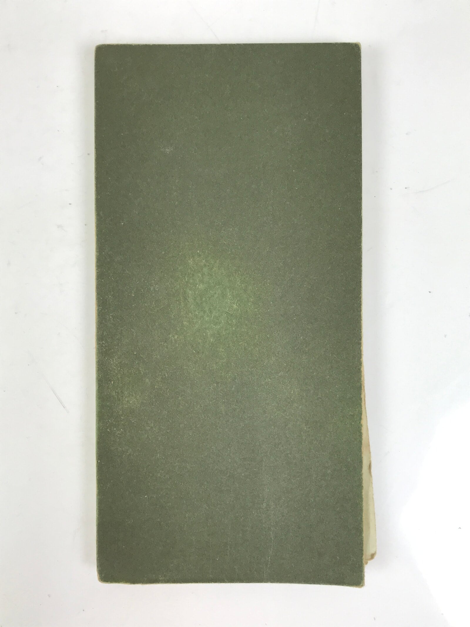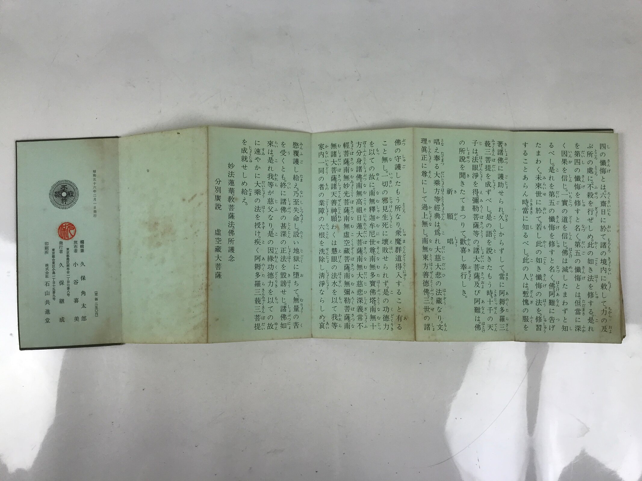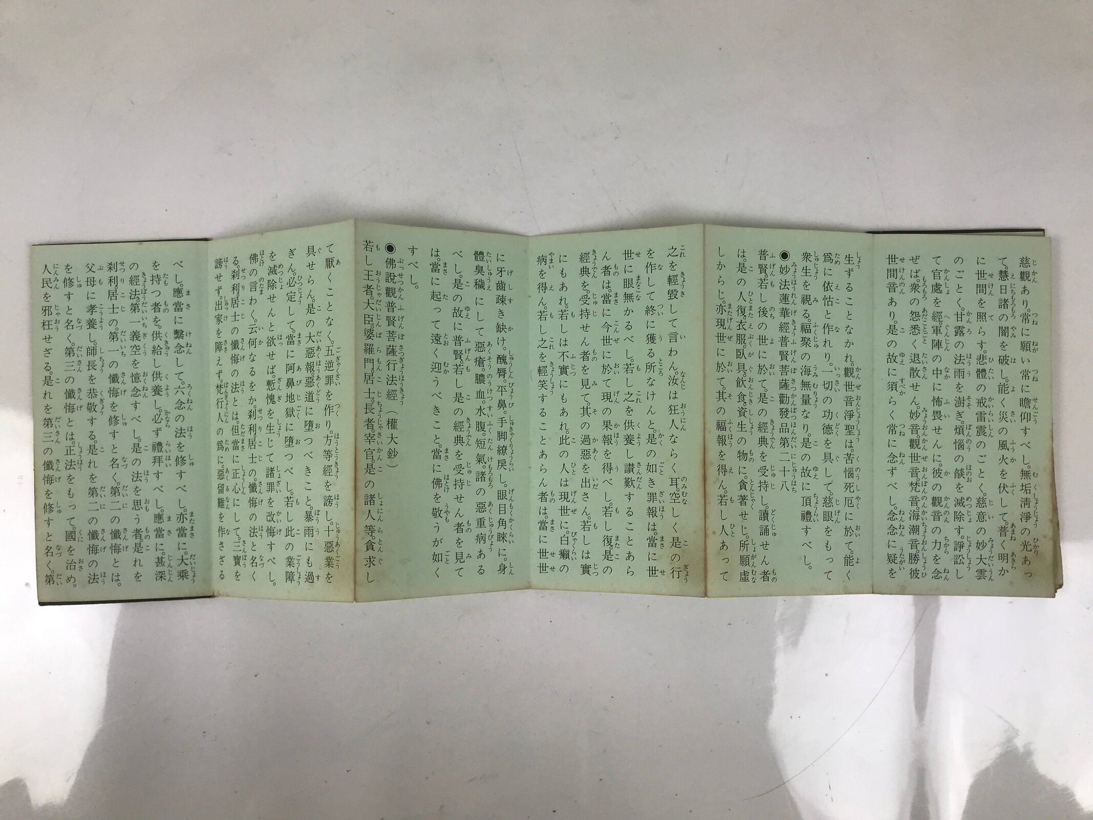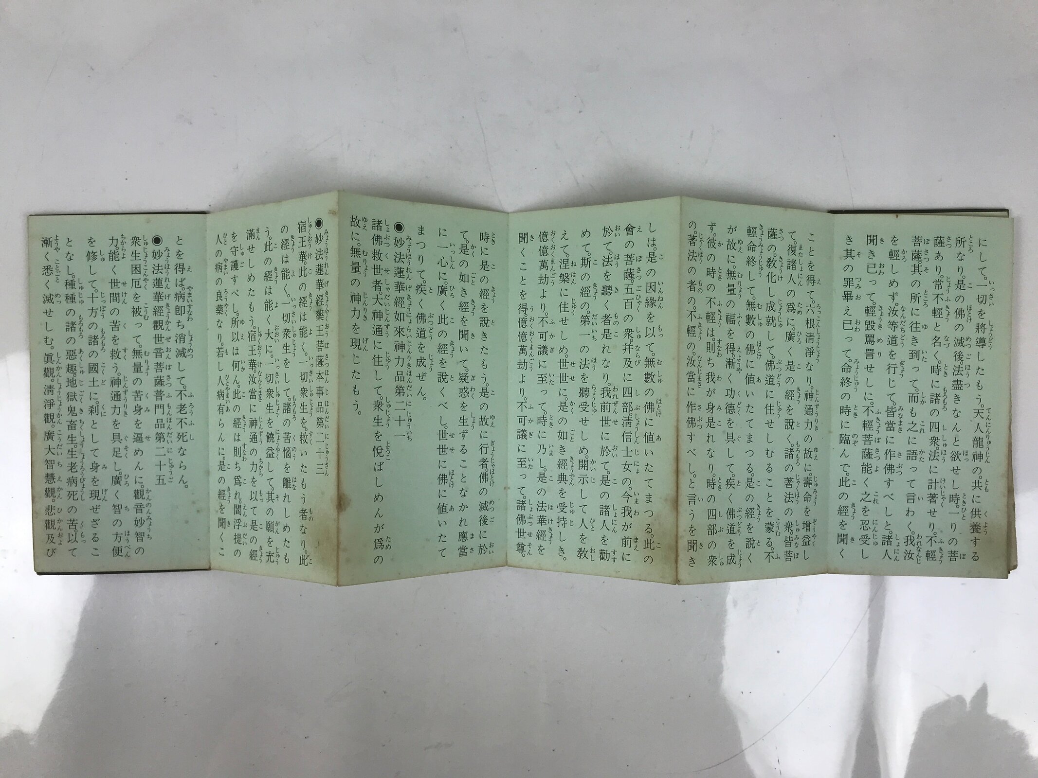 This vintage Japanese Buddhist book called Namu Myoho Renge Kyo (Devotion to the Mystic Dharma of the Lotus Flower Sutra) is an accordion-type book with a green cover. The pages are printed on one side only.