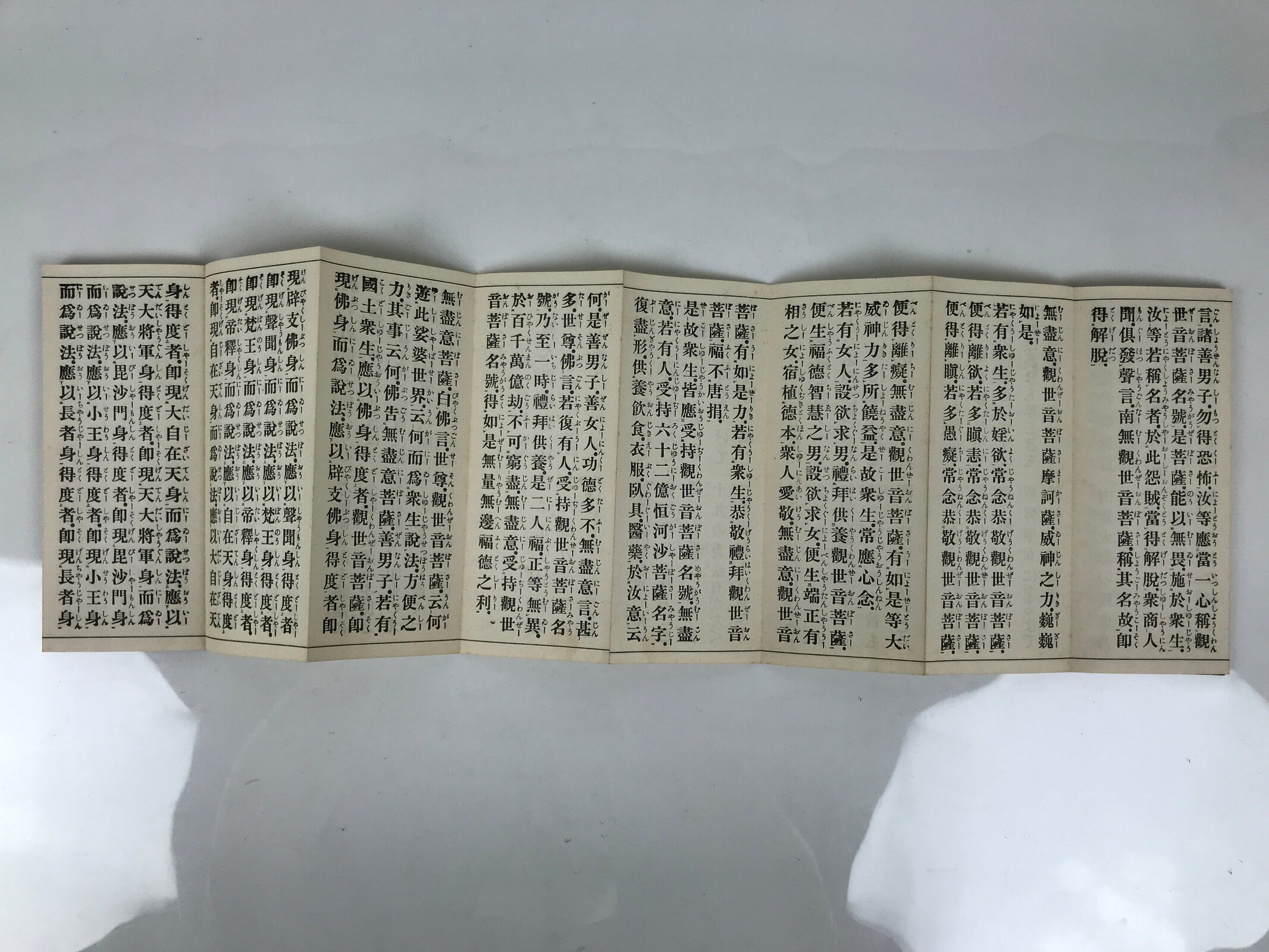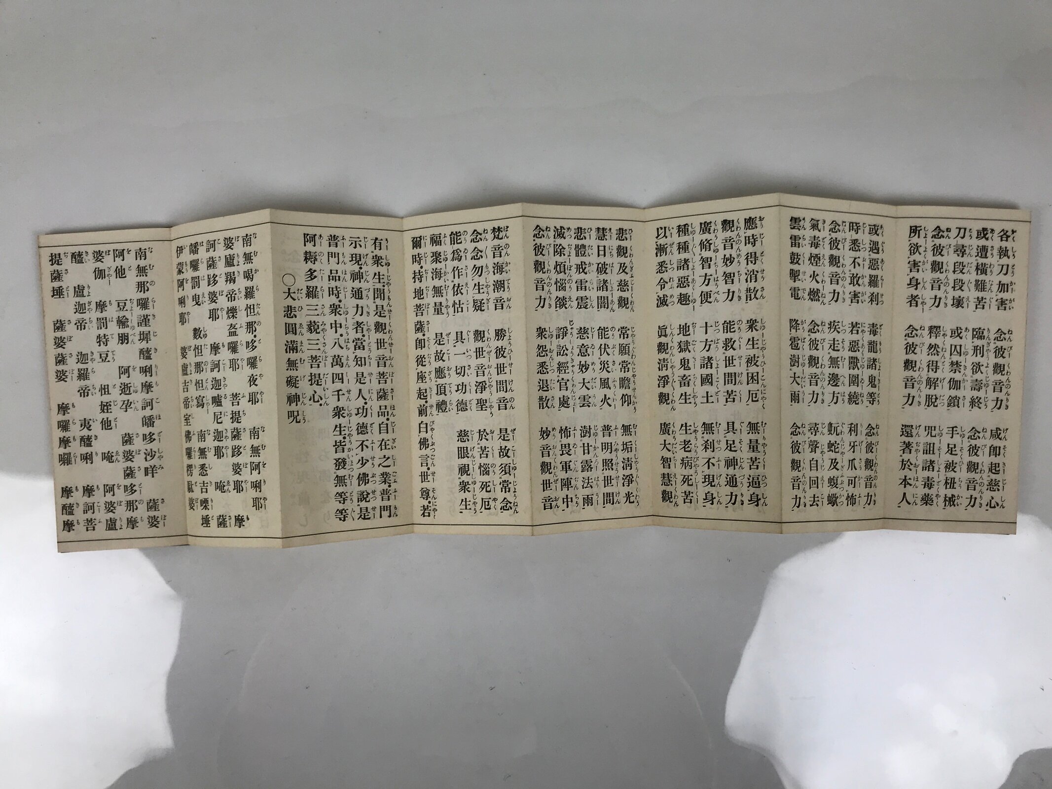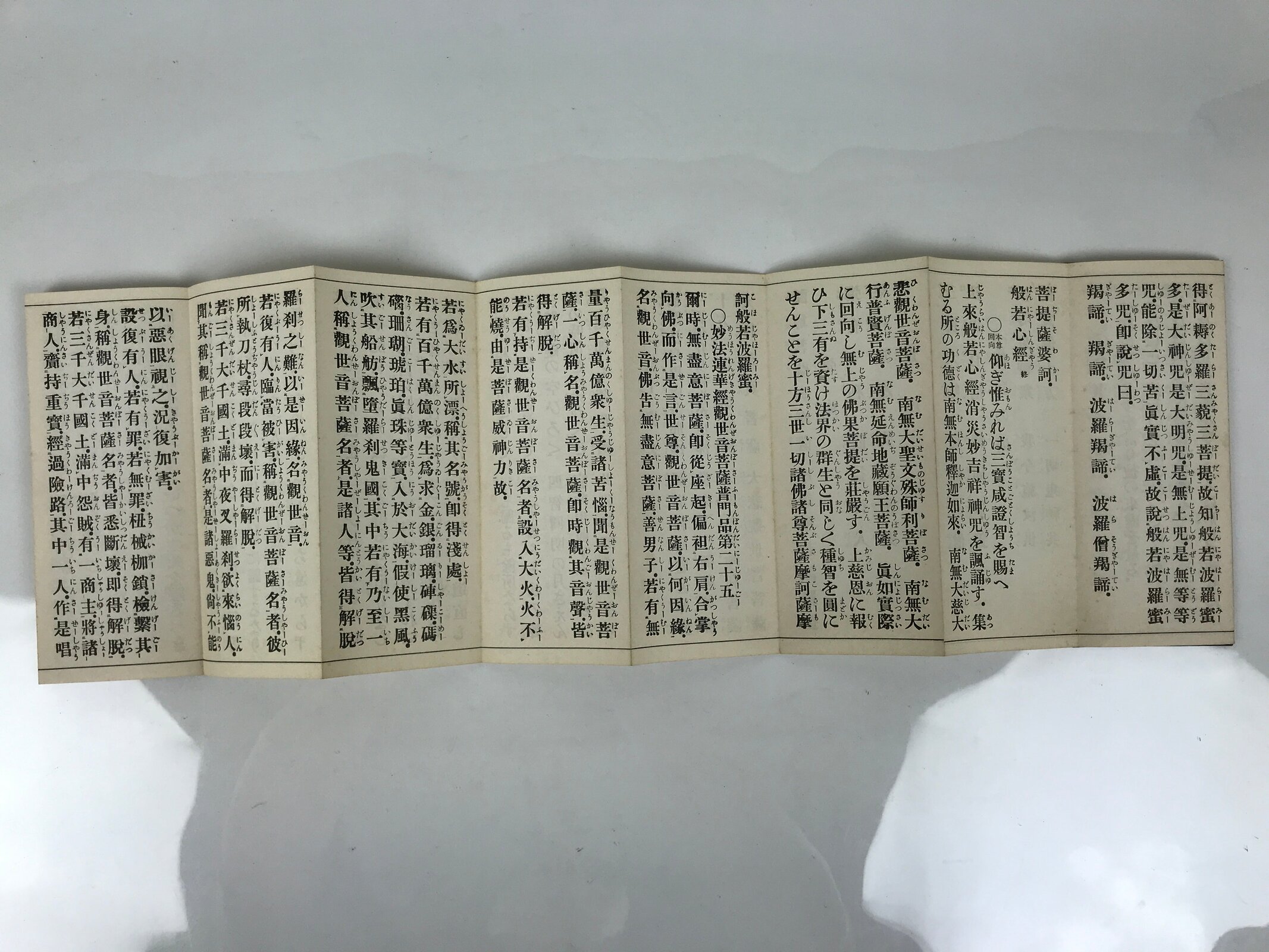 This vintage Japanese Buddhist accordion-style book is called Zenshu Shinto Nikka Yoshu (the necessary scriptures for the daily practice of Zen believers). It contains several Buddhist texts, including the Lotus Sutra (Hokekyo) and the Heart Sutra (Hannya Shingyo). This book is for the Rinzai school of Zen. It has a black cover. The pages are printed on both sides.