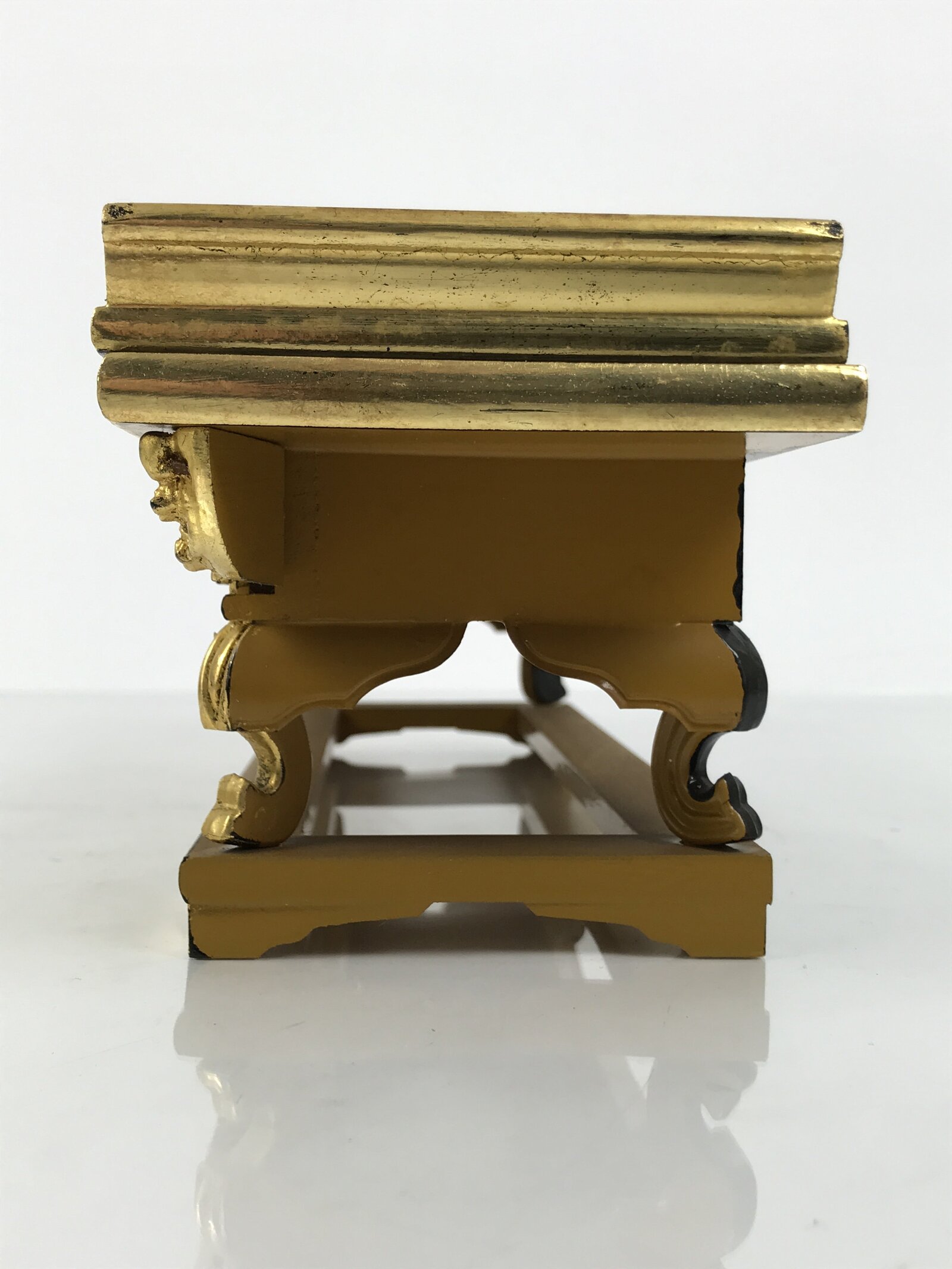 This is a vintage Japanese Buddhist altar offering table (Maejoku). It is wood coated in a glossy black, red, and yellow lacquer with gold-painted accents. On the front side has resin chrysanthemums painted gold. The legs connecting to the base piece are also crafted from resin. It contains a removable, winged top panel with gold on the front edge with red on the top. In the case of memorial services, a piece of cloth called Uchishiki is inserted between the base and top piece.