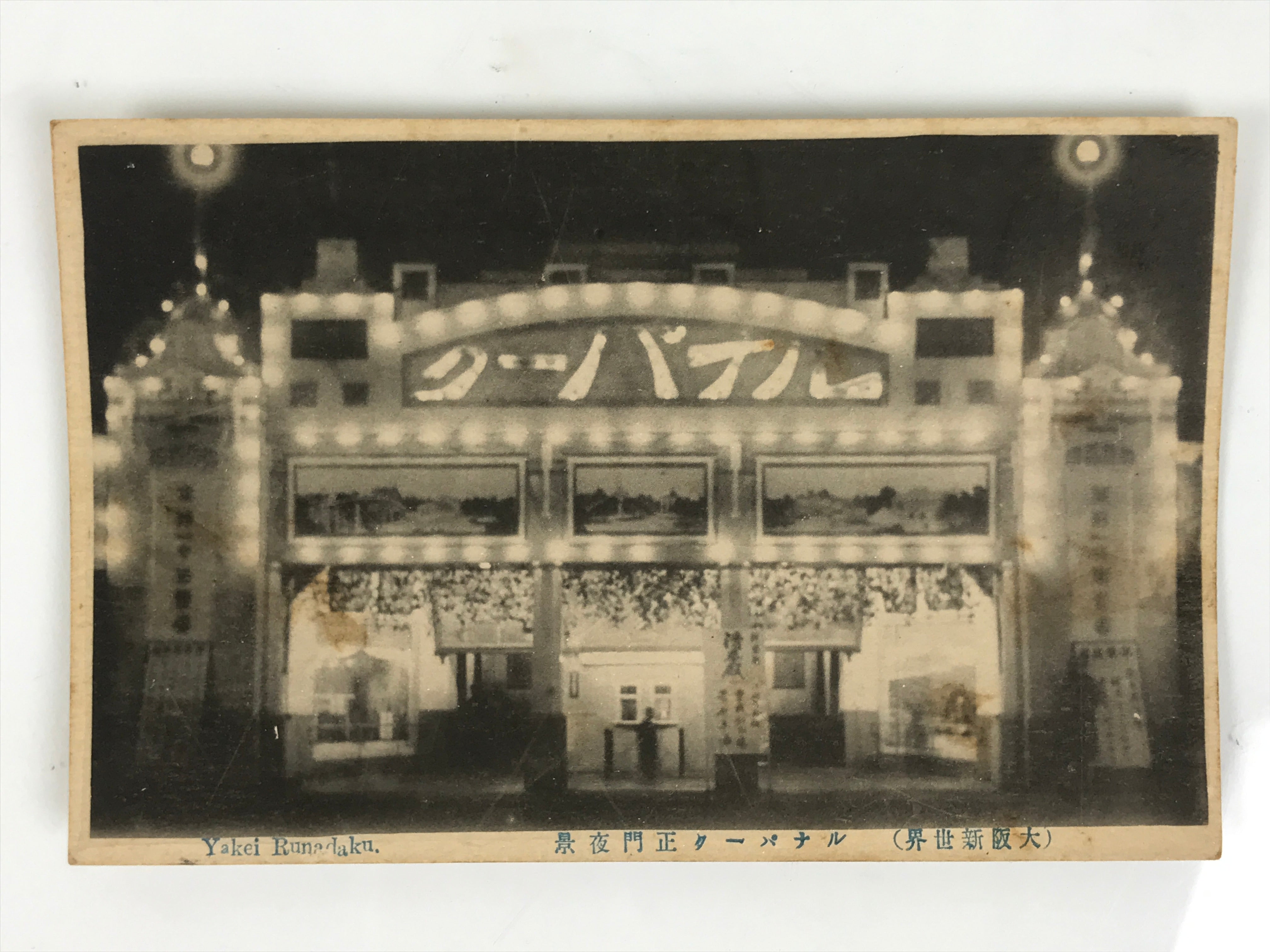 This antique Japanese black-and-white postcard features a night view of the main gate of Runapark, a leisure facility located in Shinsekai, Osaka. The postcard features a caption in Japanese and English.