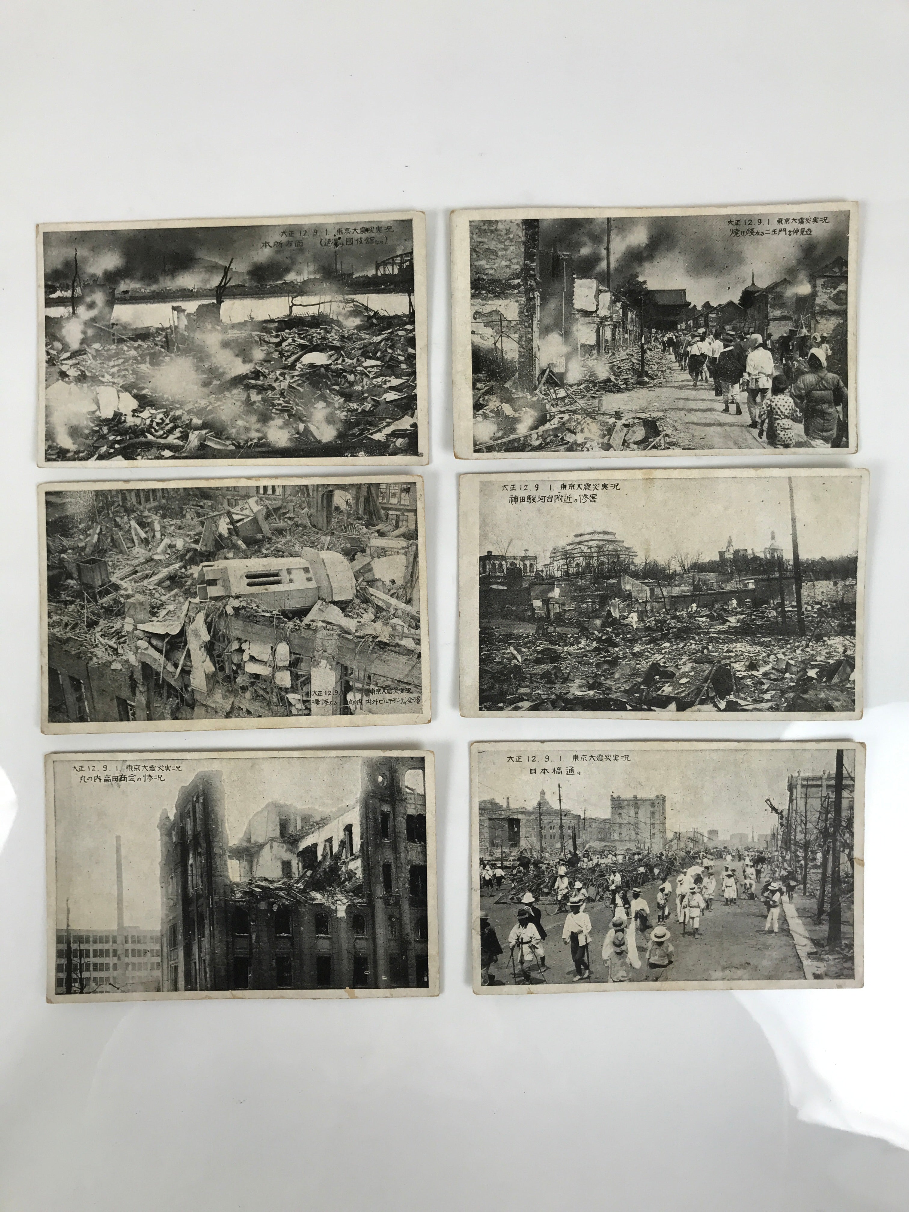 This antique Japanese set of 6 black-and-white postcards features photographs of the Great Kanto Earthquake that occurred on September 1923. Destroyed buildings and people can be seen. Each postcard features a caption in English with the date and the location.