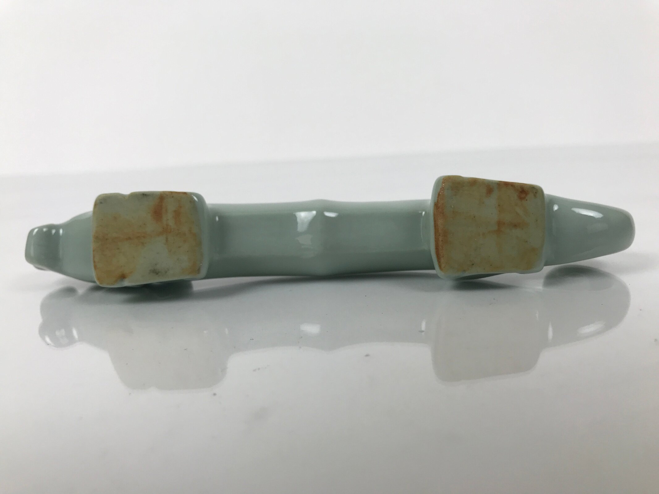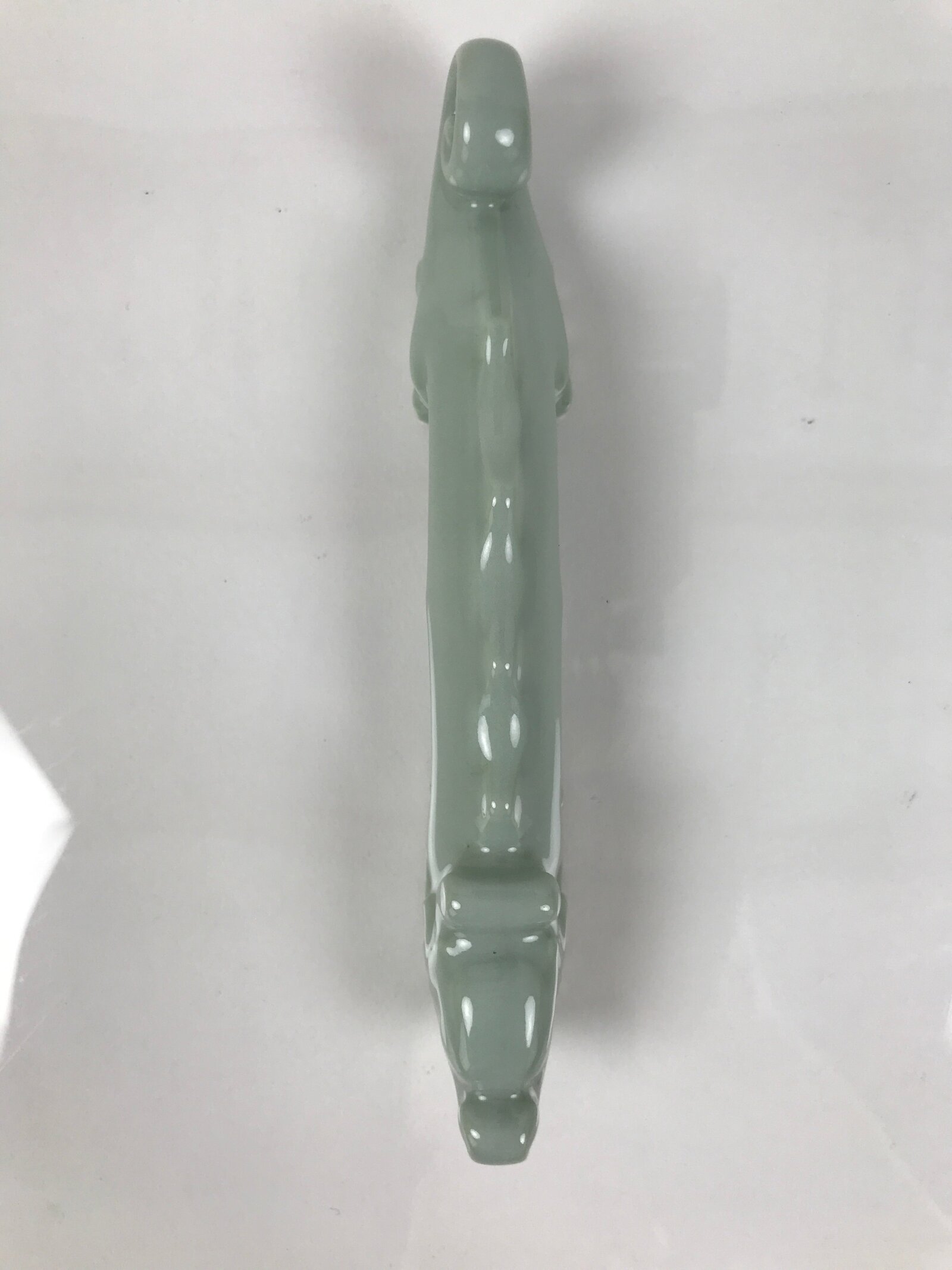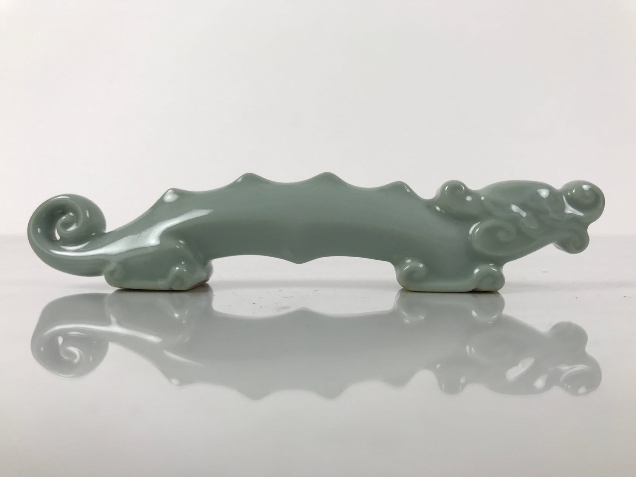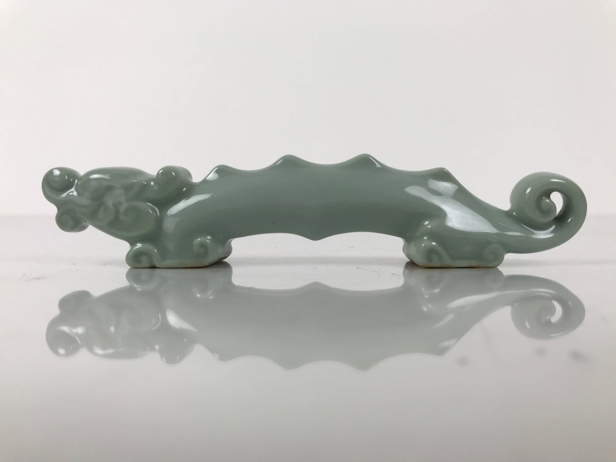 This is a vintage Japanese porcelain stand for calligraphy brushes (shuji fude). This stand features the celadon glaze and dragon shape. Fudeoki or brush stand is used to temporarily rest brushes and prevent them from getting damaged or dirty.