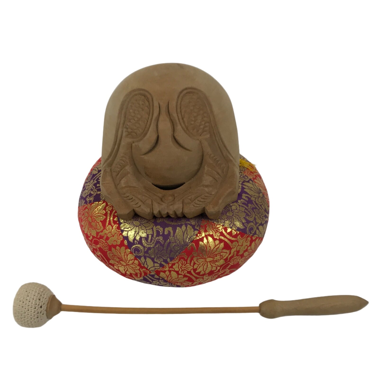 This set comes with the drum itself, a beautifully carved and hollowed piece of wood, a pillow decorated with red, purple, and gold silk fabric and a tassel, and a large striker with a knitted string head.
