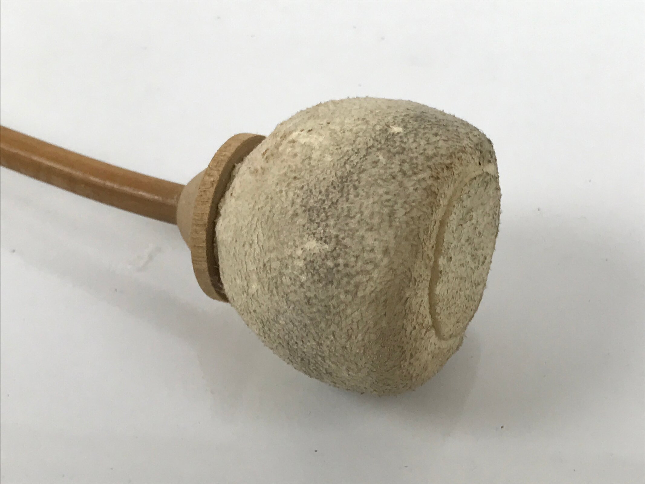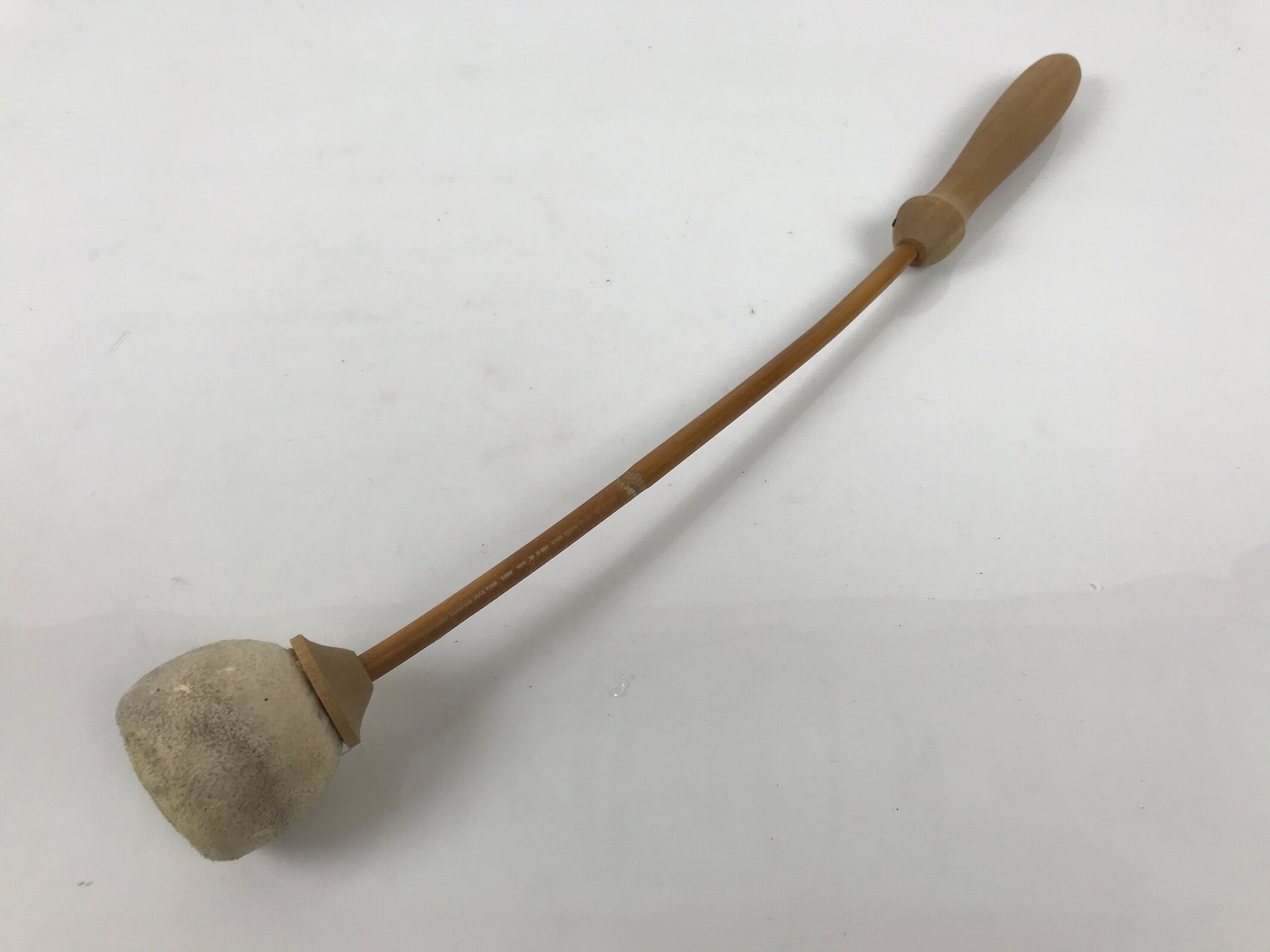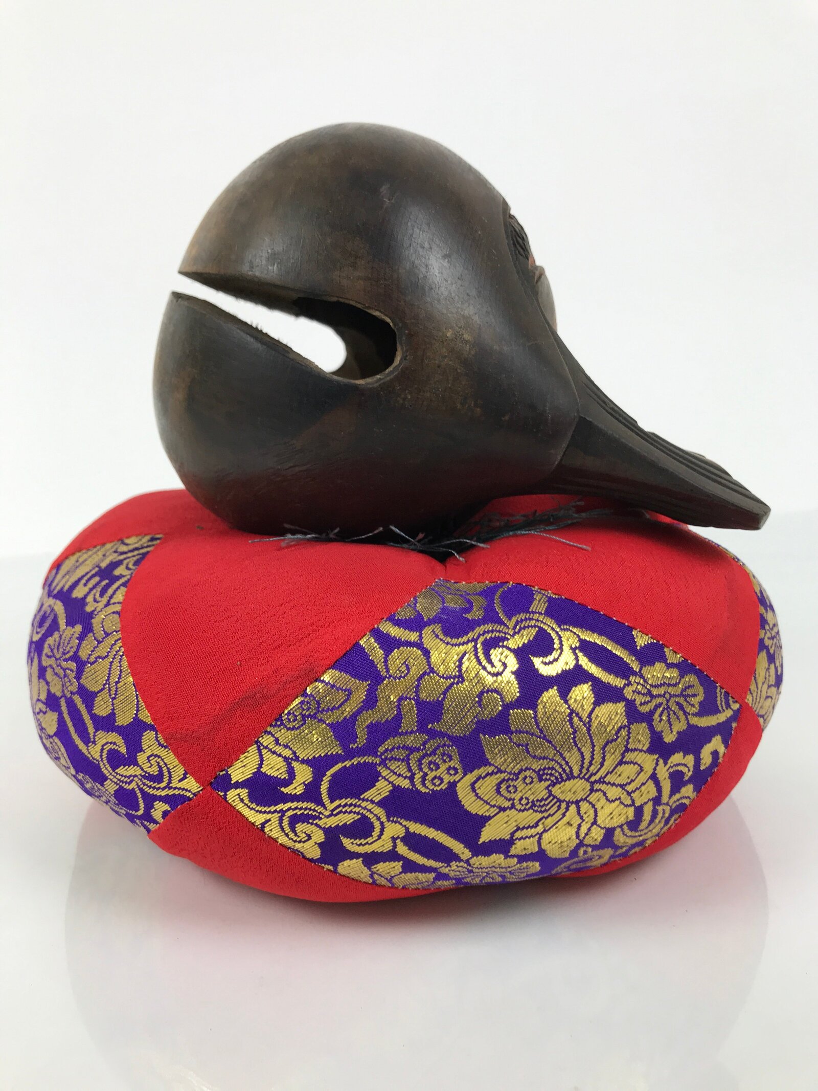 This set comes with the drum itself, a beautifully carved and hollowed piece of wood, a pillow decorated with red, purple, and gold silk fabric and a tassel, and a large striker with an animal skin suede head.