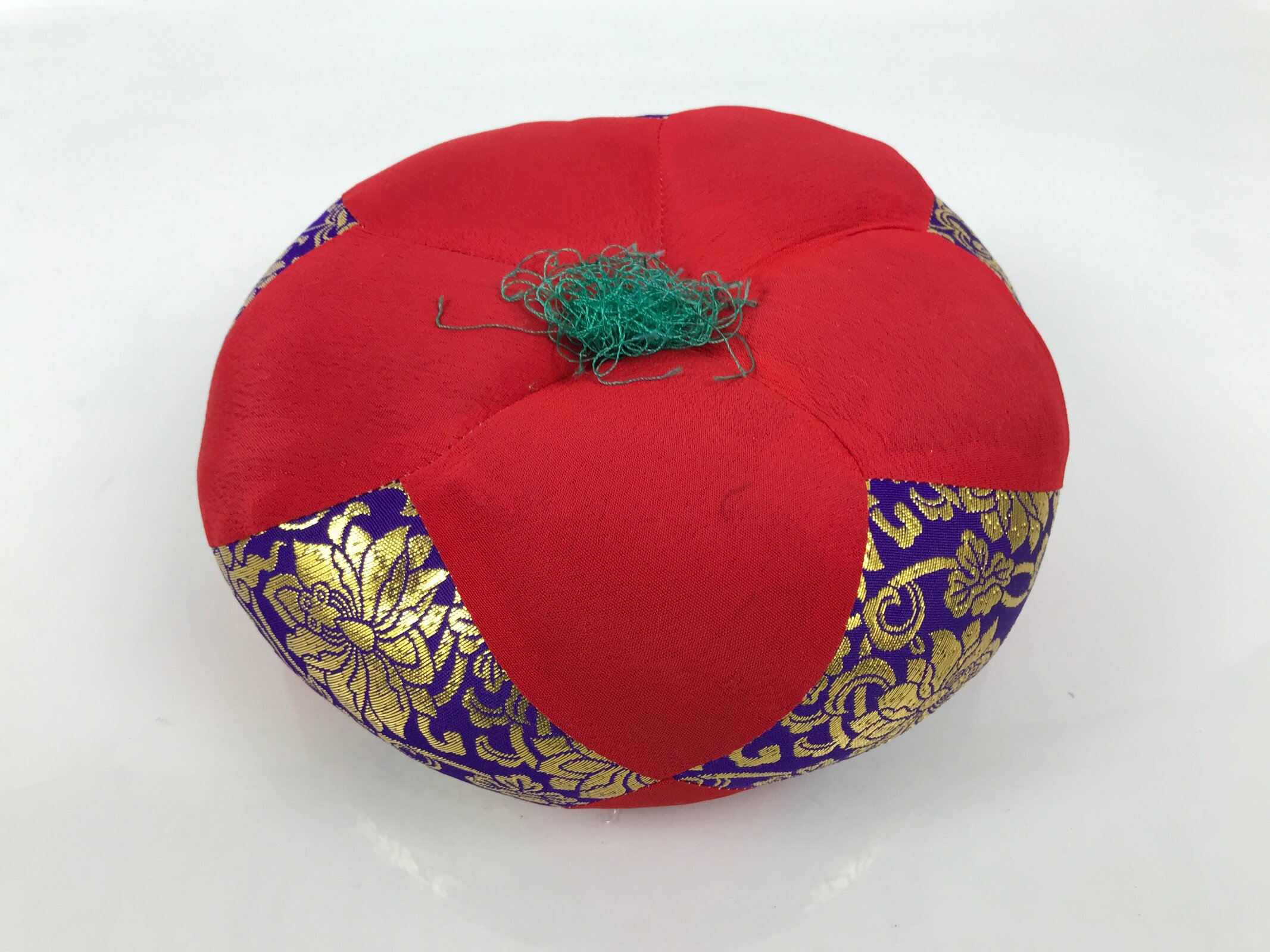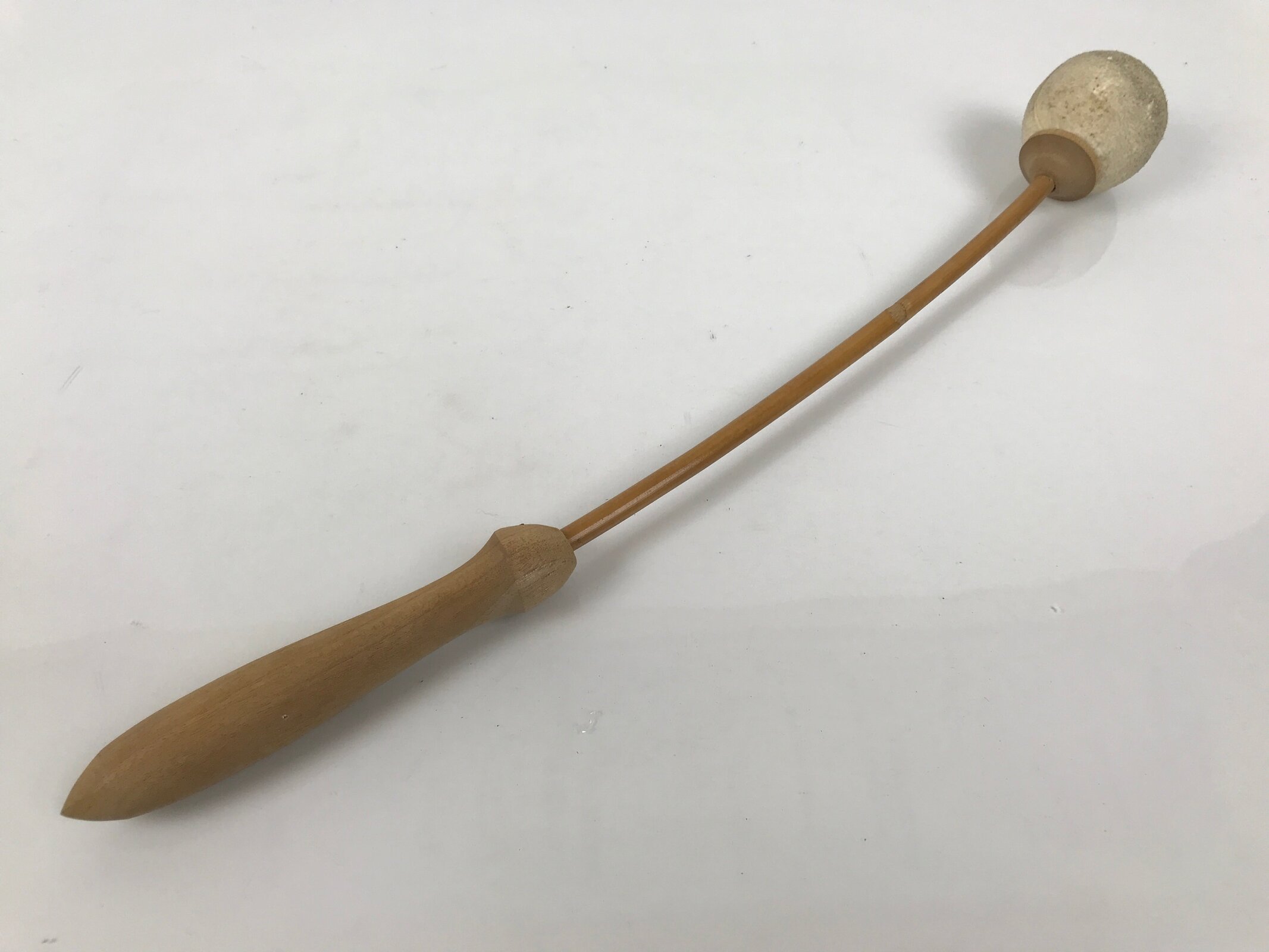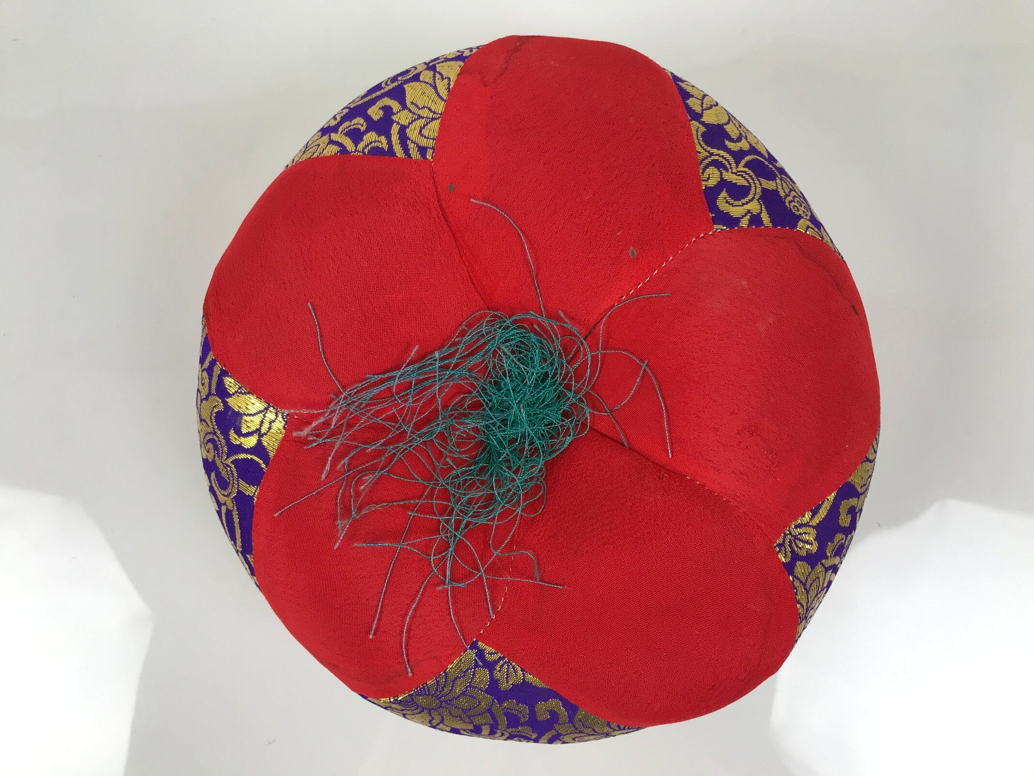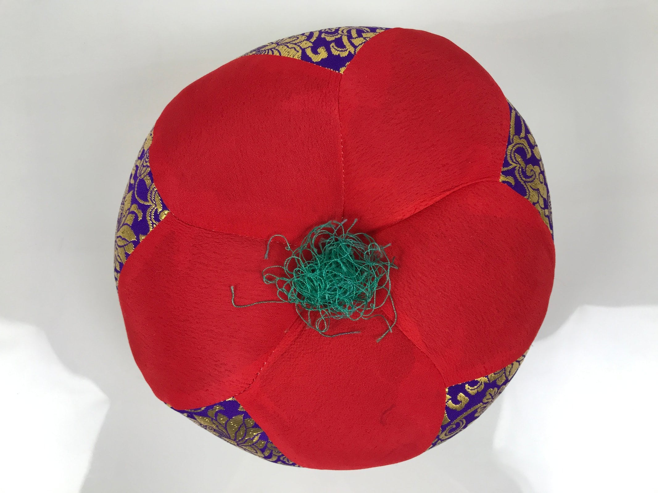 This set comes with the drum itself, a beautifully carved and hollowed piece of wood, a pillow decorated with red, purple, and gold silk fabric and a tassel, and a large striker with an animal skin suede head.