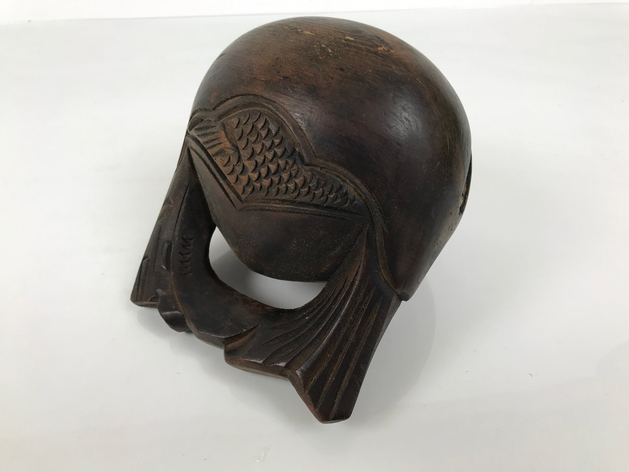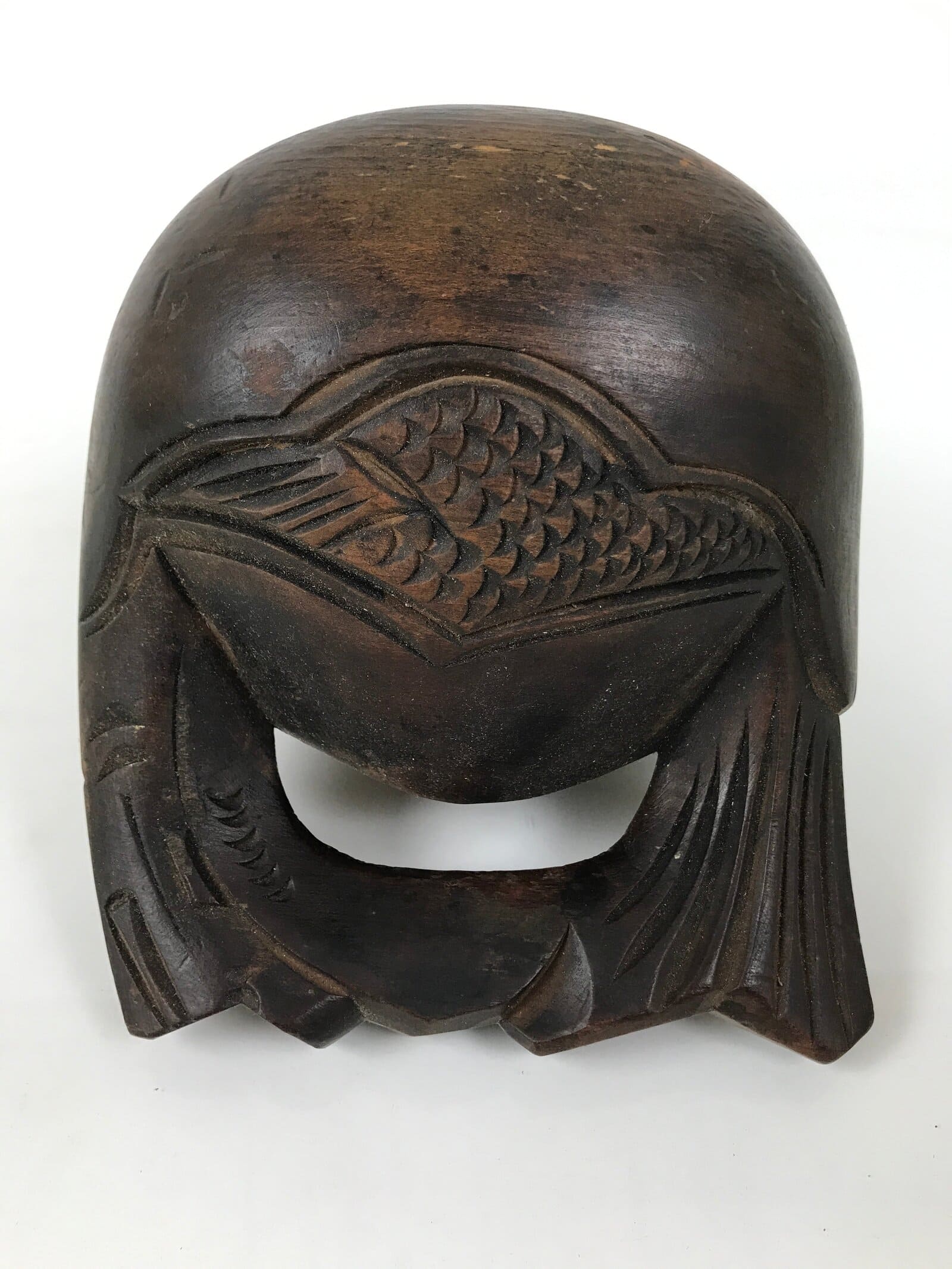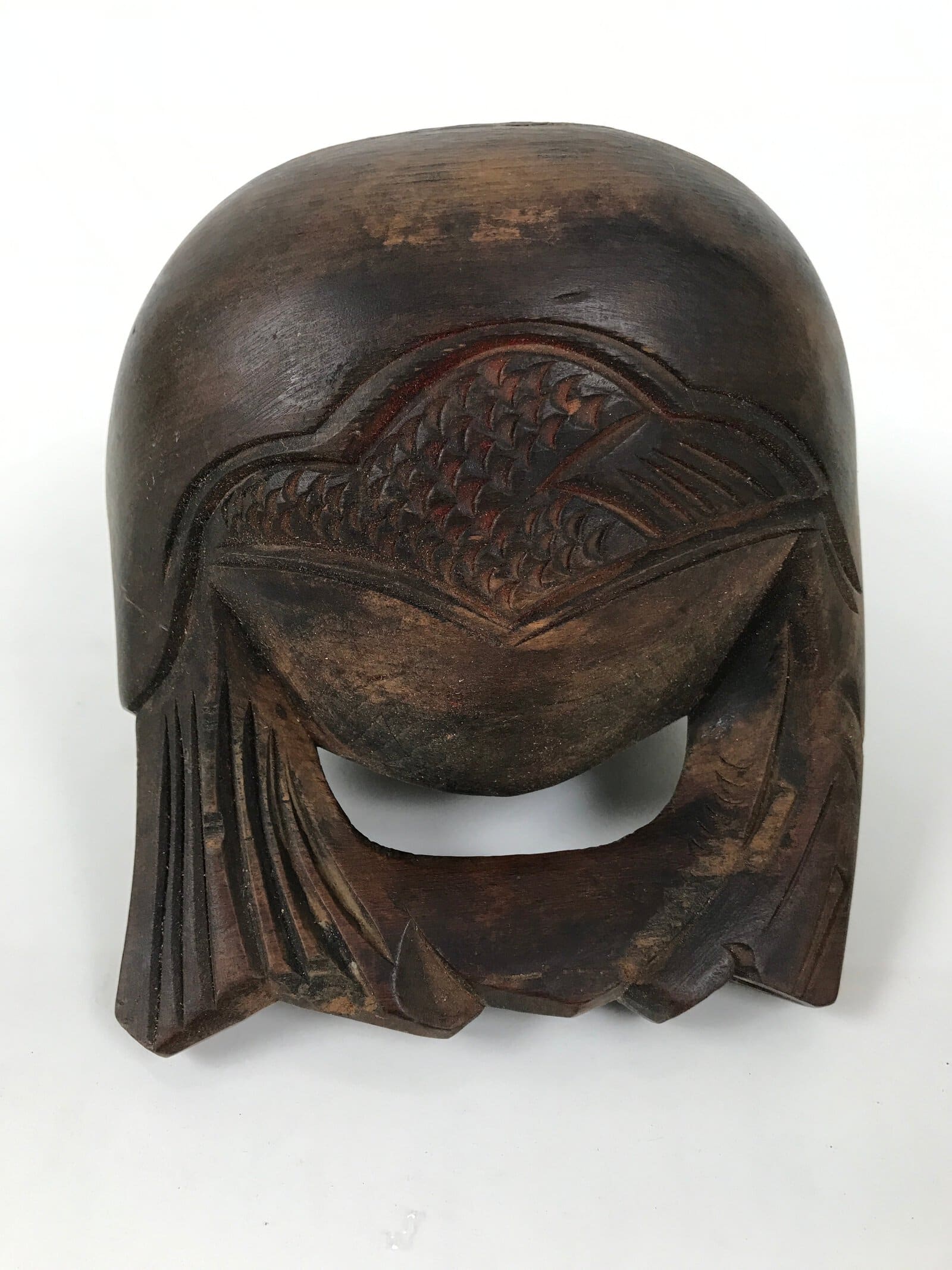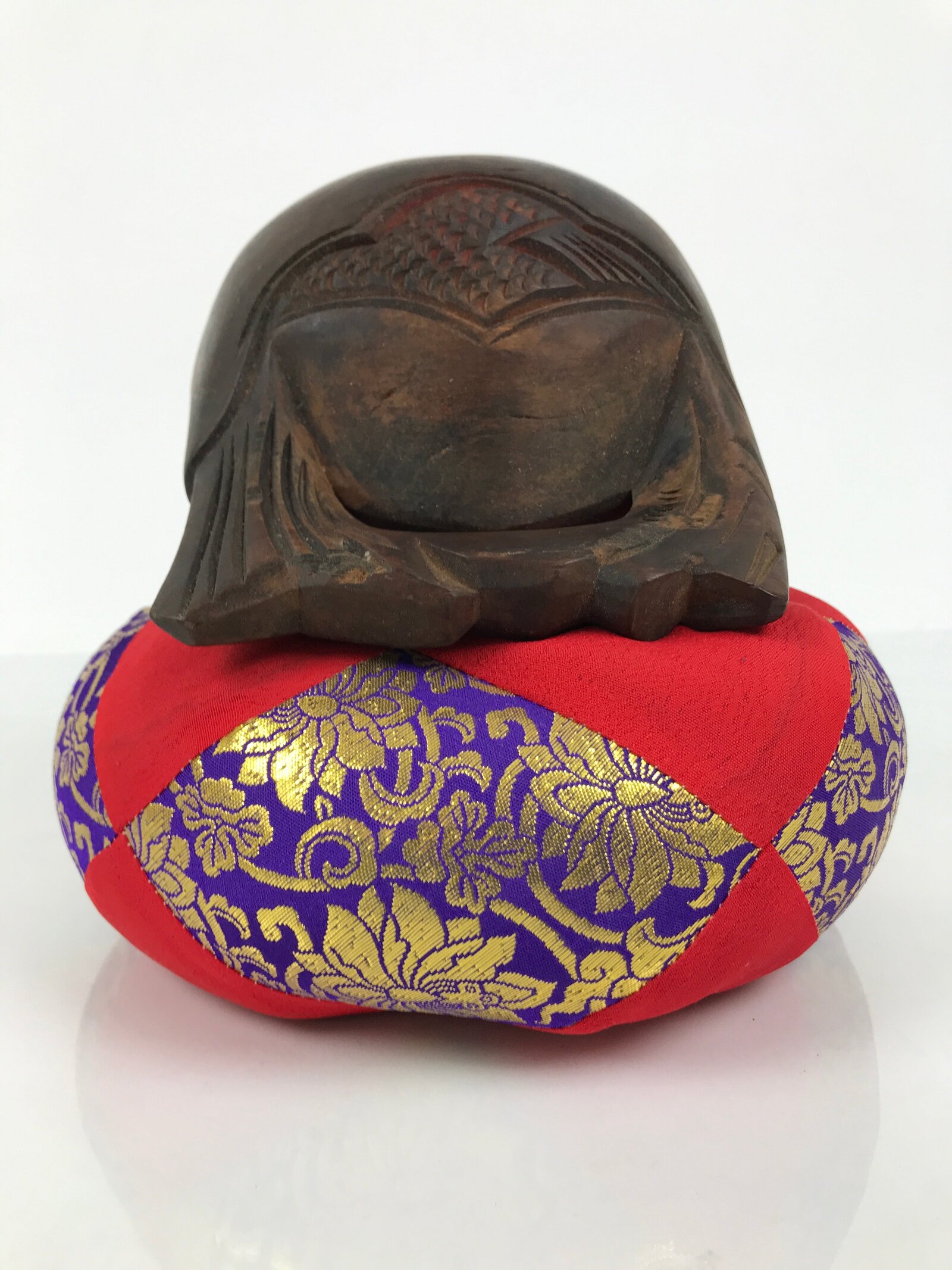 This is a vintage Japanese Buddhist altar fitting, Mokugyo (a fish-shaped wooden drum). Mokugyo is intended to keep the rhythm of sutra chanting by beating and sounding. It also helps to awaken people in sutra chanting. It is used in the Zen sect, Tendai sect, and Jodo sect. It can be used at home in front of a butsudan as well.