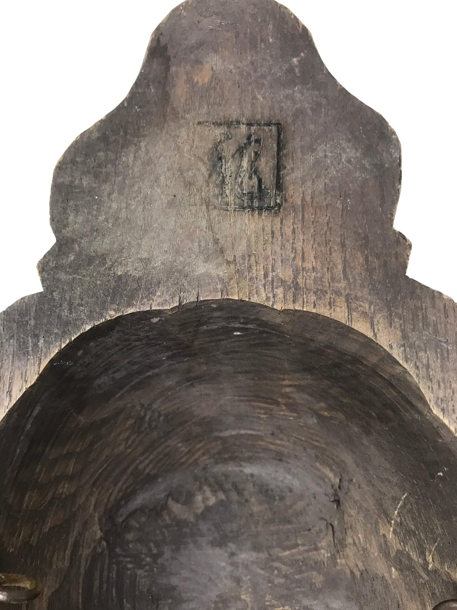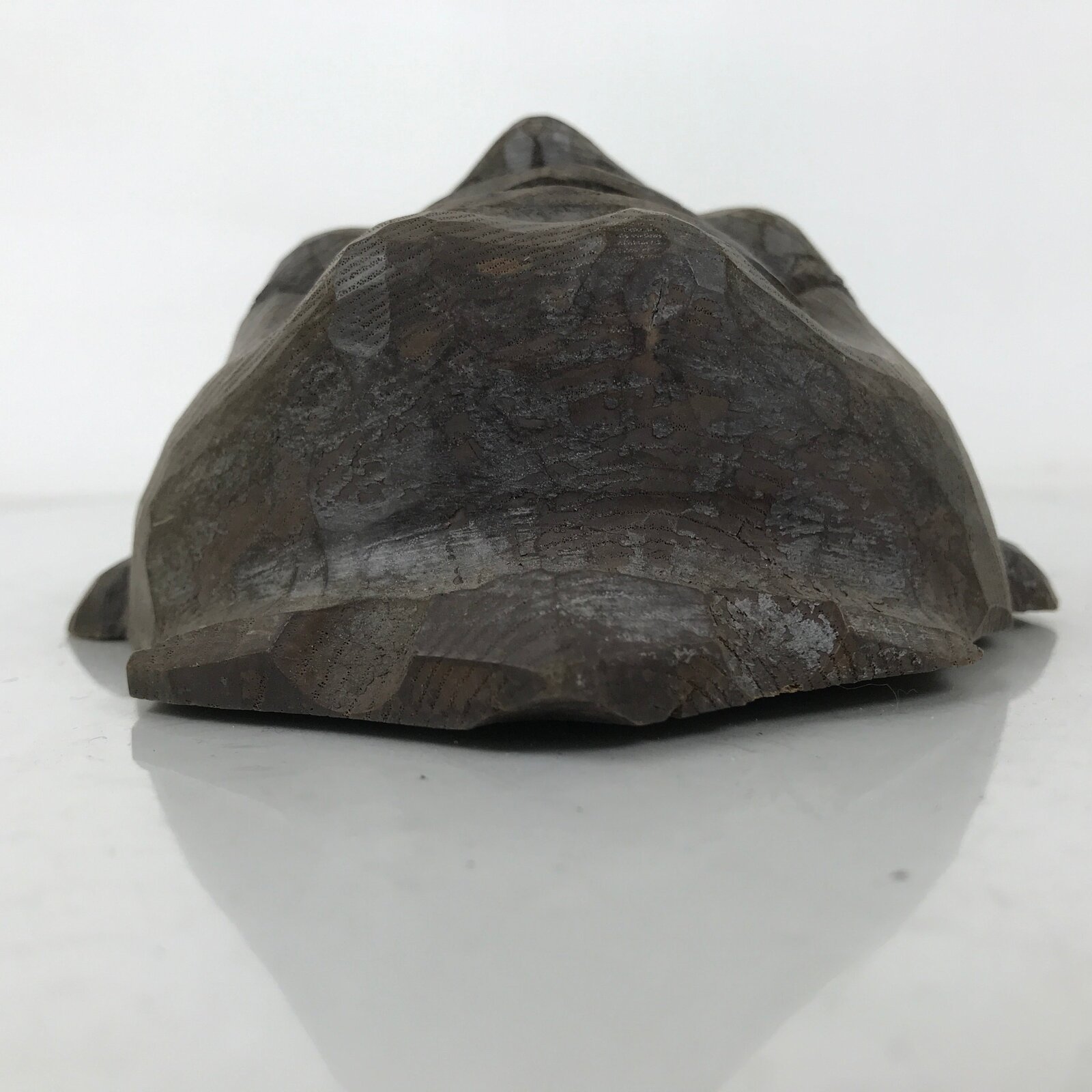This is a Japanese hand-carved wooden mask of one of the Nio guardians, Agyou. It is stained with a matte dark brown finish and has two metal loops on the inside back to attack hanging string or wire.