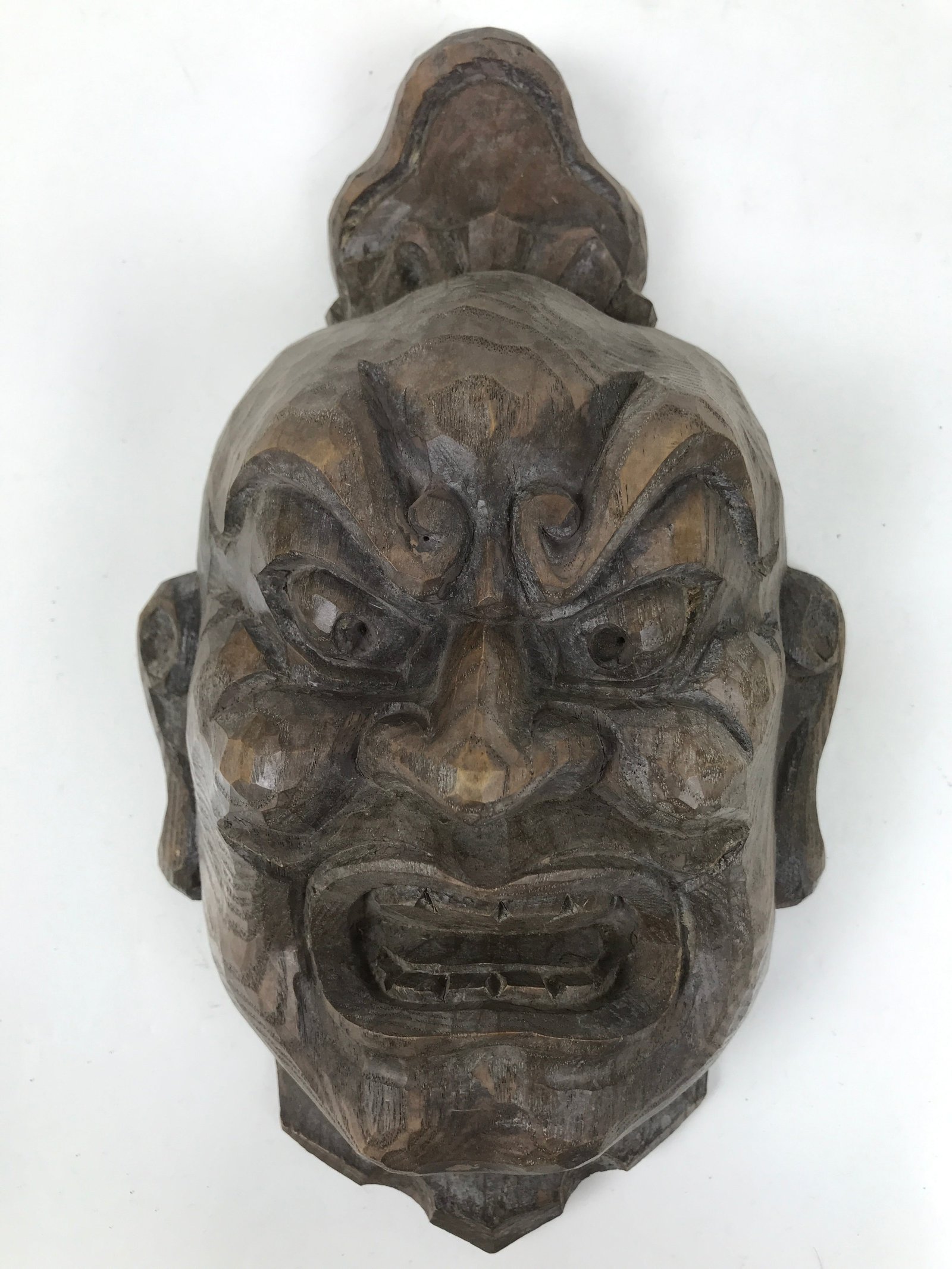 Often seen at the gates of prominent Buddhist temples across Japan, the Nio Pair or Nio Kings embody physical force to keep evil and discord from entering. This mask is of Agyou, the open-mouthed guardian. Most notably, one of the most famous statues of Agyou can be found at the South Gate of Todaiji Temple in Nara.