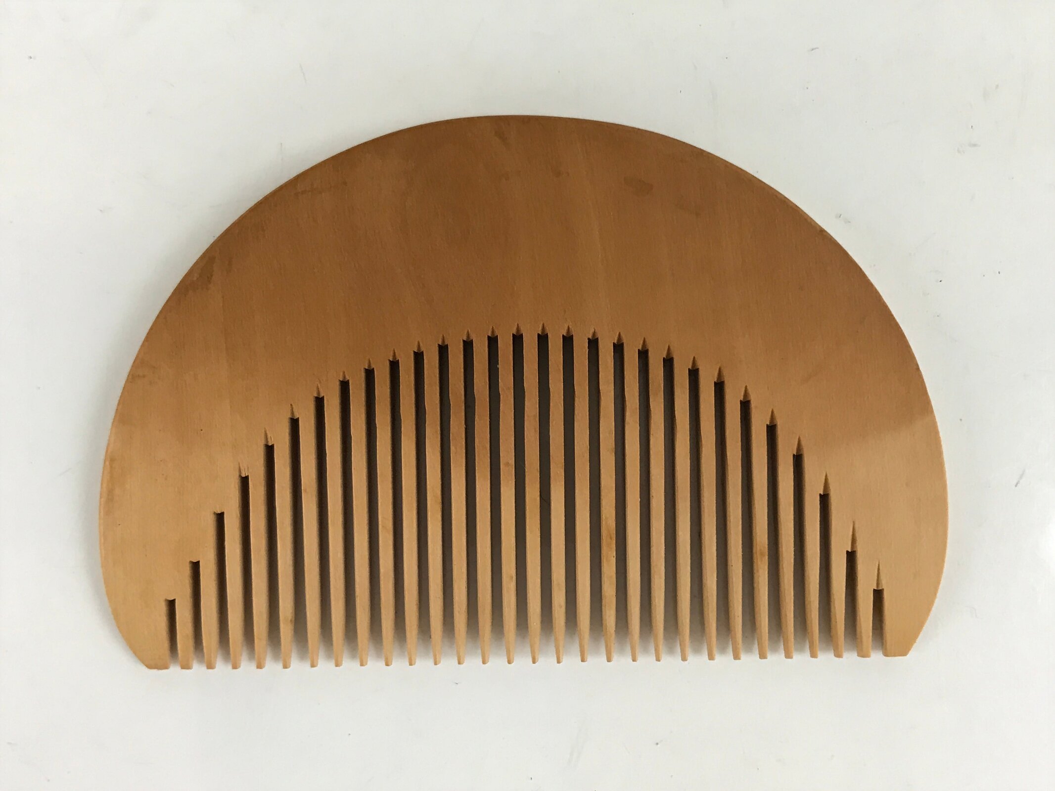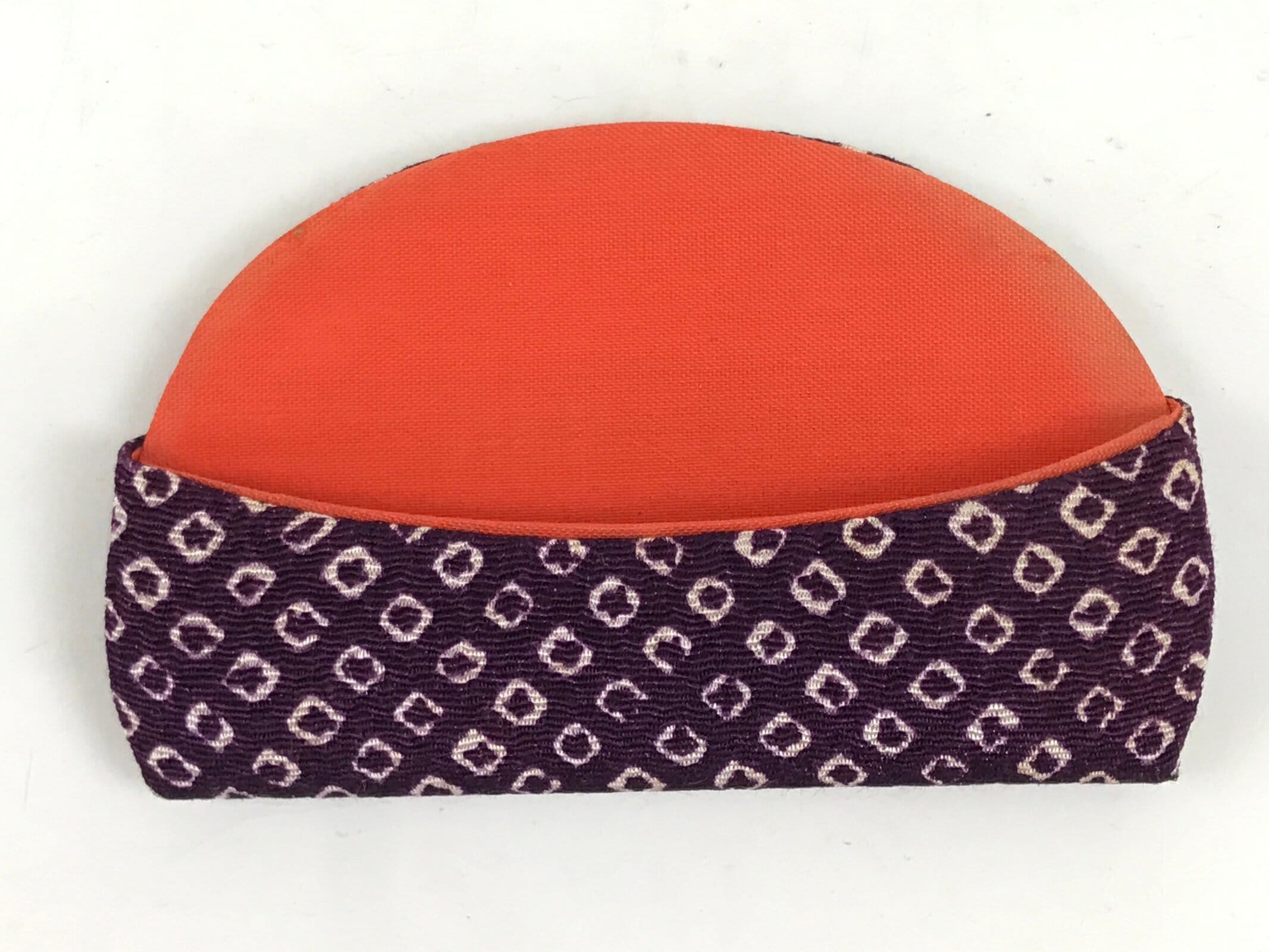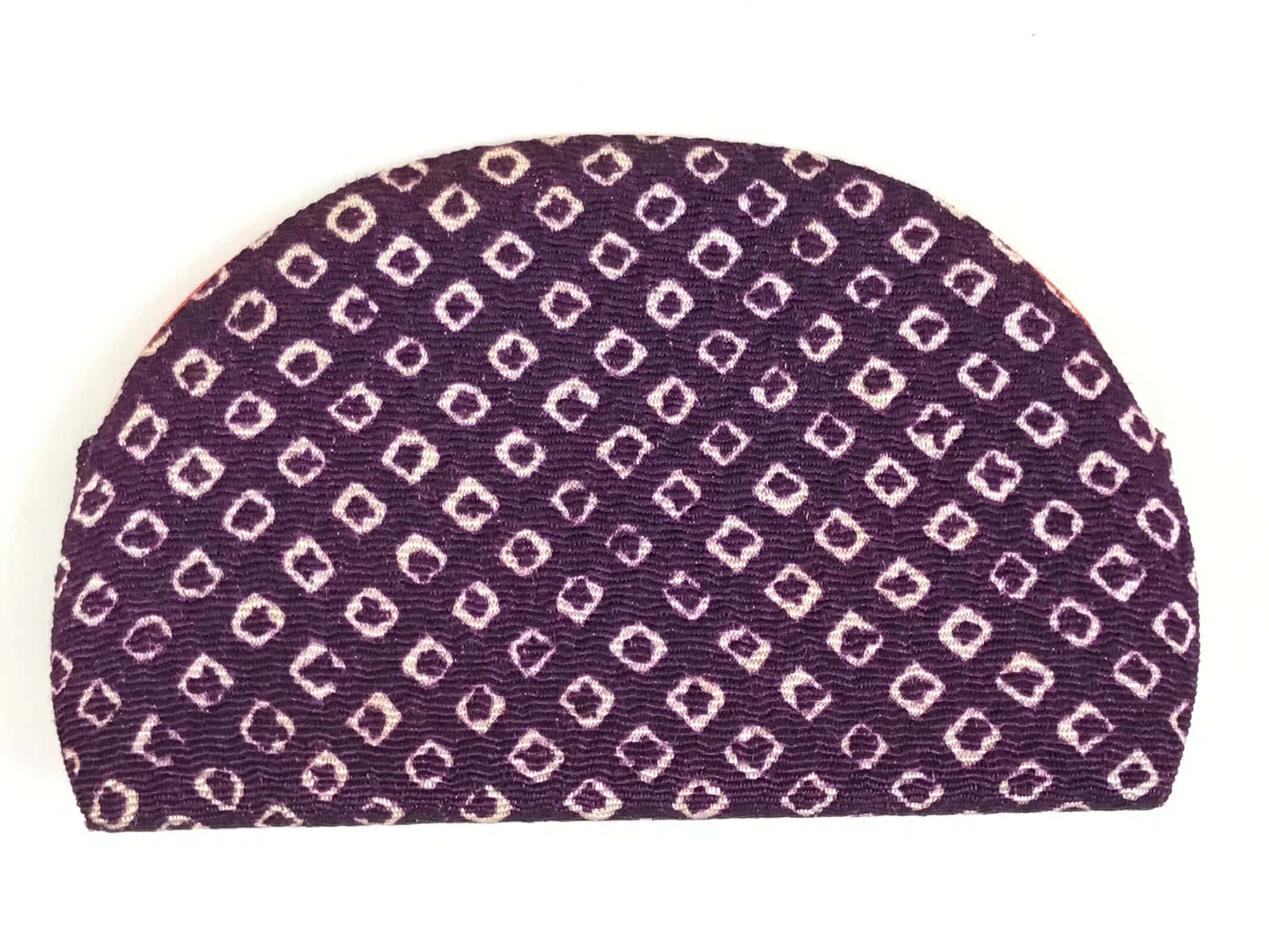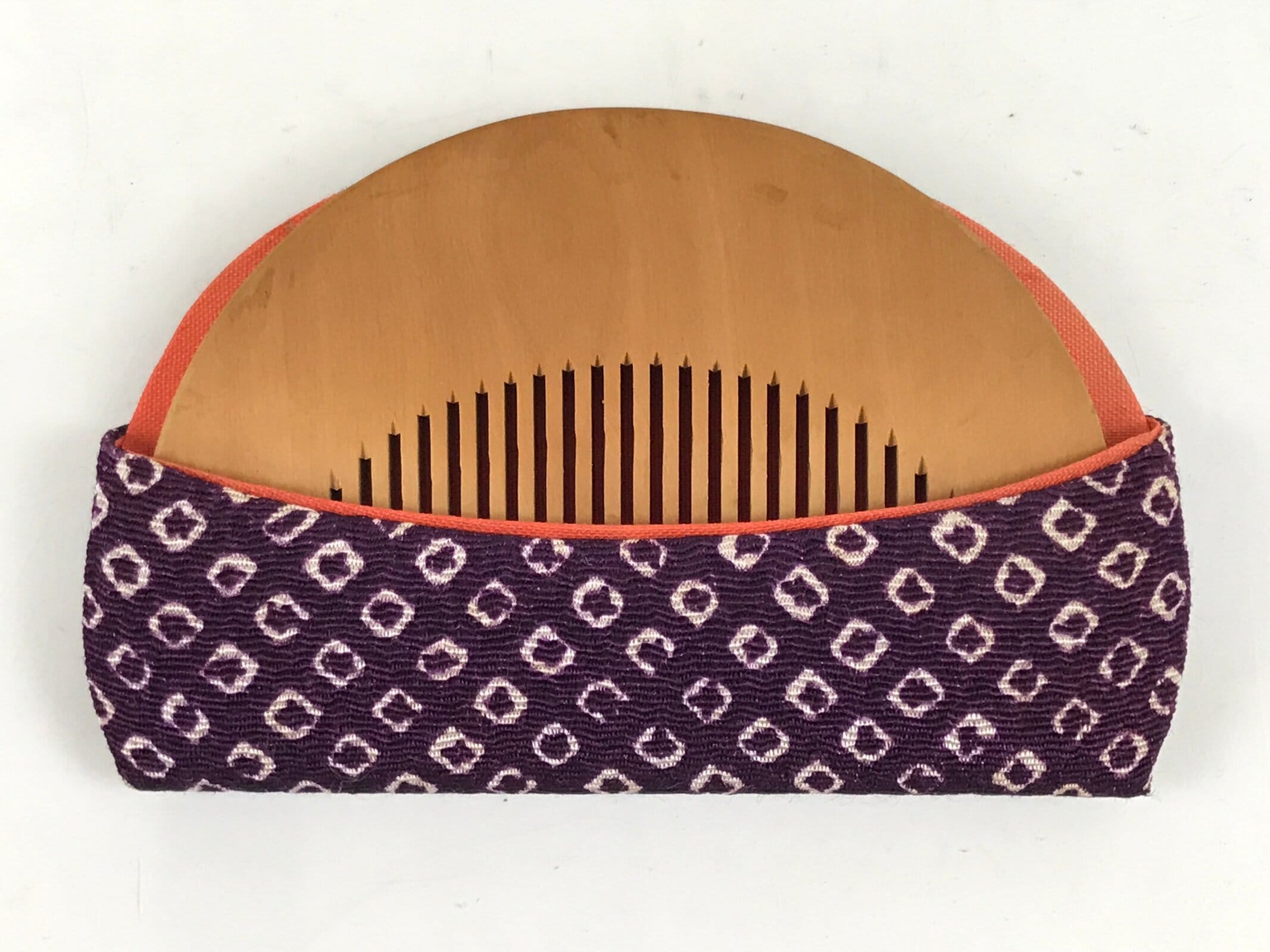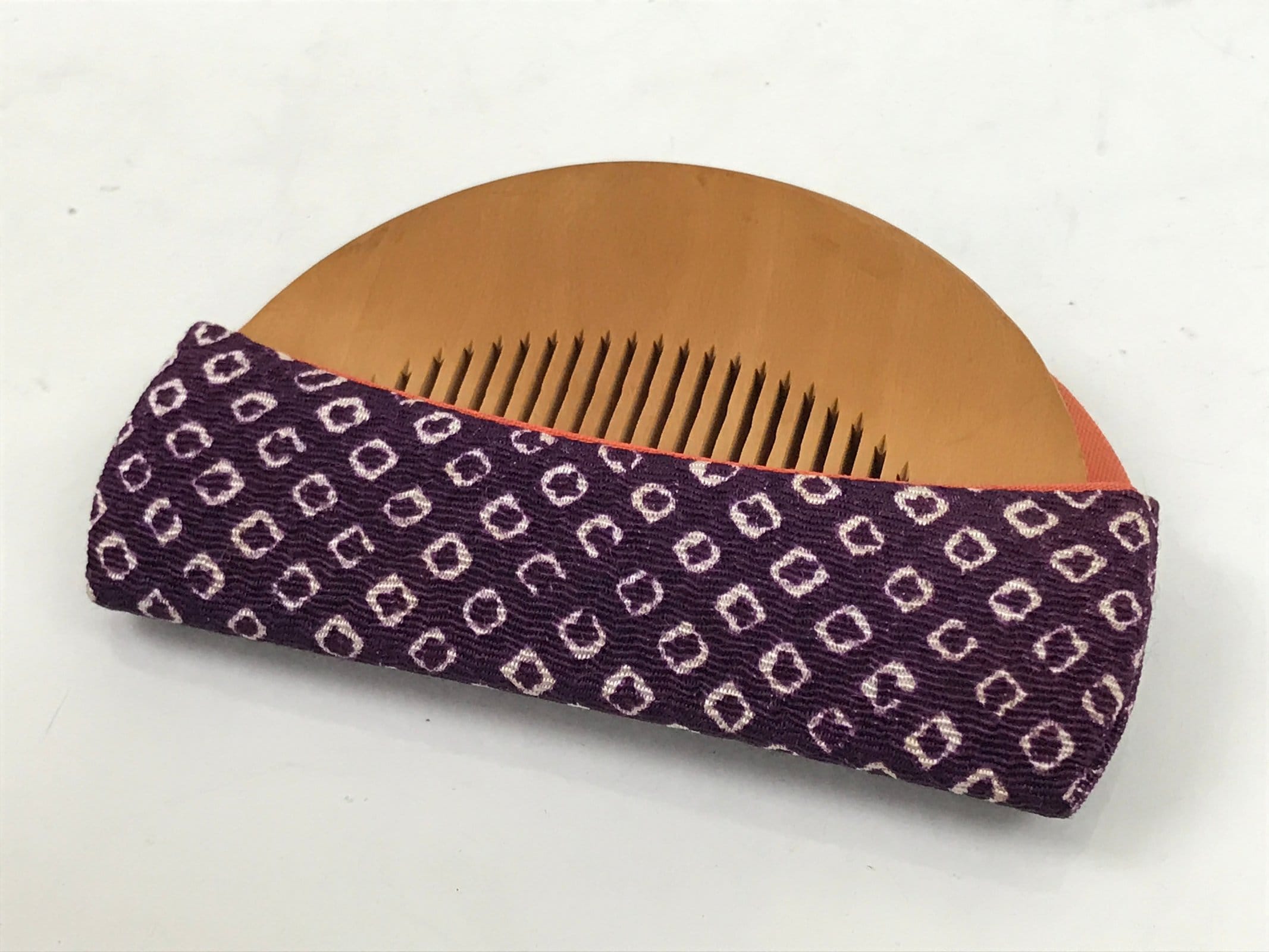 This is a vintage Japanese hair comb called tsuge or tsugegushi. It is carved traditionally of boxwood (but not exclusively) and is used for combing, but also cleansing one’s hair. The comb is meant to increase circulation in the scalp, reduce frizz, and distribute natural oils evenly. It is often suggested to season the comb with your oil of choice. It comes in a beautiful case made of chirimen silk and is purple with a traditional kanoko pattern (which resembles the spotted pattern on a fawn) on the outside and a simple plain silk on the inside.