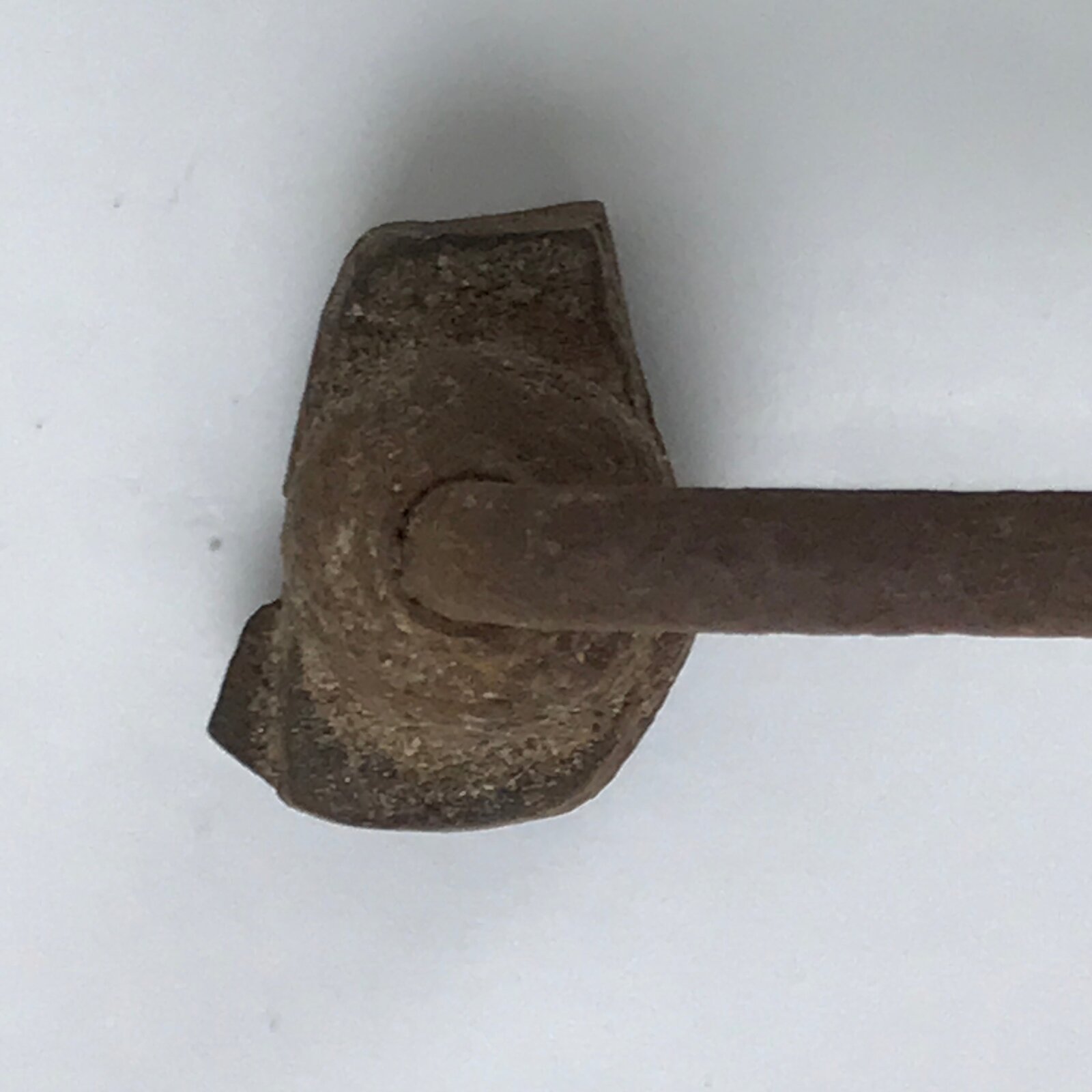 This is a vintage cast iron branding stamp called yaki-in. This piece is meant to be placed over fire or coals and is used to mark wood, leather, fabrics, and, most famously, Japanese sweets such as manju. It has the simple image of a broom and a rake.