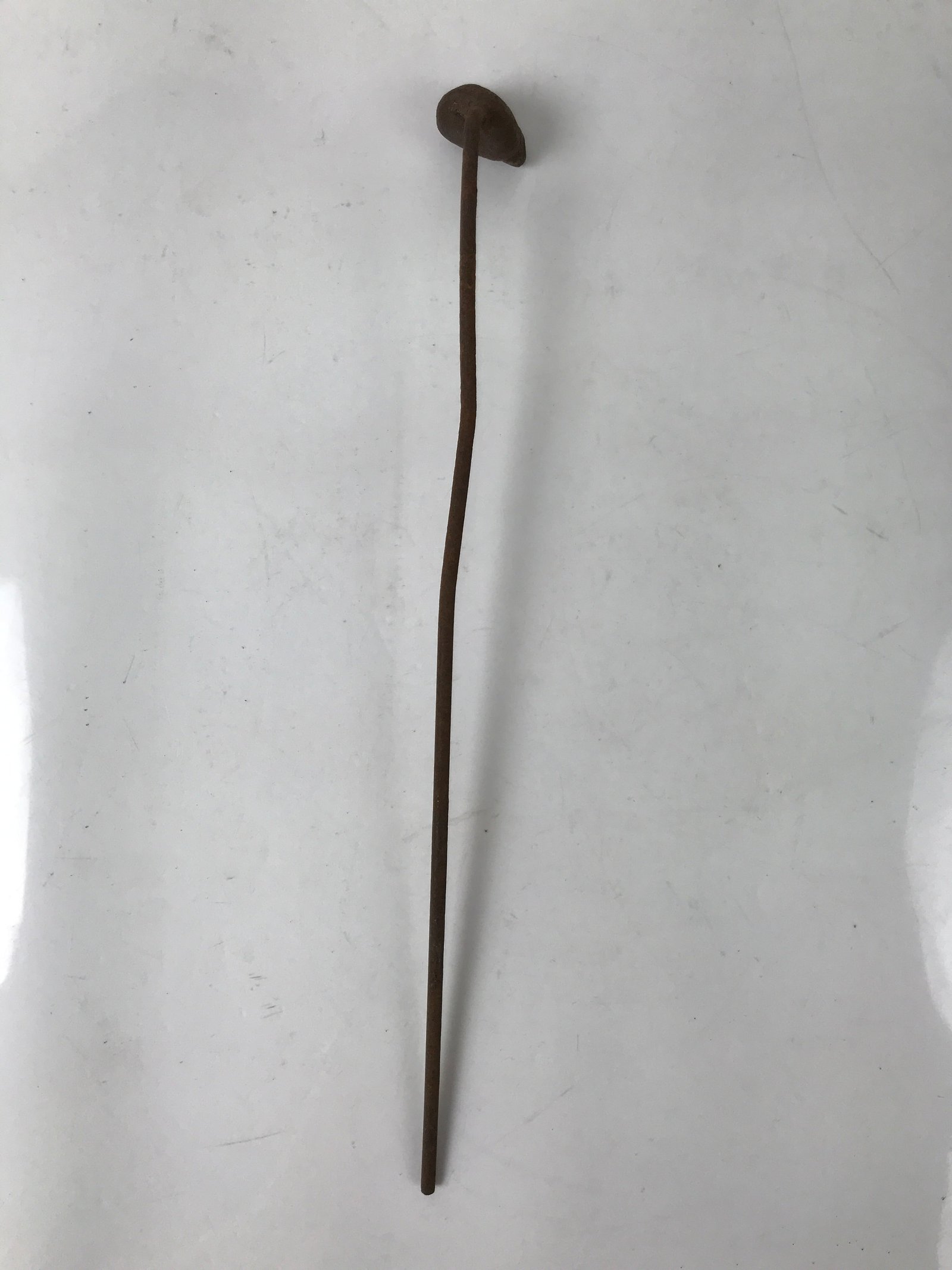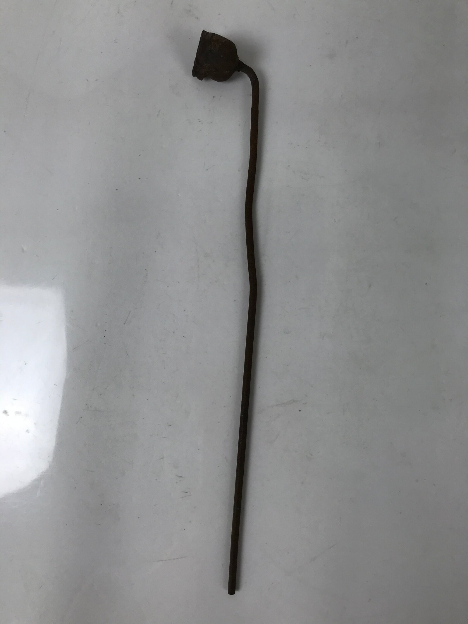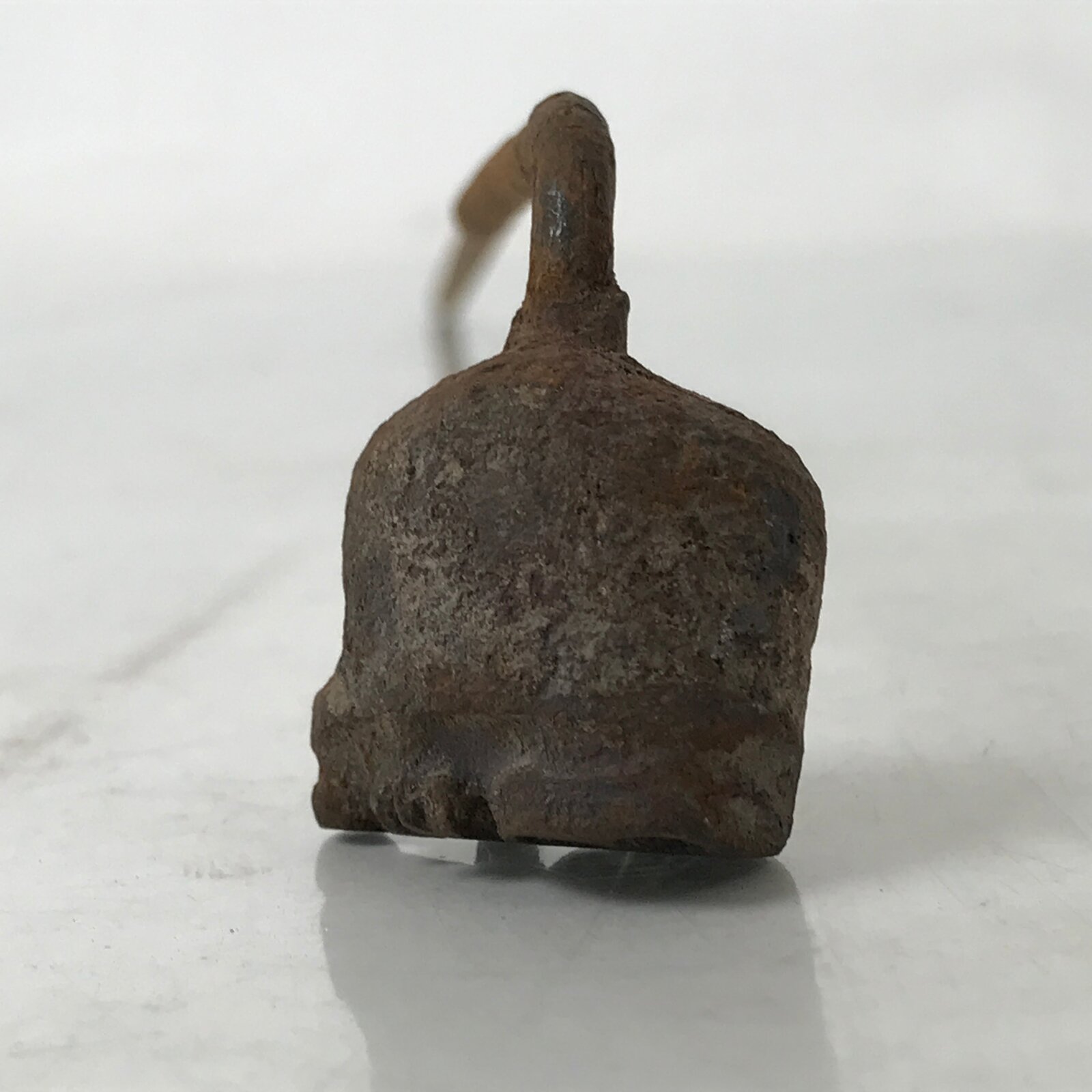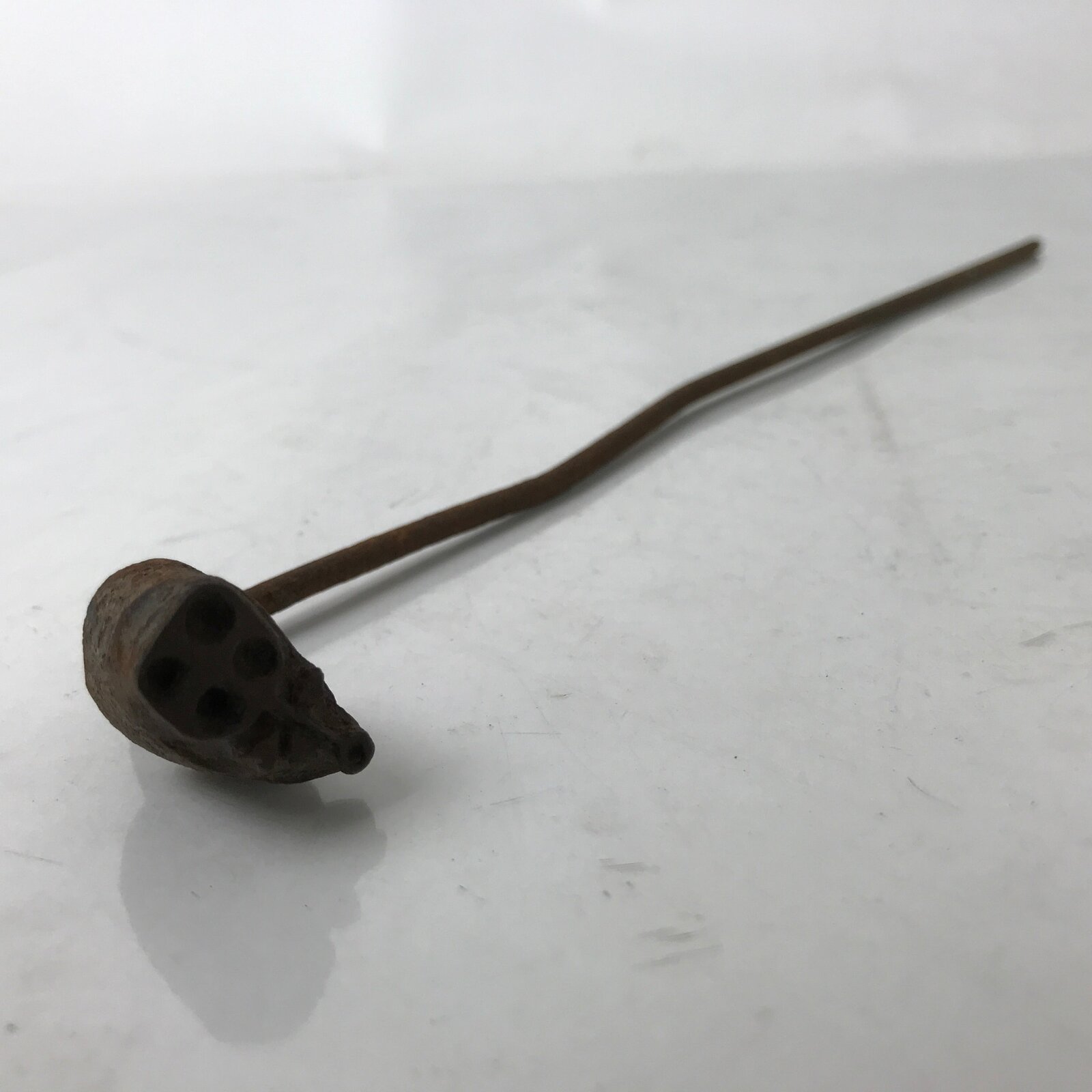 This is a vintage cast iron branding stamp called yaki-in. This piece is meant to be placed over fire or coals and is used to mark wood, leather, fabrics, and most famously traditional Japanese sweets and snacks such as manju, dorayaki, senbei, etc. It is shaped like what appears to be a lotus seed pod.