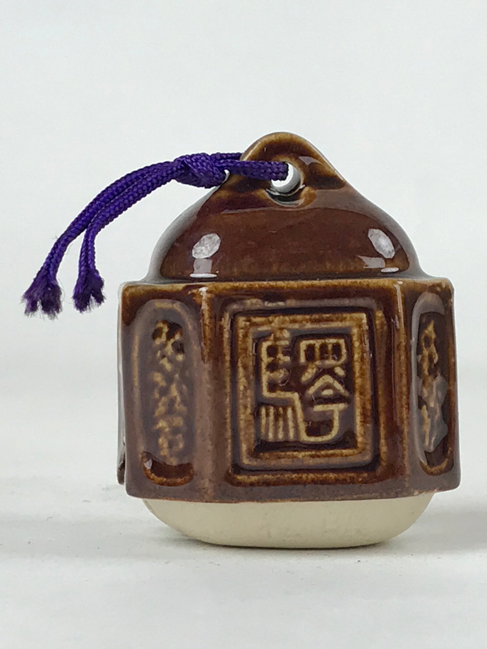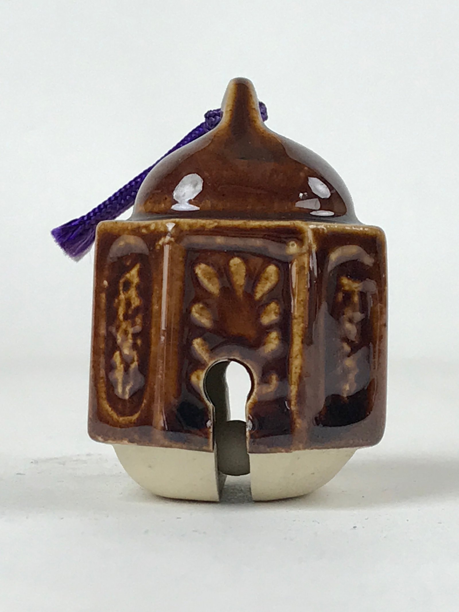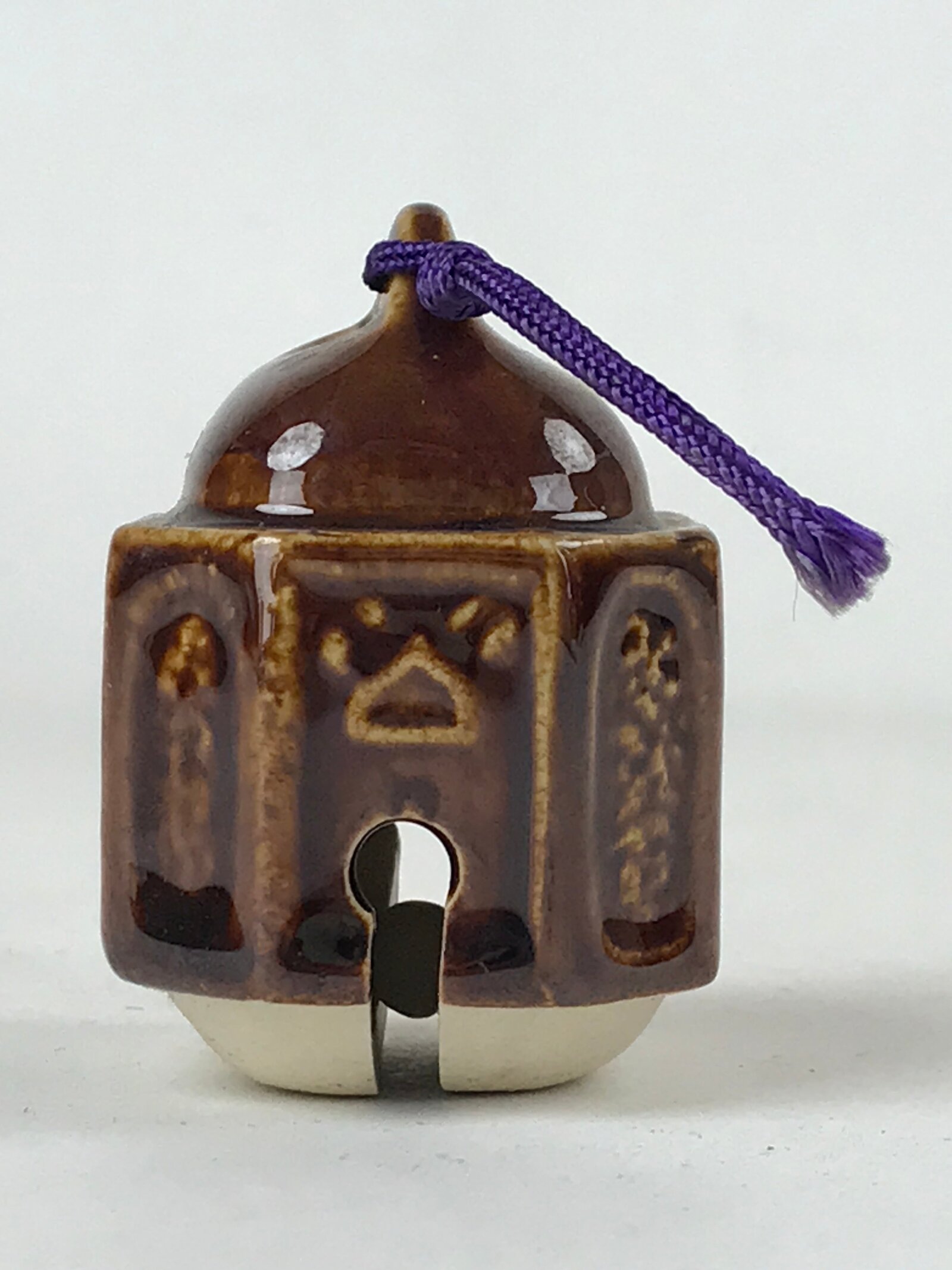 This is a vintage Japanese ceramic bell, or dorei. This bell is shaped like an old station bell and is coated in a dark brown glaze. It has a small white clay ball inside. It has a purple string tied at the top.