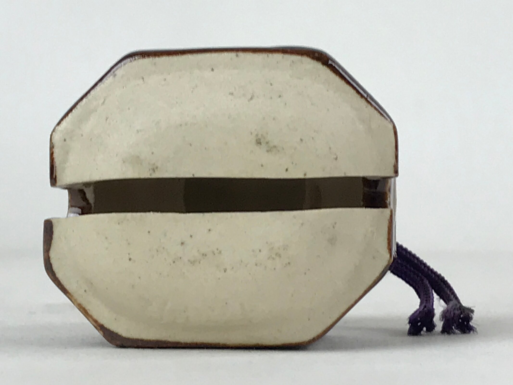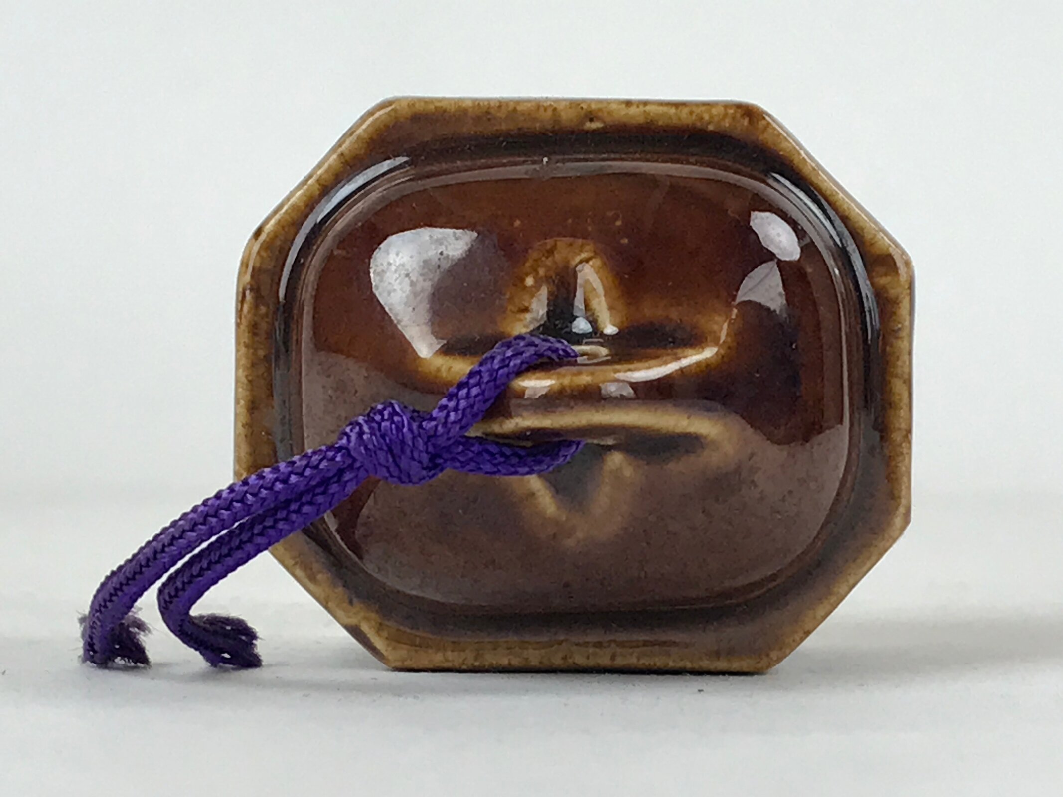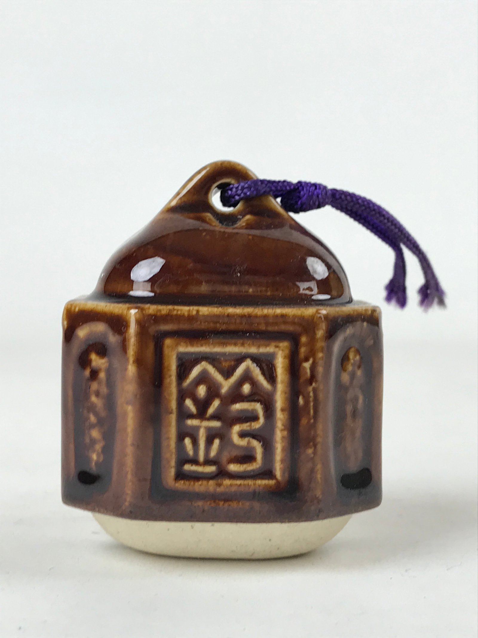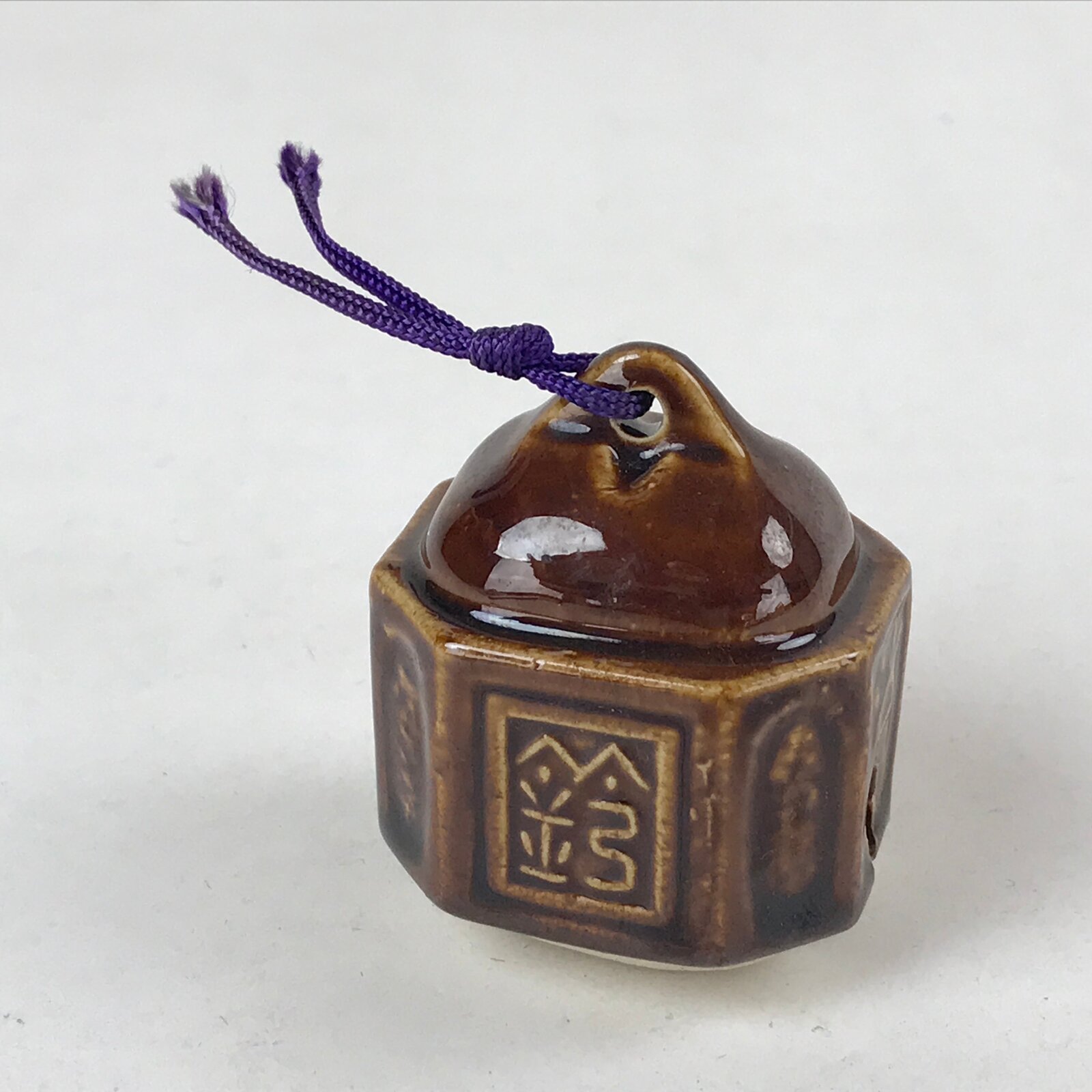 This is a vintage Japanese ceramic bell, or dorei. This bell is shaped like an old station bell and is coated in a dark brown glaze. It has a small white clay ball inside. It has a purple string tied at the top.