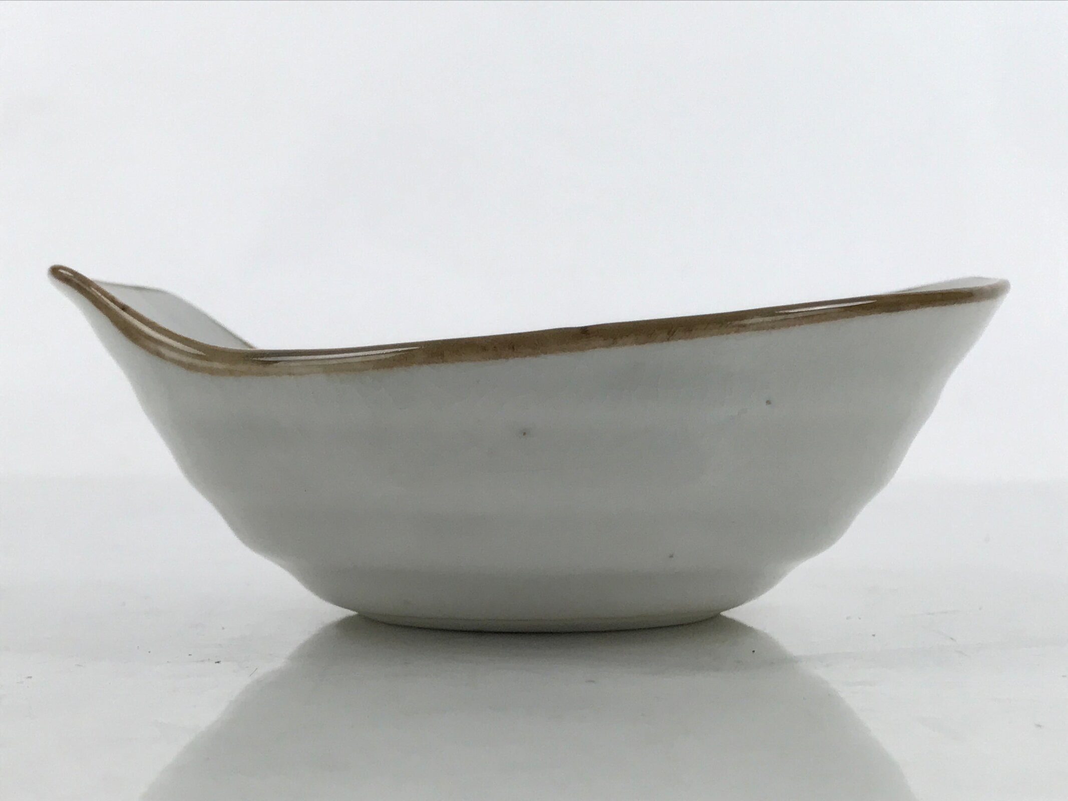 This vintage Japanese ceramic small bowl (kobachi) is white with a blue and green design of pine trees and playing children of Tang Dynasty China (karako), a popular decorative motif in Japan that symbolizes longevity and health for children. It also has a brown rim. This type of bowl is generally used for retrieving food from nabe hot pot, shabu shabu, or other shared dishes. It is to catch any drips or be used as a dipping bowl (as in the case of shabu shabu). The tapered part of the rim is to grip like a handle for easy lifting and maneuvering at the dining table as well as a prop for a spoon.