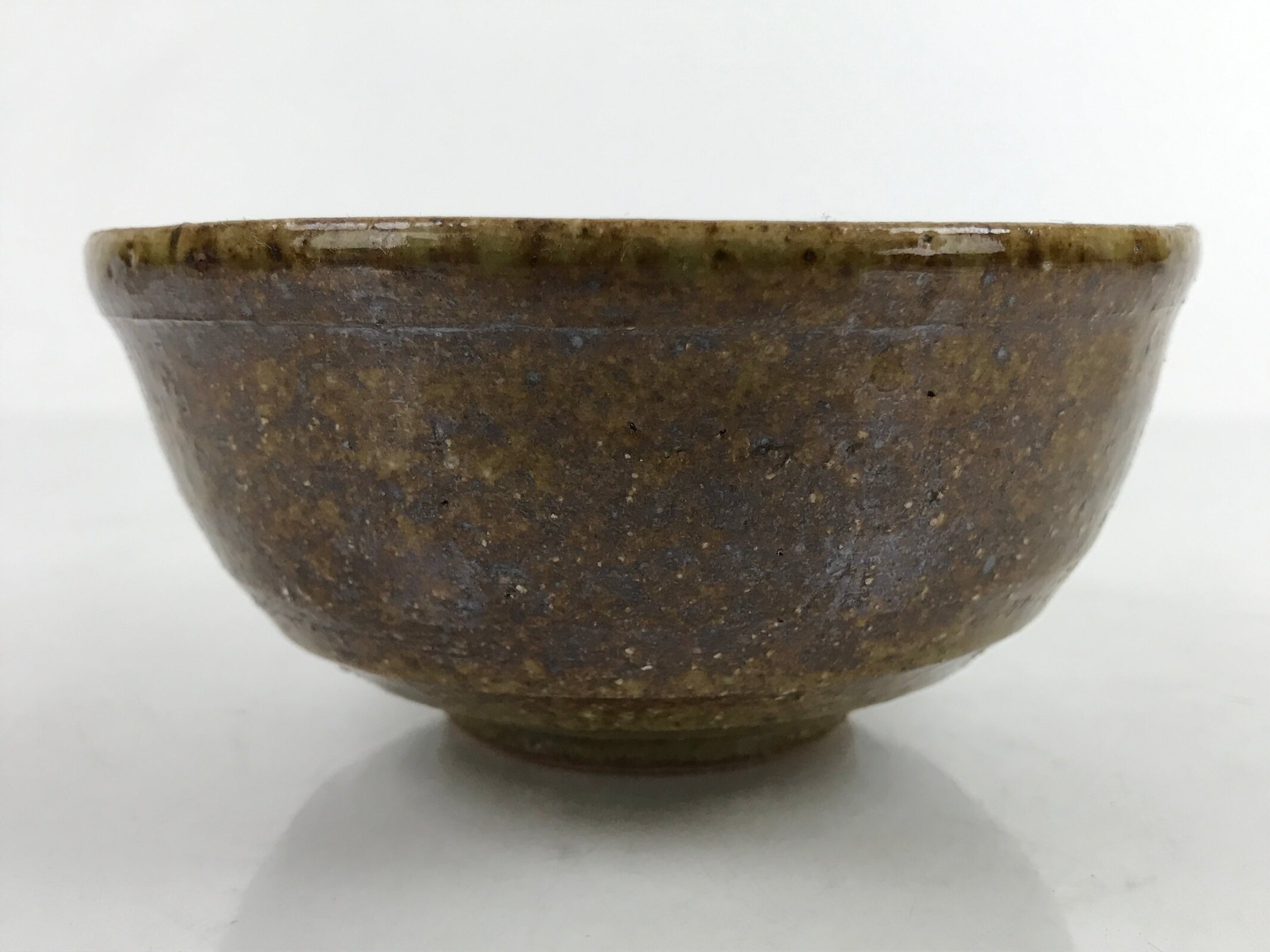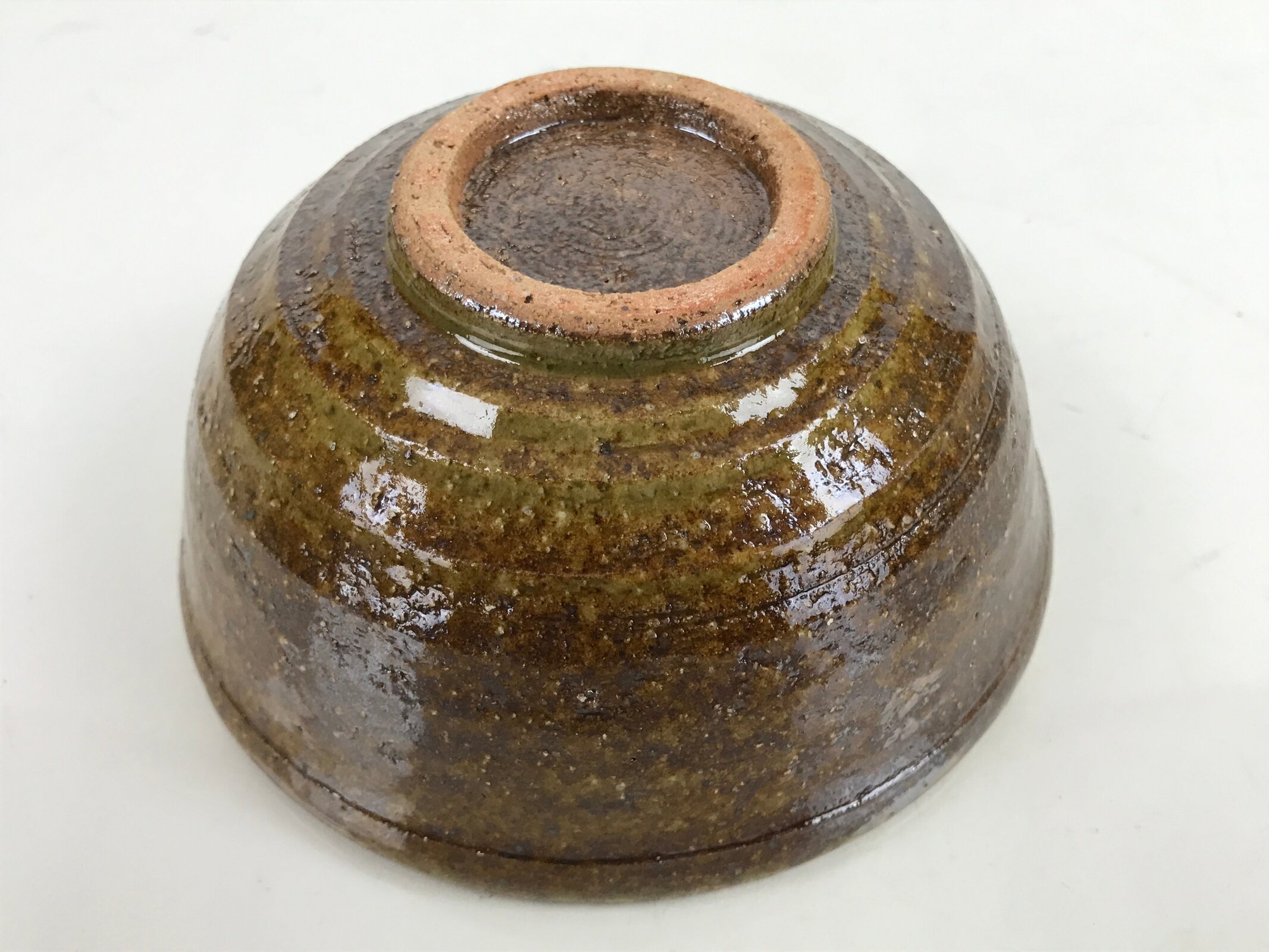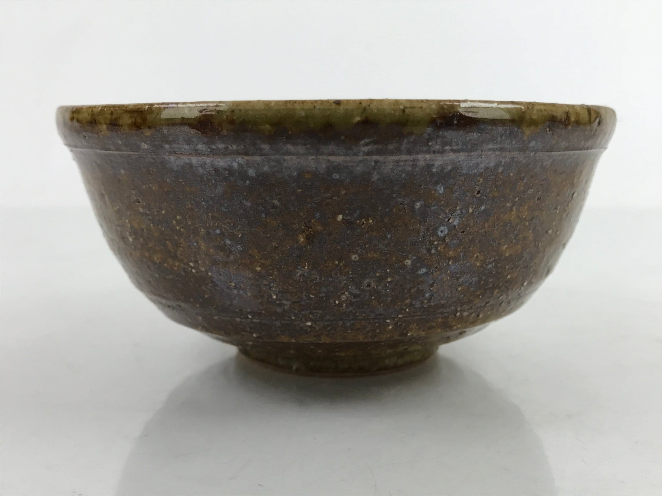 This item is a vintage Japanese ceramic small bowl, or kobachi. This weighty small bowl is a textured brown on the outside with a brown and slight greenish tint on the inside. The inside of the bowl features a very simple line pattern at the bottom.