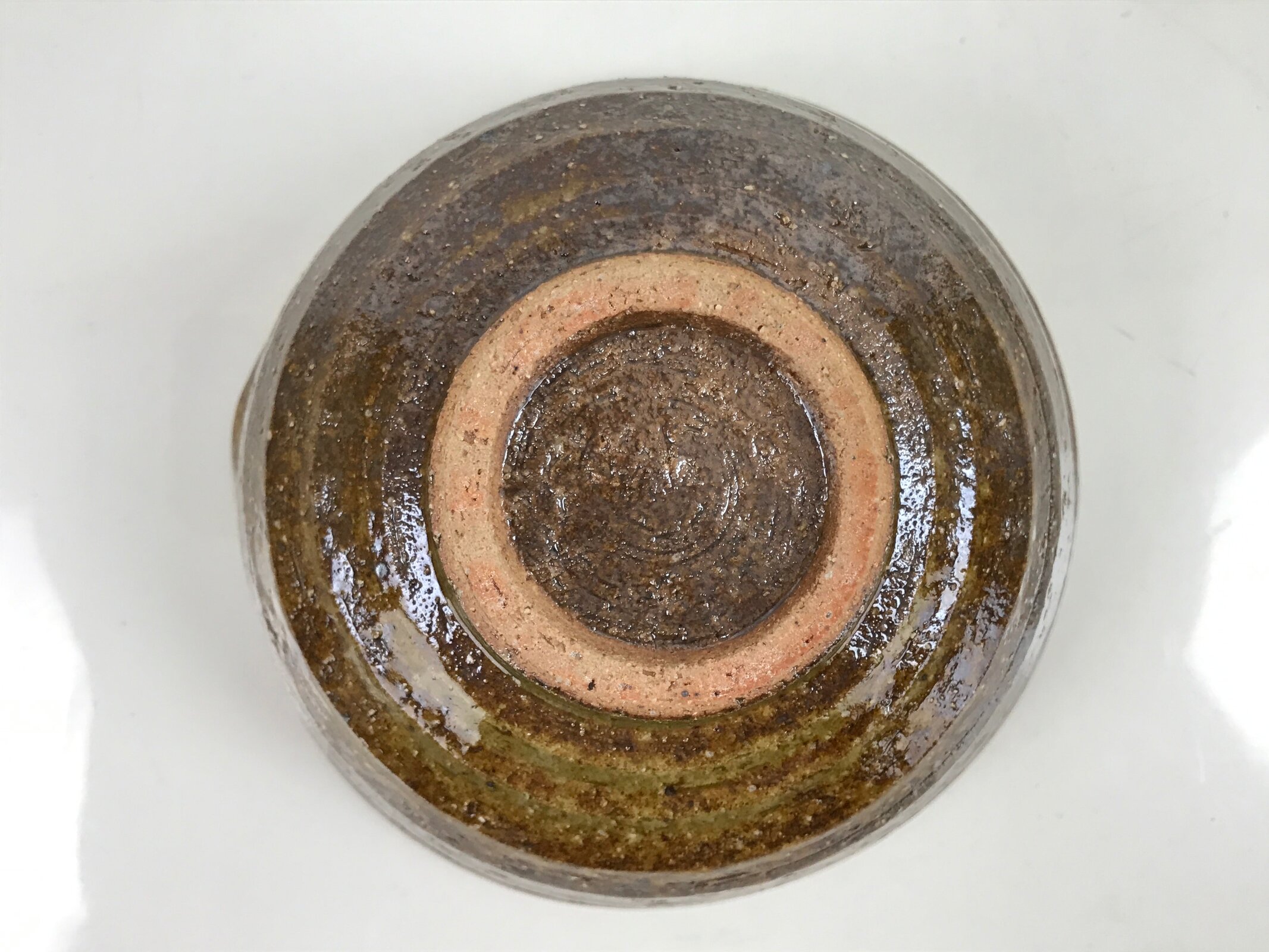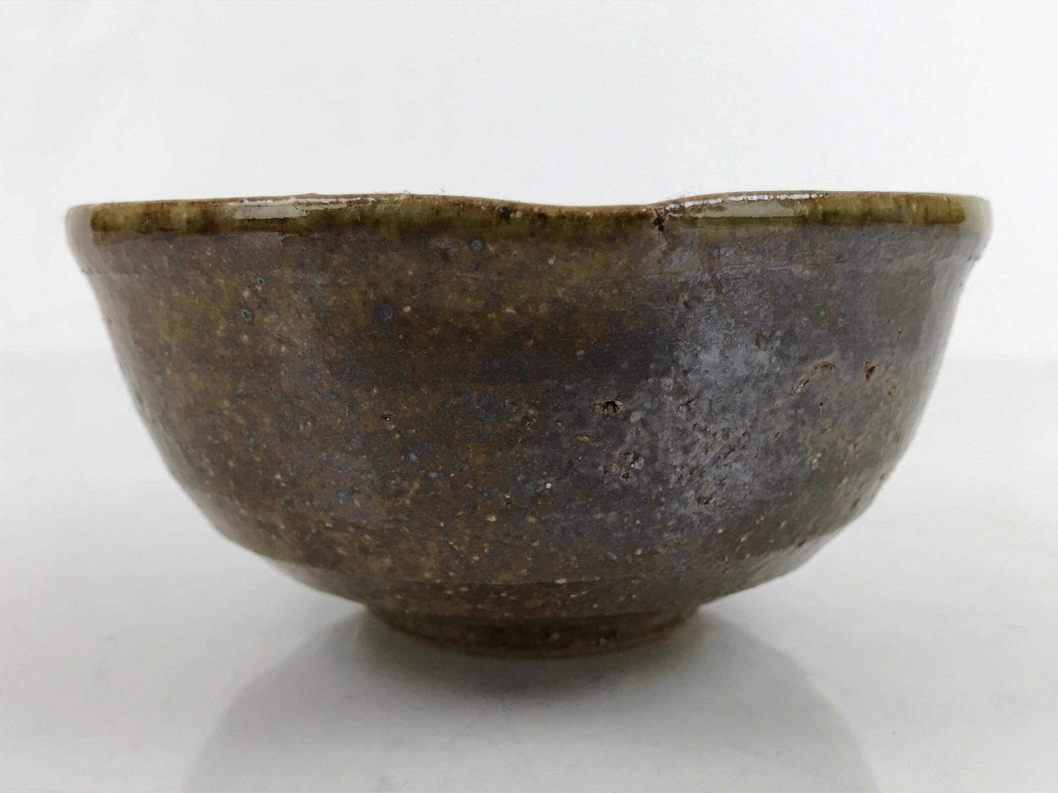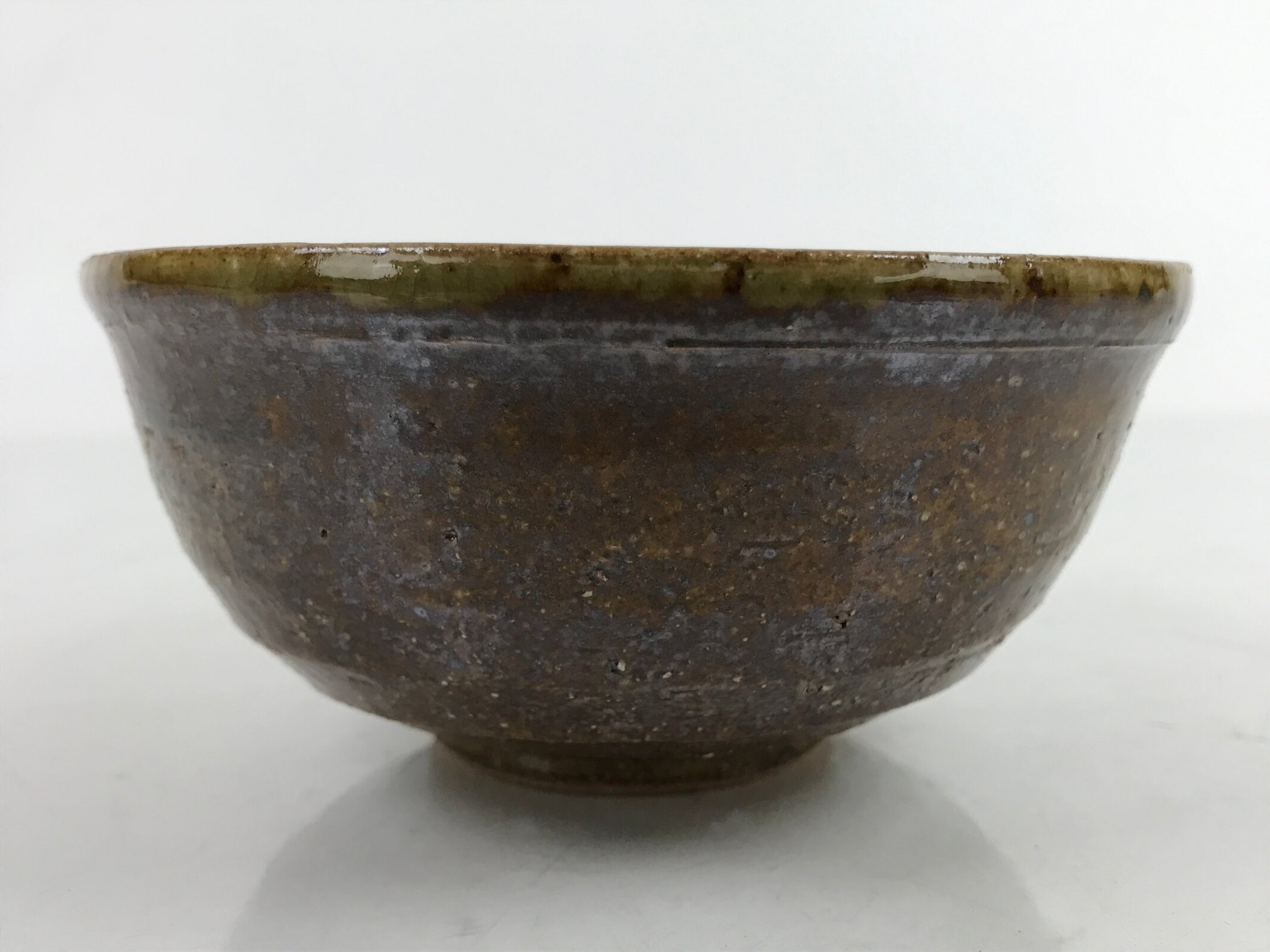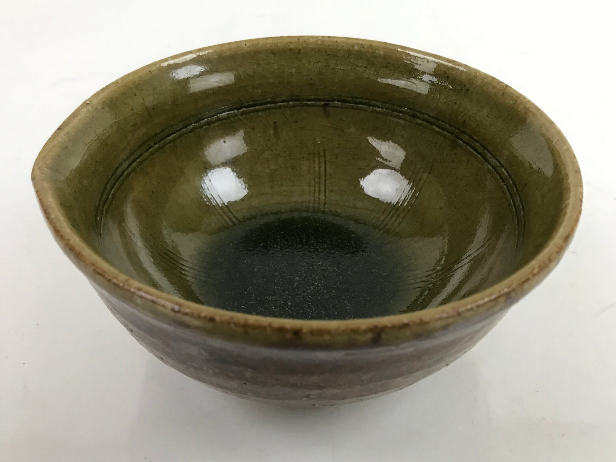 This item is a vintage Japanese ceramic small bowl, or kobachi. This weighty small bowl is a textured brown on the outside with a brown and slight greenish tint on the inside. The inside of the bowl features a very simple line pattern at the bottom.