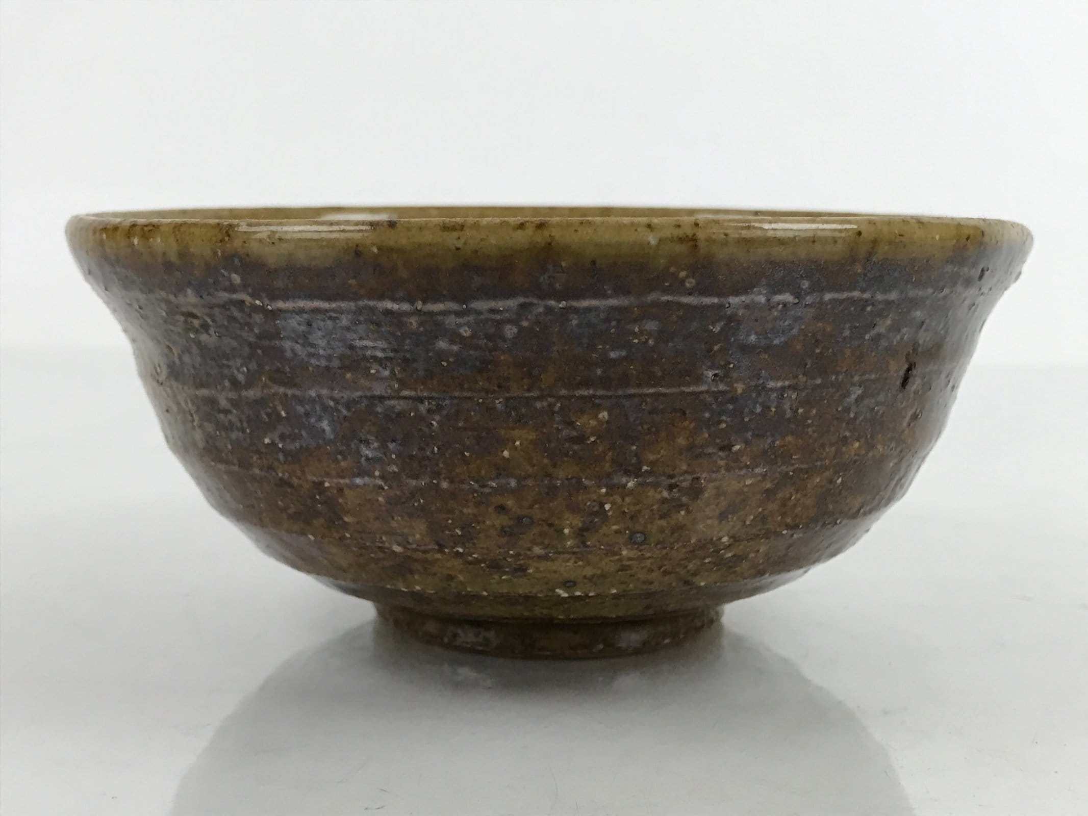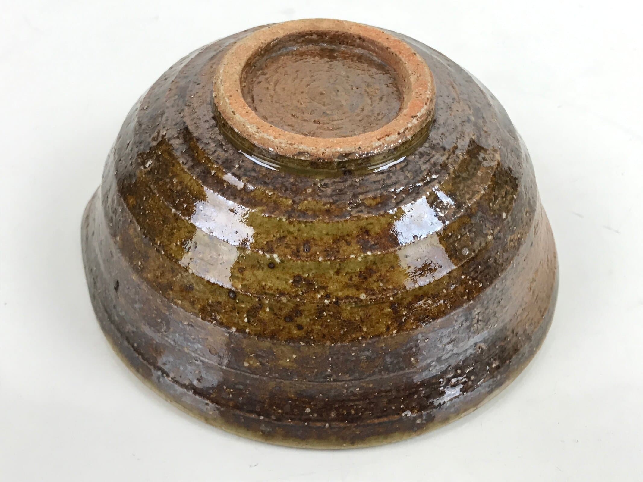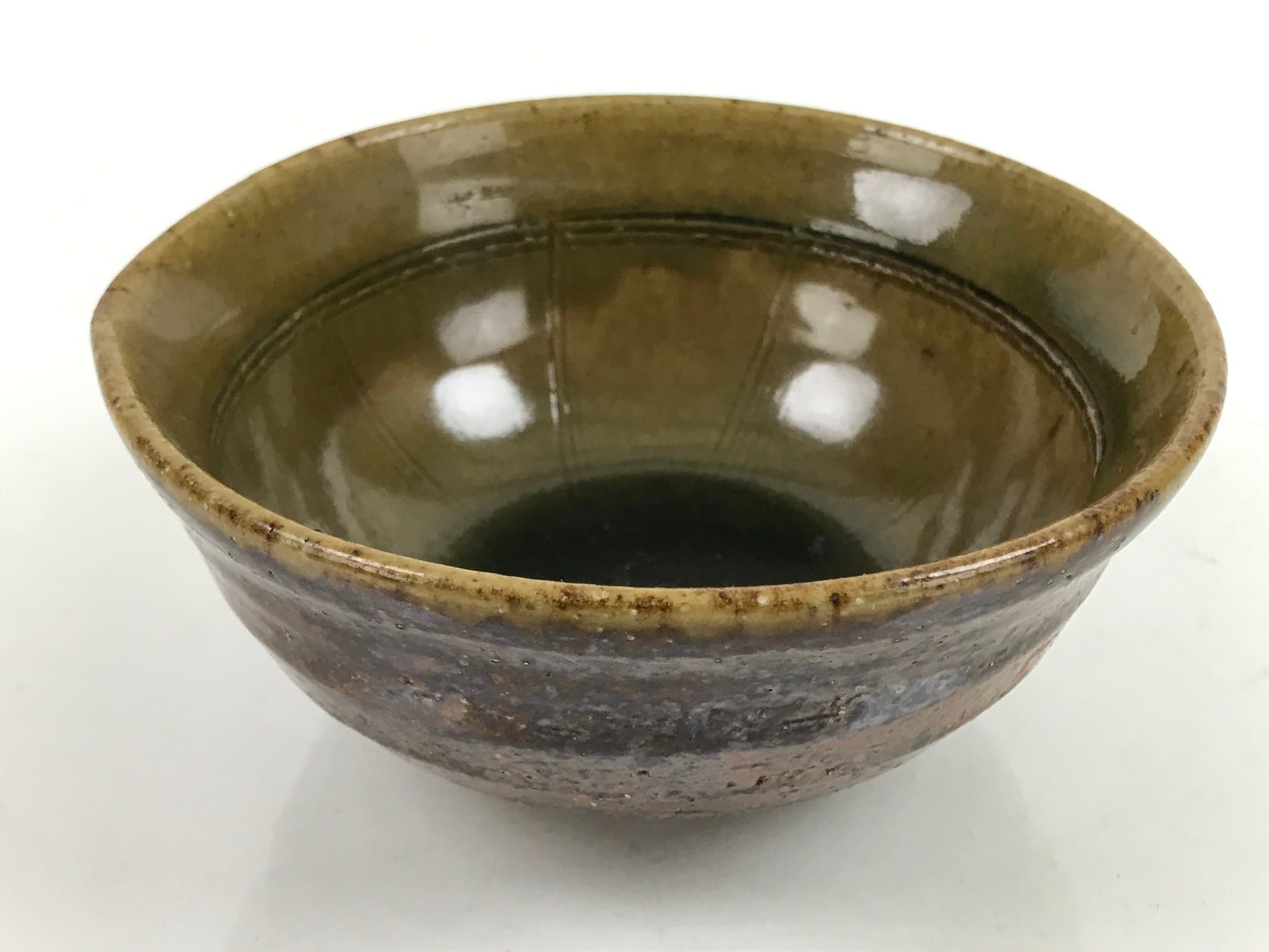 This item is a vintage Japanese ceramic small bowl, or kobachi. This weighty small bowl is a textured brown on the outside with a brown and slight greenish tint on the inside. The inside of the bowl features a very simple line pattern at the bottom.