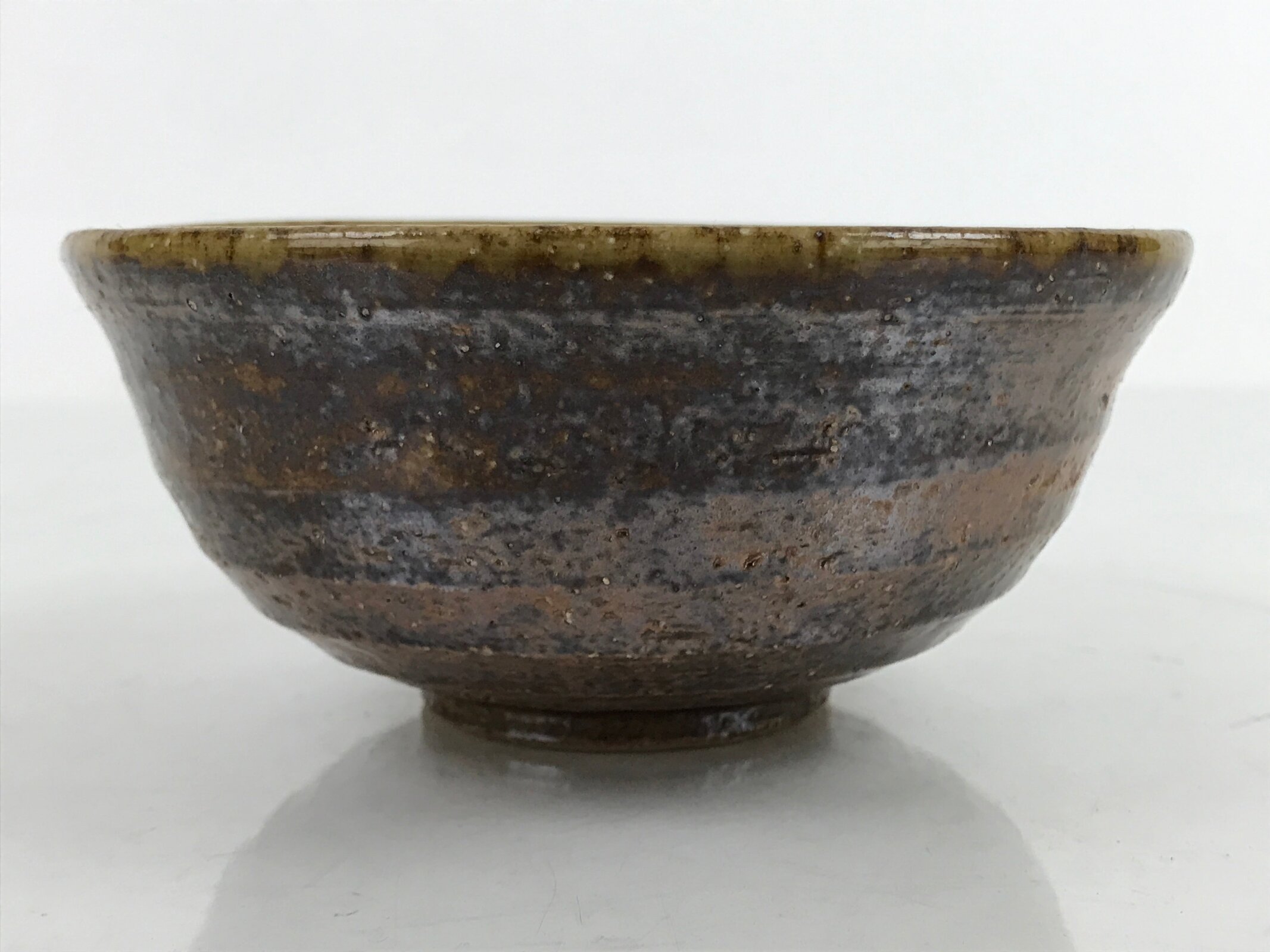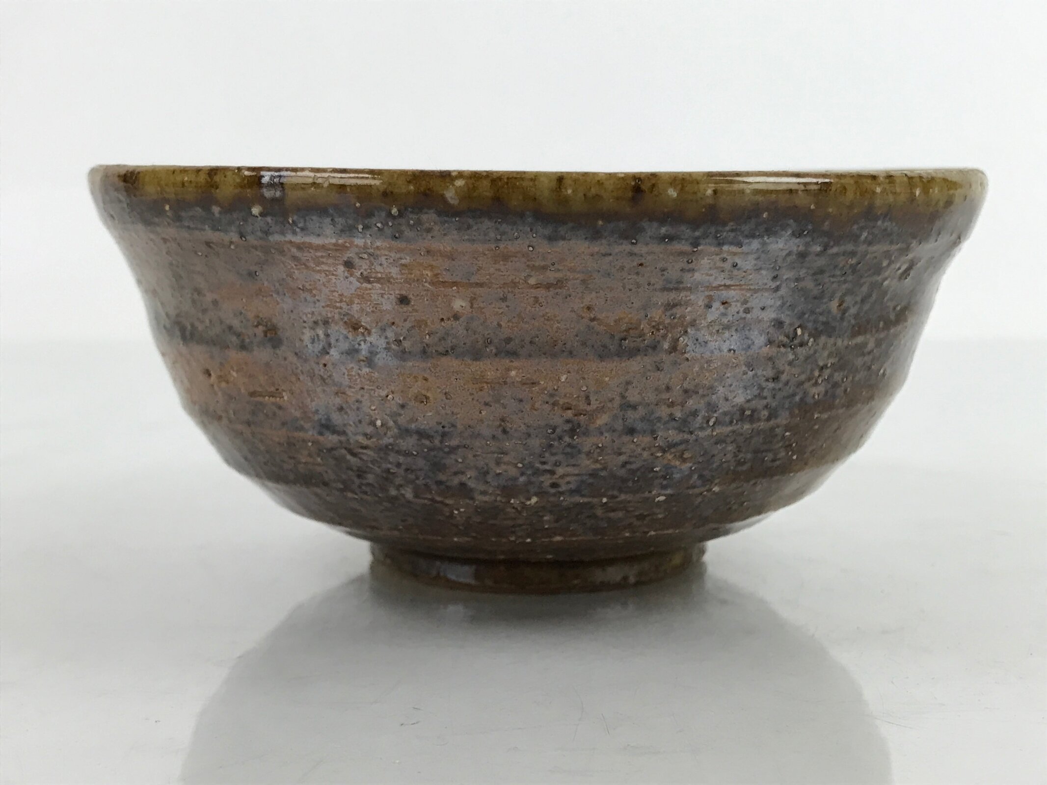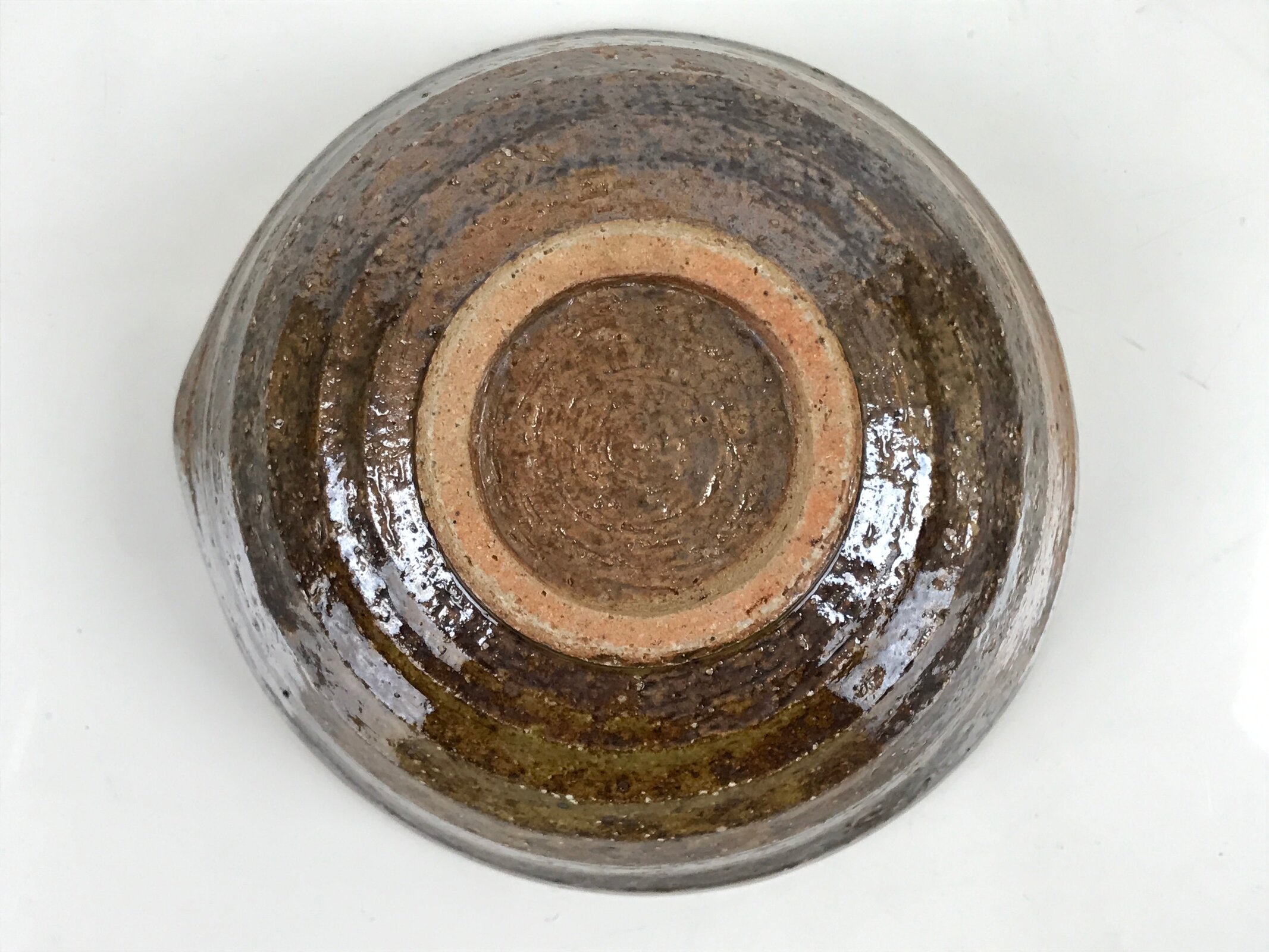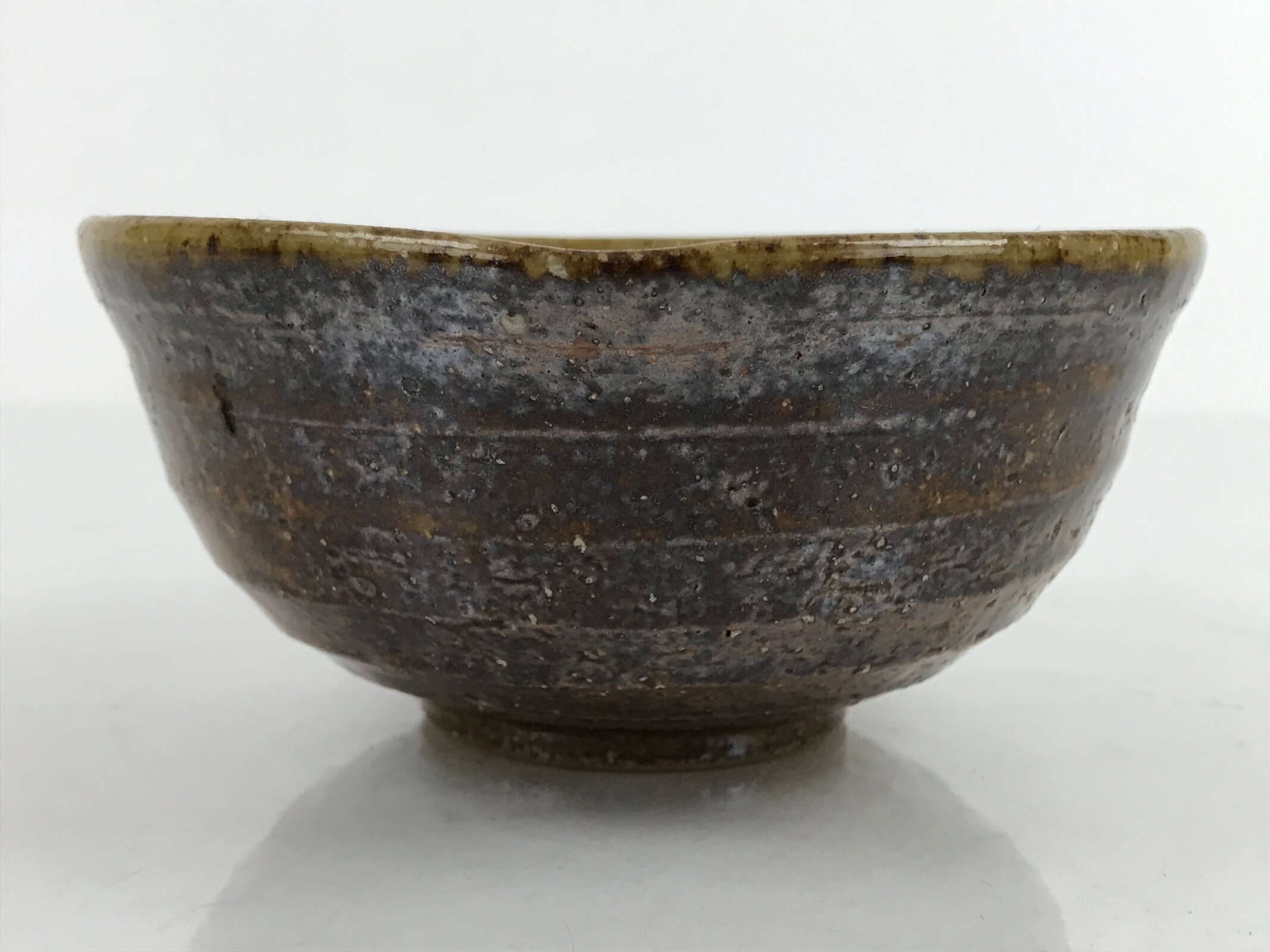 This item is a vintage Japanese ceramic small bowl, or kobachi. This weighty small bowl is a textured brown on the outside with a brown and slight greenish tint on the inside. The inside of the bowl features a very simple line pattern at the bottom.