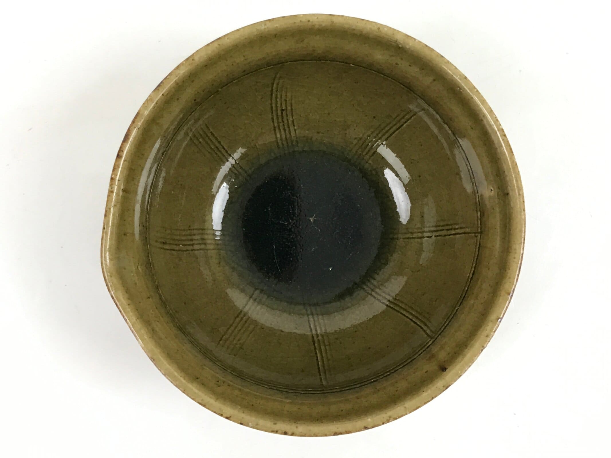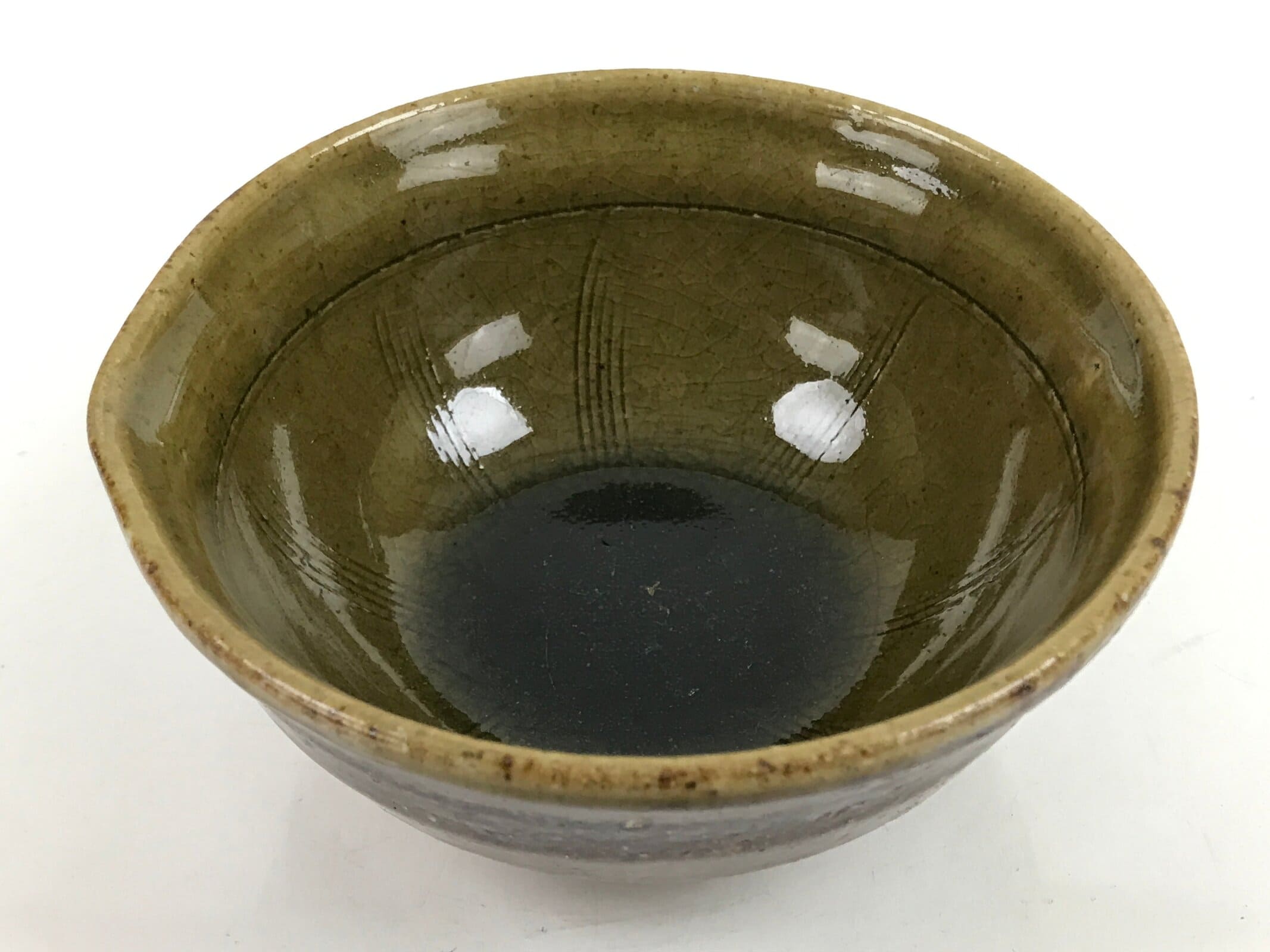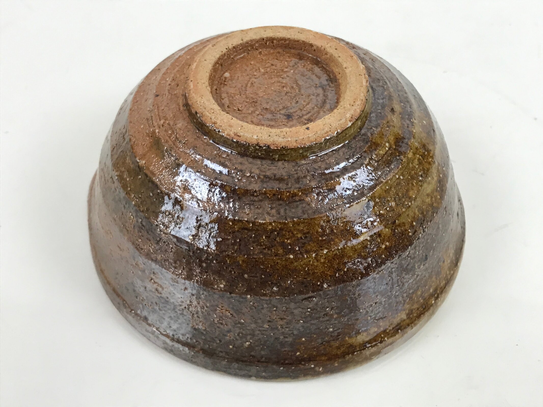 This item is a vintage Japanese ceramic small bowl, or kobachi. This weighty small bowl is a textured brown on the outside with a brown and slight greenish tint on the inside. The inside of the bowl features a very simple line pattern at the bottom.