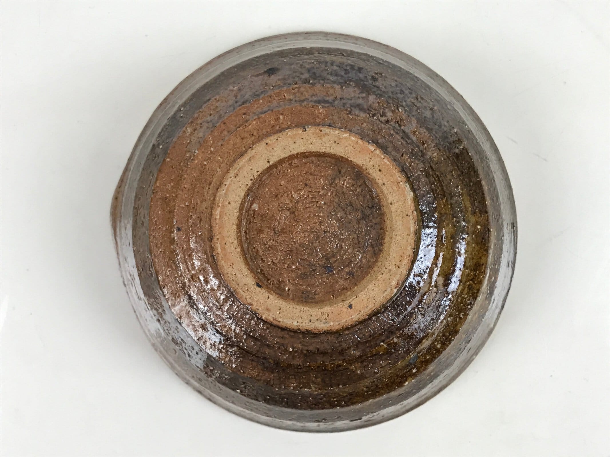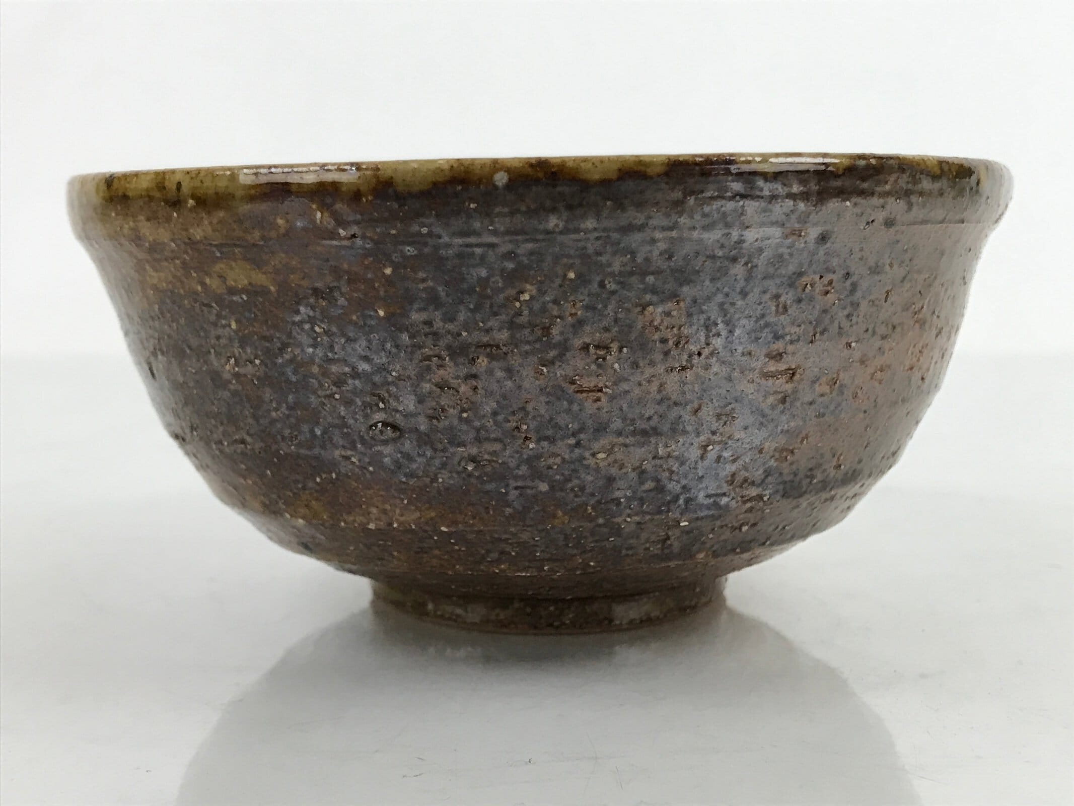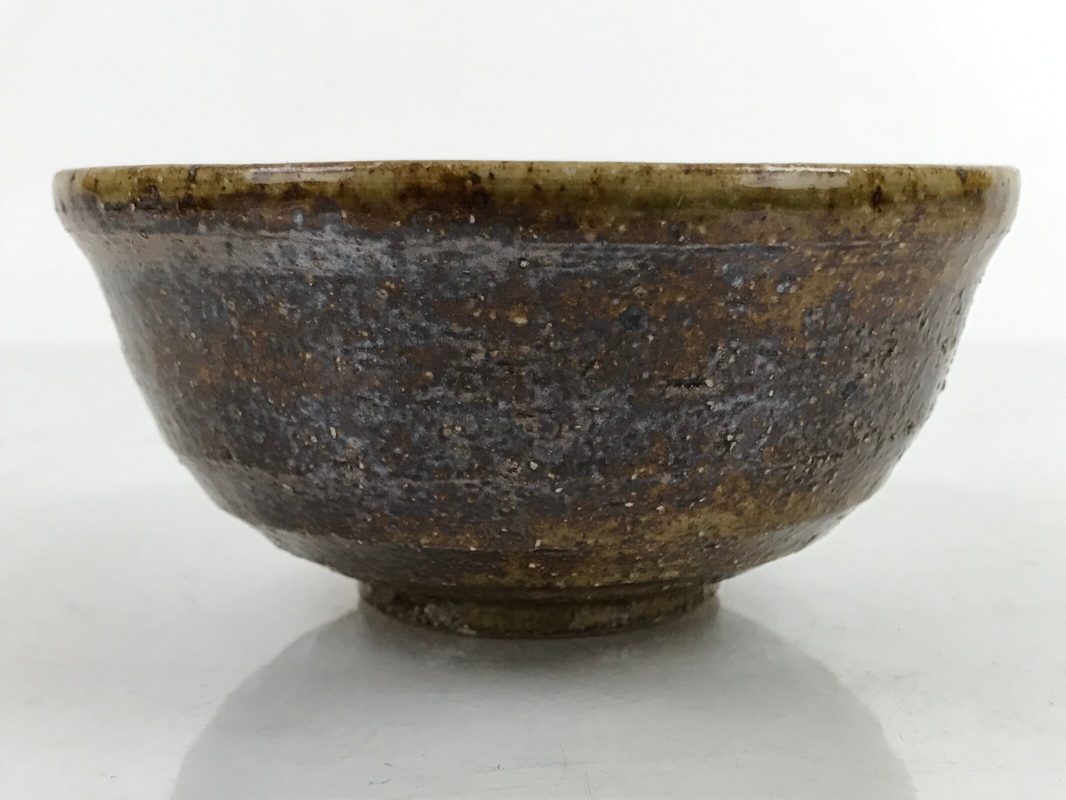 This item is a vintage Japanese ceramic small bowl, or kobachi. This weighty small bowl is a textured brown on the outside with a brown and slight greenish tint on the inside. The inside of the bowl features a very simple line pattern at the bottom.