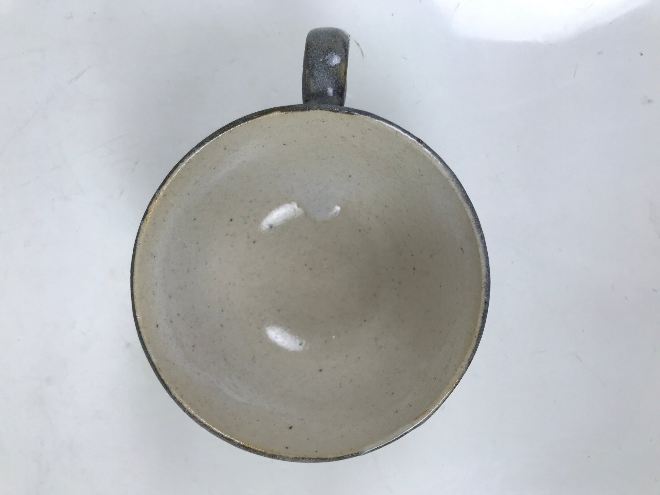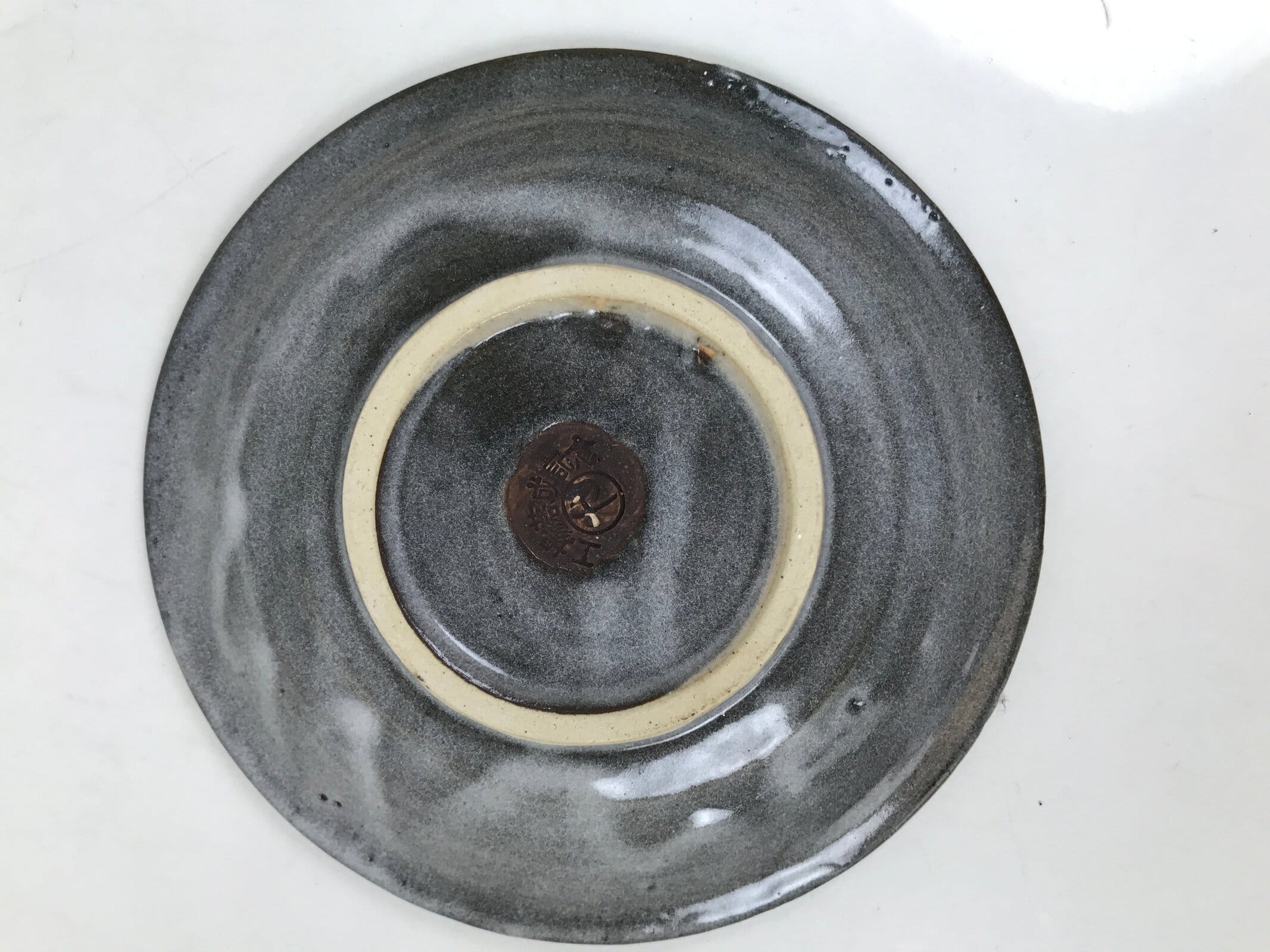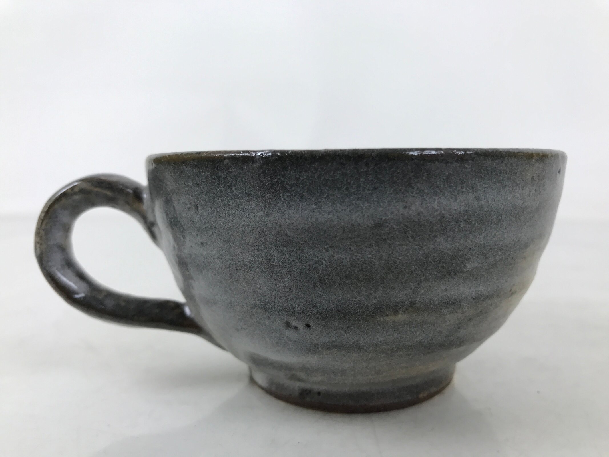 This is a vintage Japanese ceramic coffee cup and its saucer. It is gray with a white glaze on top on the outside and beige on the inside. The saucer is gray. There are writings on the bottom, indicating it’s a commemorative cup to celebrate the completion of a factory. This cup is perfect for enjoying coffee or tea.