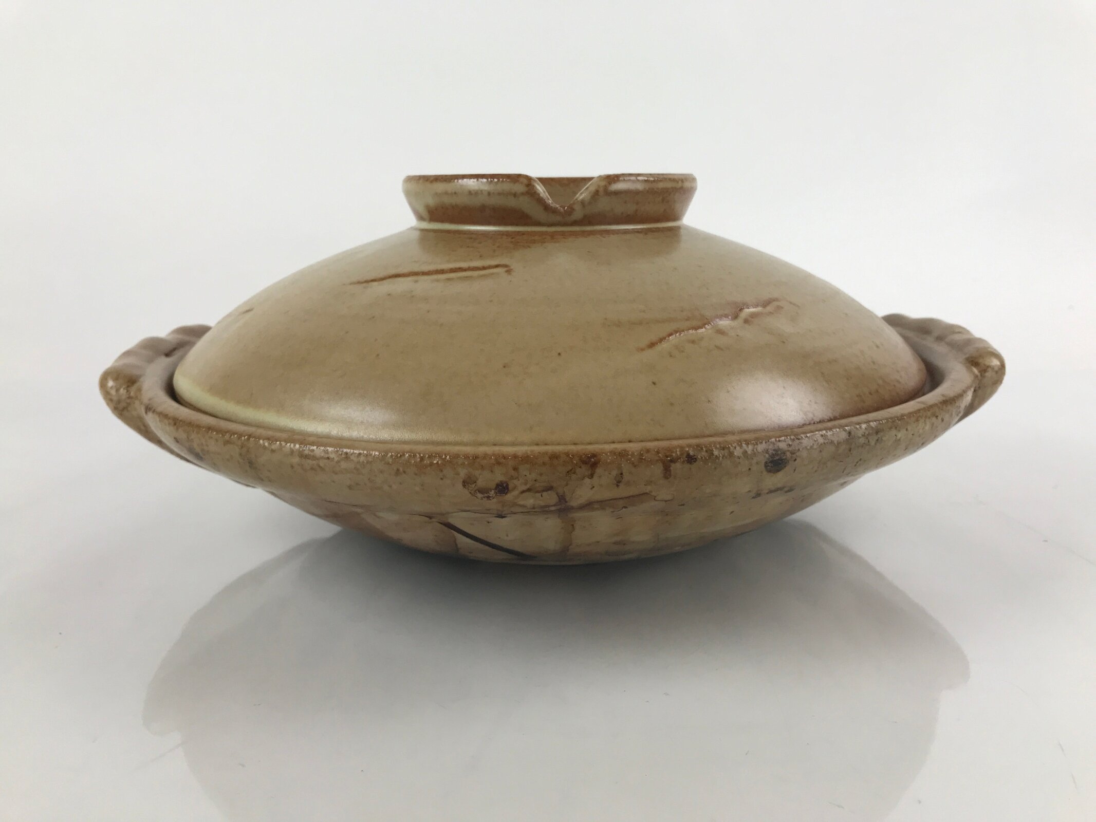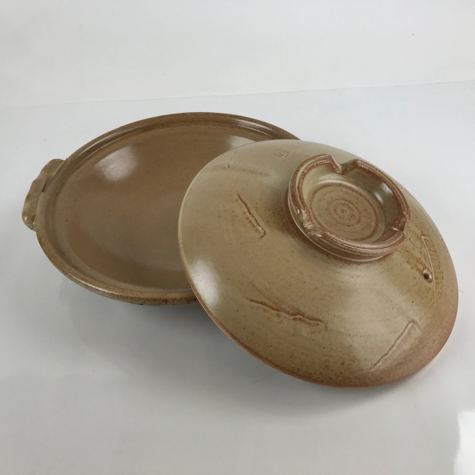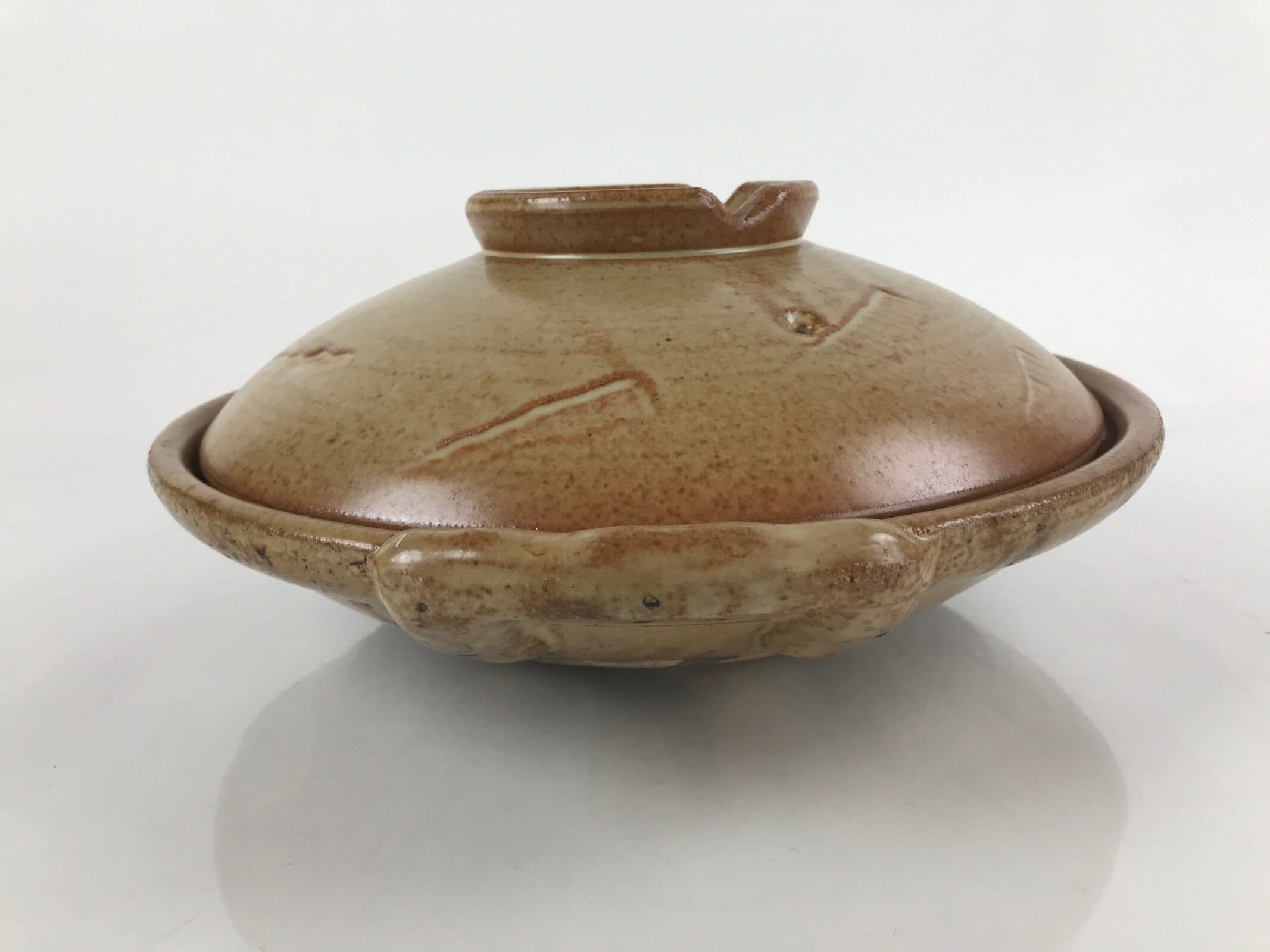 This is a vintage Japanese ceramic nabe pot. Used to cook various hotpot dishes with vegetables, meat, and noodles, this large shallow pot with a lid is a light brown and terracotta color with simple impression designs on the lid. It had two handles on the sides for easy transport. On the lid is a hole for venting steam. This is a popular household item that is used primarily during the winter months and can be used to serve 3-4 people.