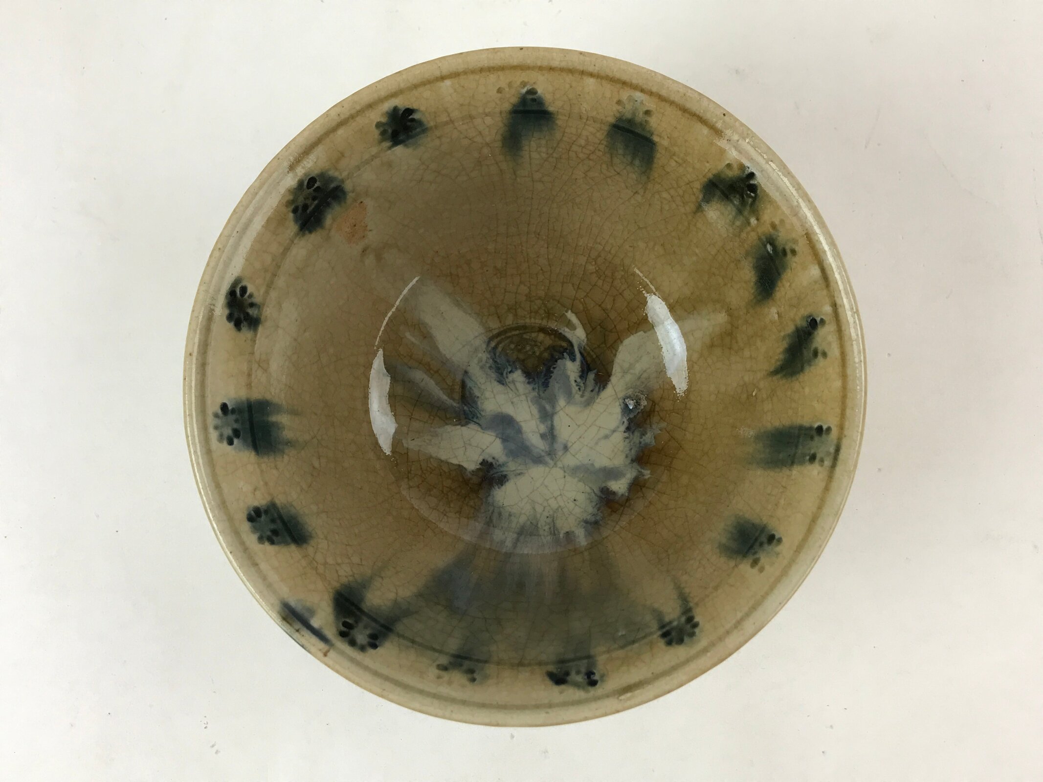 This is a vintage Japanese large ceramic bowl used for serving soba/udon noodle soups as well as donburi (rice with meat or vegetable topping). On the outside, it has a medium brown base with a light brown-to-green drip glaze. Inside it features blue flowers and a blue and white plaint splash on the very bottom.