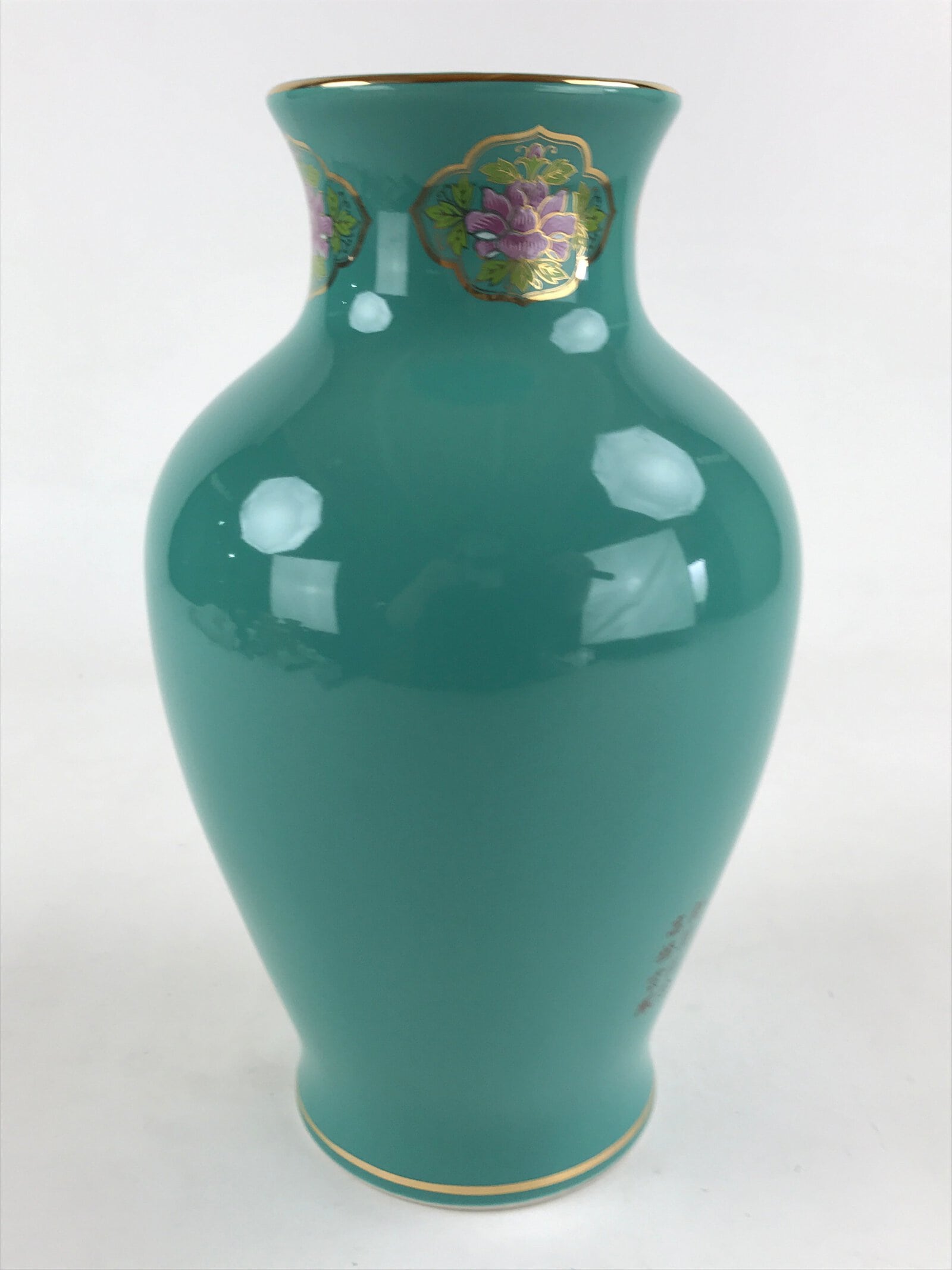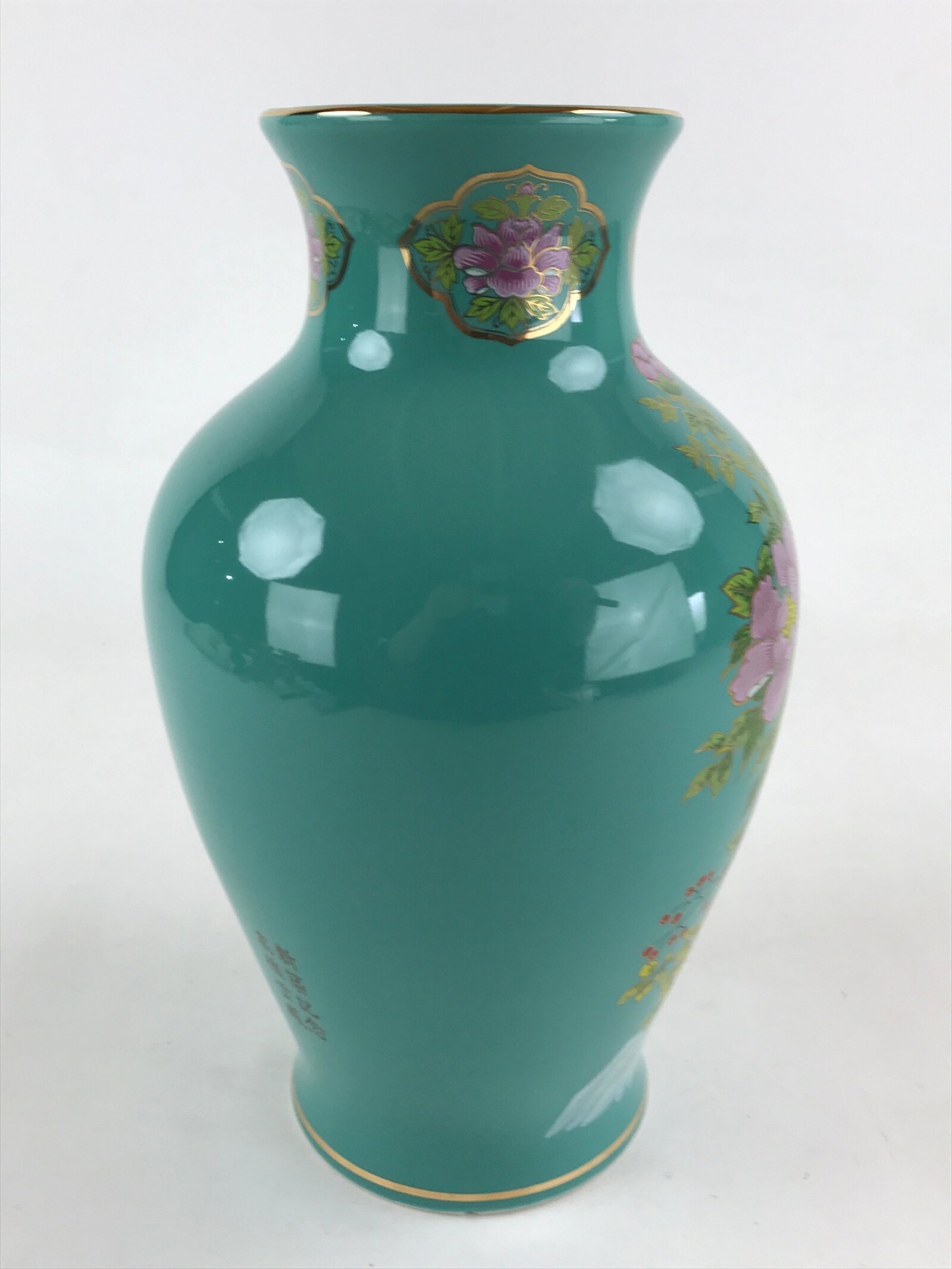 This is a Japanese vintage flower vase or kabin. This large vase has a beautiful aqua-green (not turquoise) shiny color with gorgeous flowers and two birds on the front embellished with gold color foil. It has inscriptions in Japanese on the back, “新築記念” can be translated as “congratulations on building your new house”.