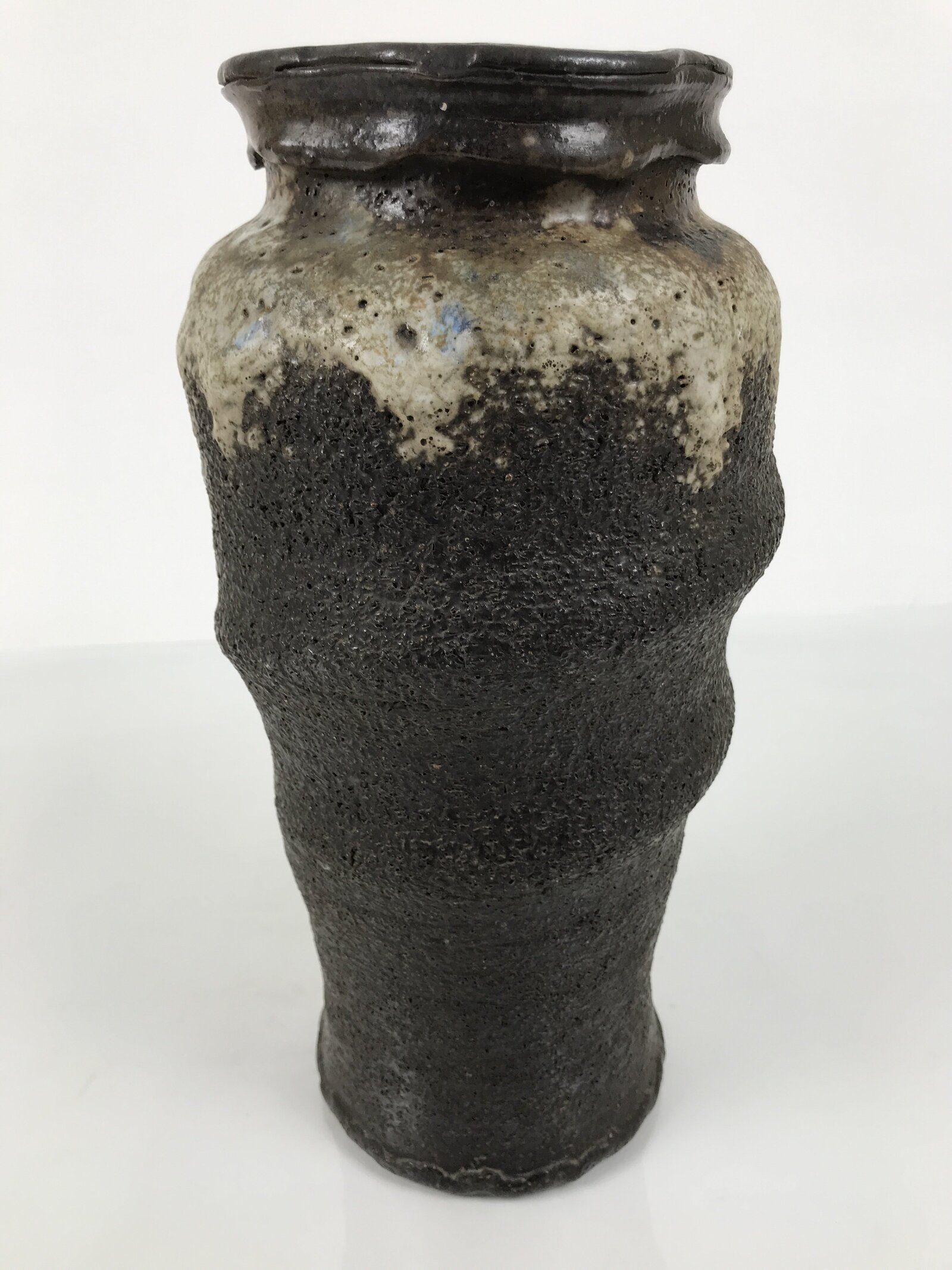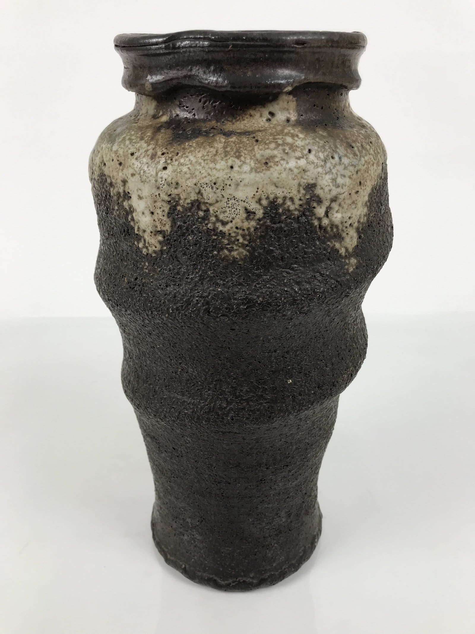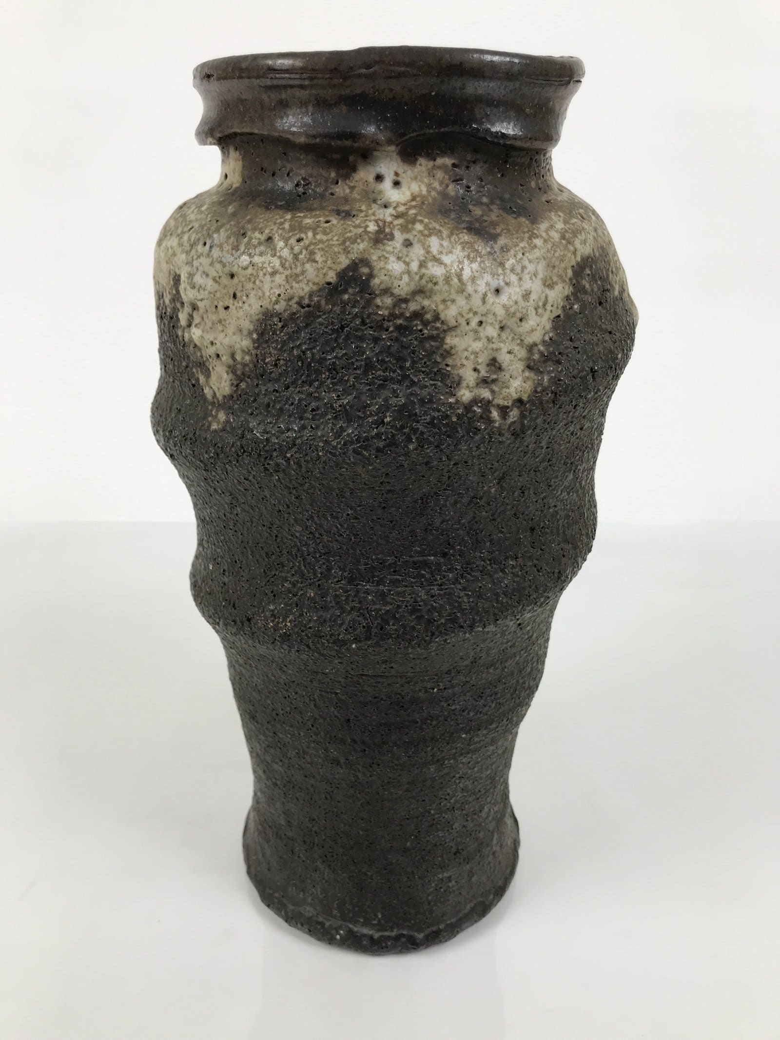 This is a vintage Japanese ceramic flower vase, or kabin. It is dark brown or charcoal with a lighter ash glaze and a tapered cylindrical shape. It has a textured surface and body undulations that reflect hand-made construction. It can be used for all types of flower arrangements both ikebana and casual and also as a statement piece to decorate your entrance.