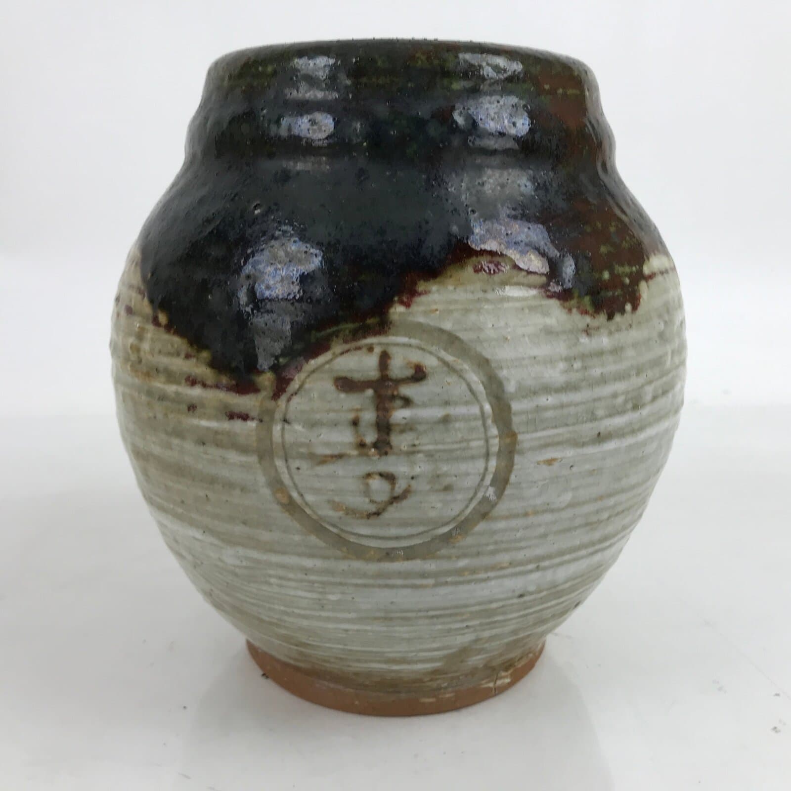 This is a vintage Japanese ceramic flower vase, known as a kabin. This round pot-type vase is mostly a beautiful gray and beige banded stripe (textured) with a dark brown at the top. It features several small design details, including a dragon, a seigaiha calm sea waves pattern, some Japanese characters, and a signature. It can be used for all types of flower arrangements, including both ikebana and casual styles.