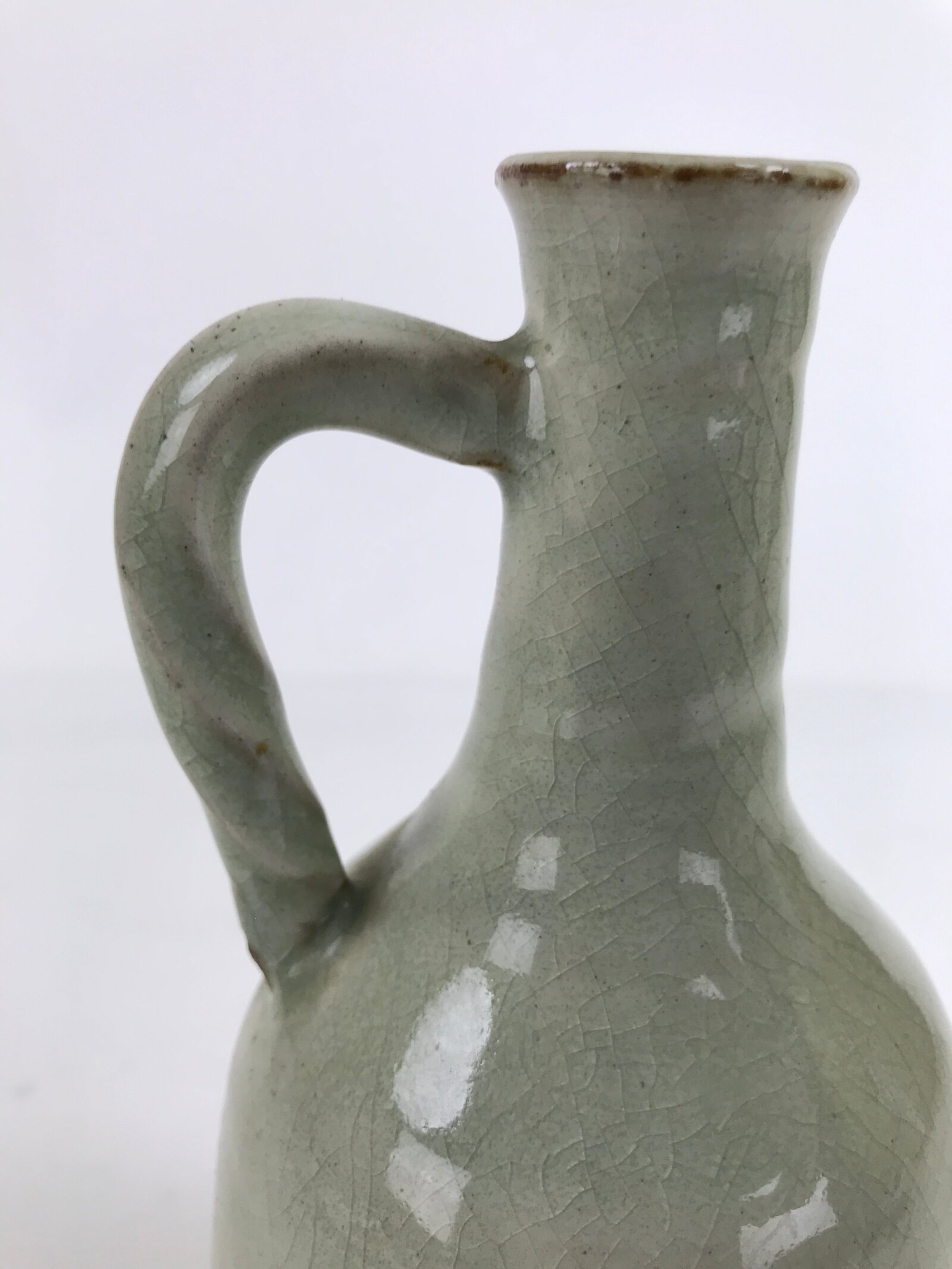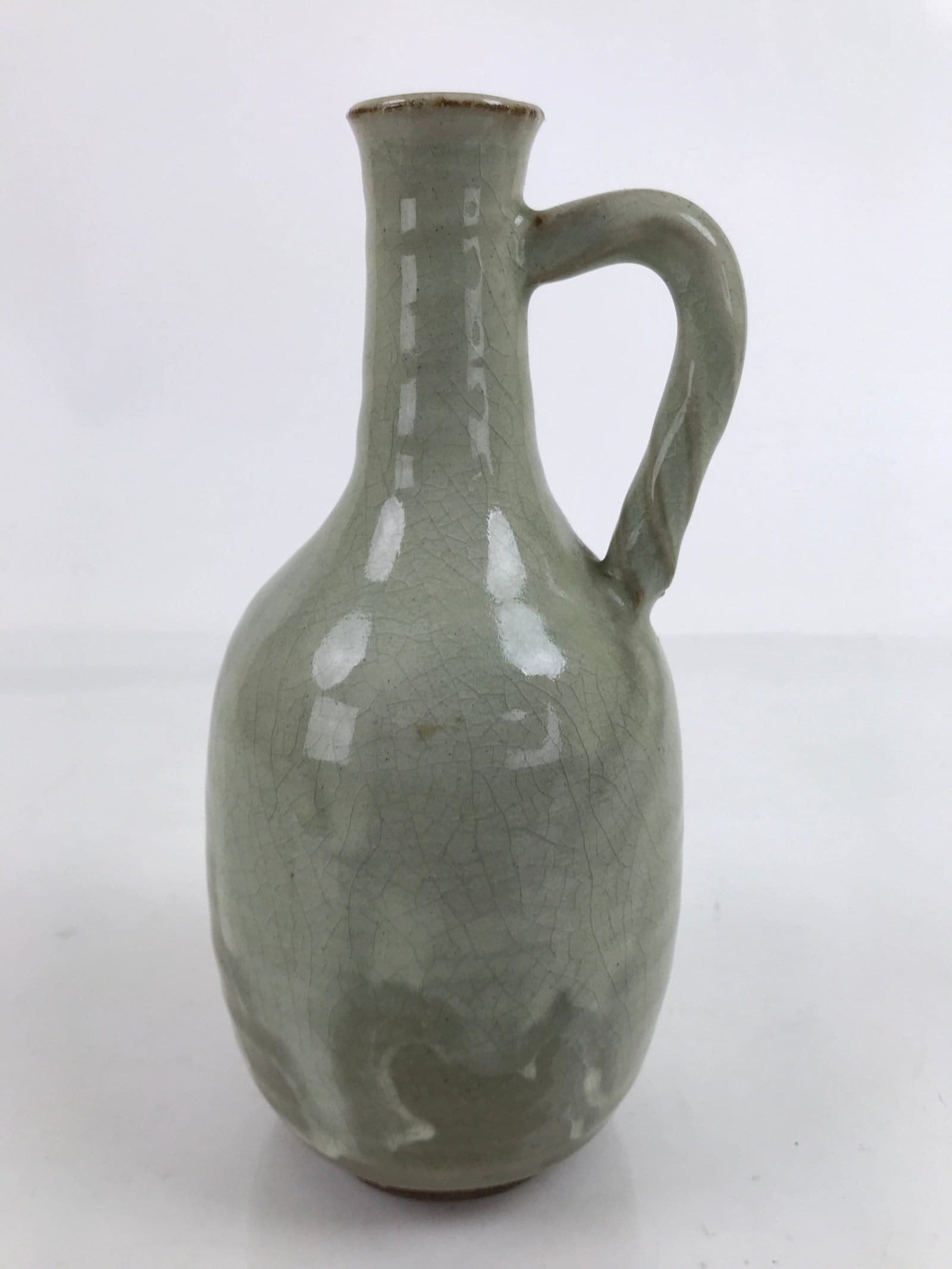 This is a vintage Japanese ceramic flower vase, or kabin. This vase green and brown. This vase has a slim crane neck and a round body. A glass crackle glaze is covering a brown base. It can be used for all types of flower arrangements both ikebana and casual.