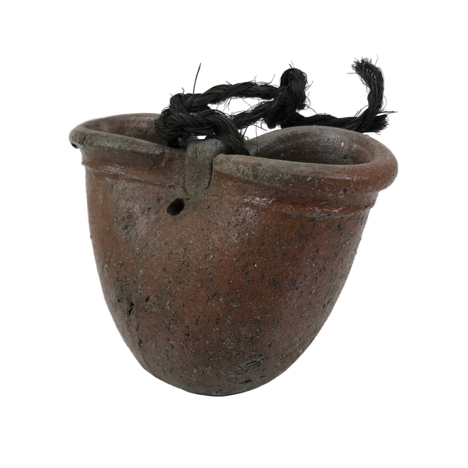 This is a vintage Japanese ceramic flower vase, or kabin. It is unglazed, small, and brown. The bowl-shaped vase has a rough, textured surface and two openings with a deformed rim. A deformed part has a brown rope around. There is a small hole on the side, which is likely for wall hanging this vase. It can be used for all types of flower arrangements both ikebana and casual and also as a statement piece to decorate your entrance.