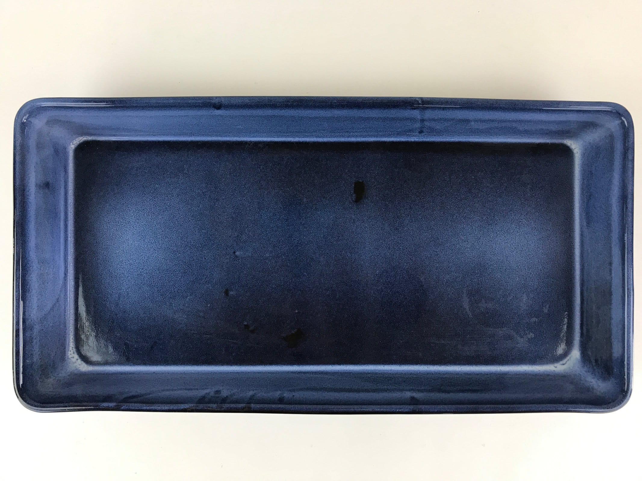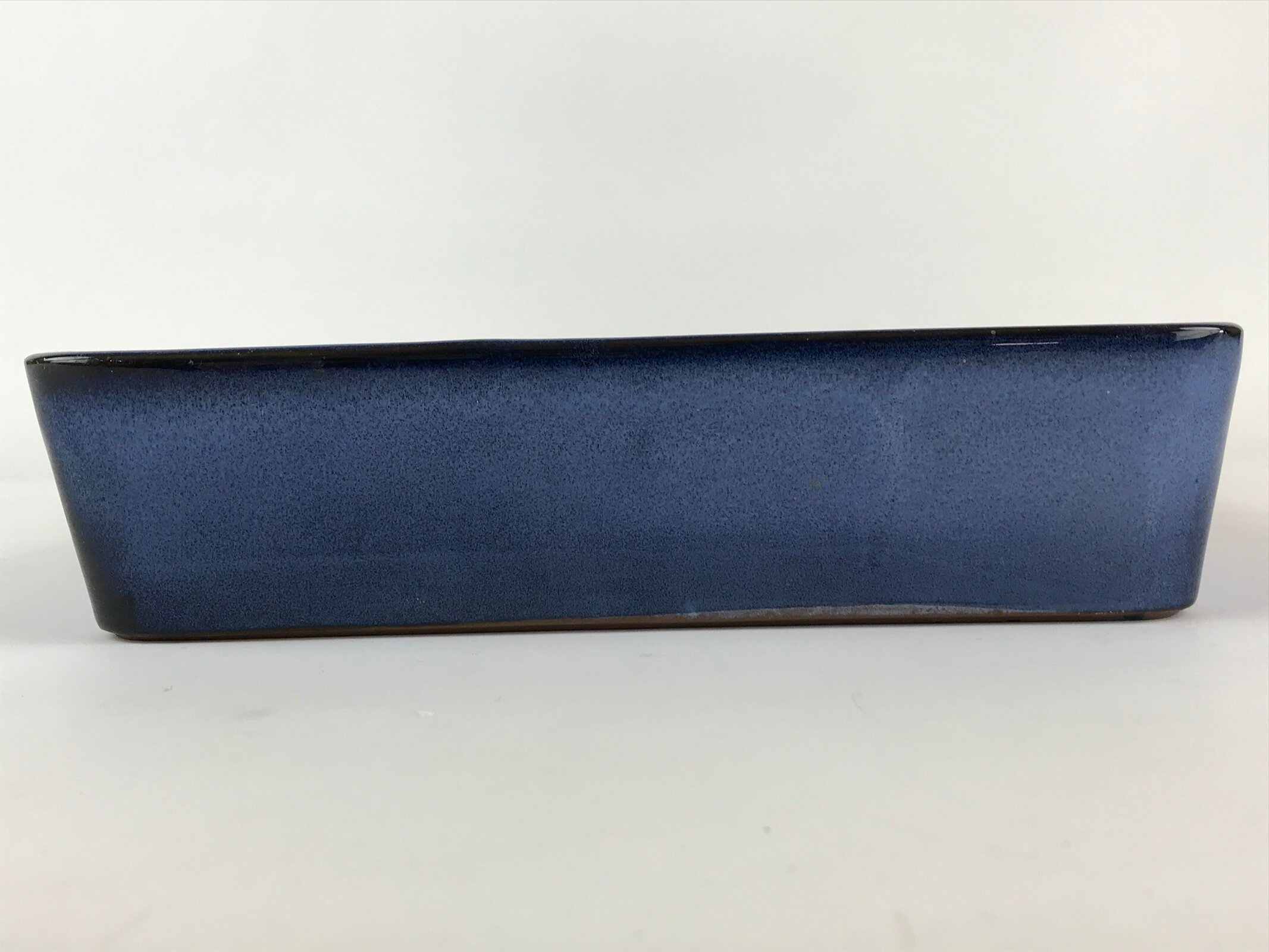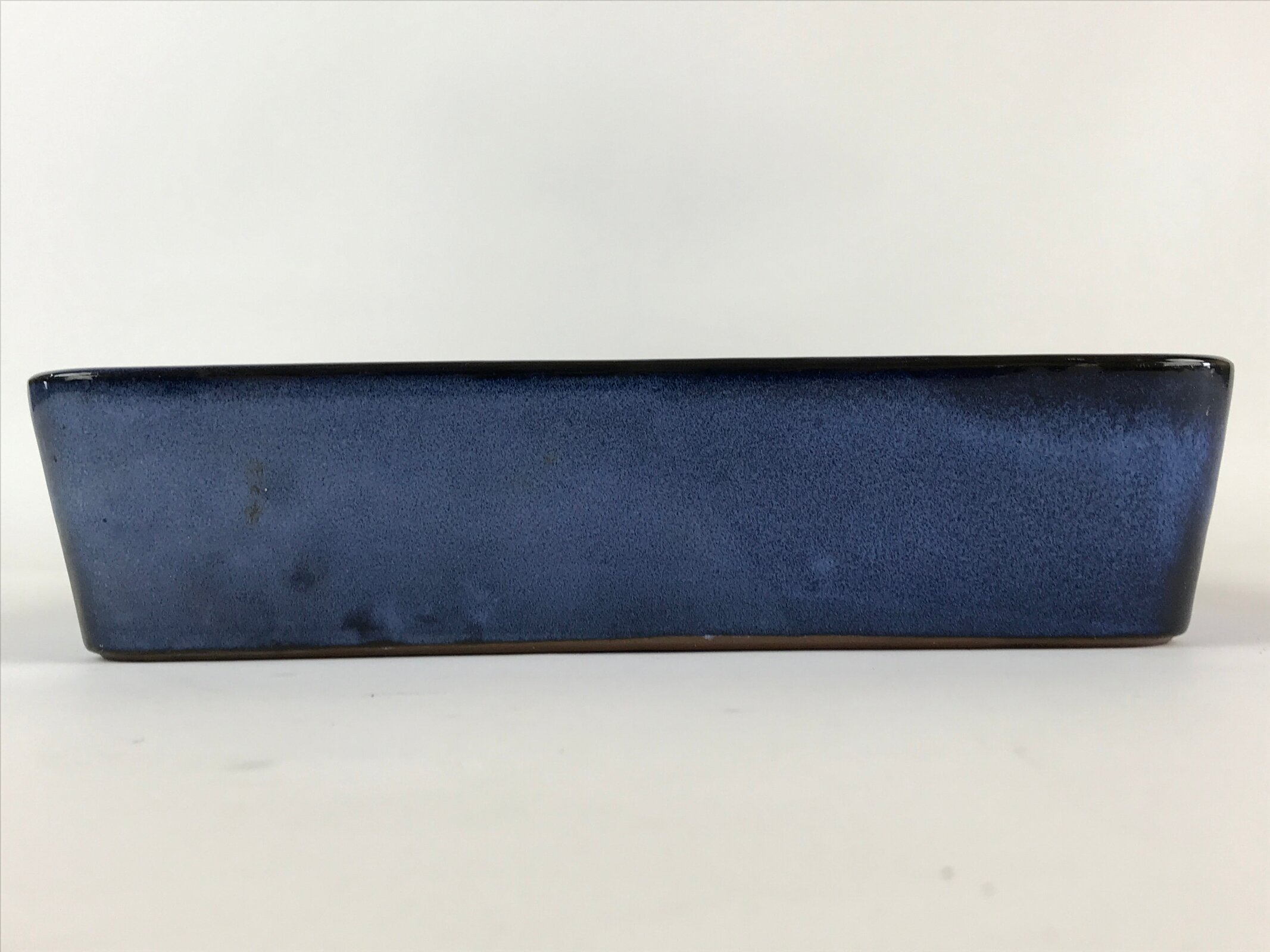 This is a Japanese vintage ceramic flower vase Suiban. It is a shallow flat vase used in the ikebana flower arrangement in Japan. Blue rectangle shape.