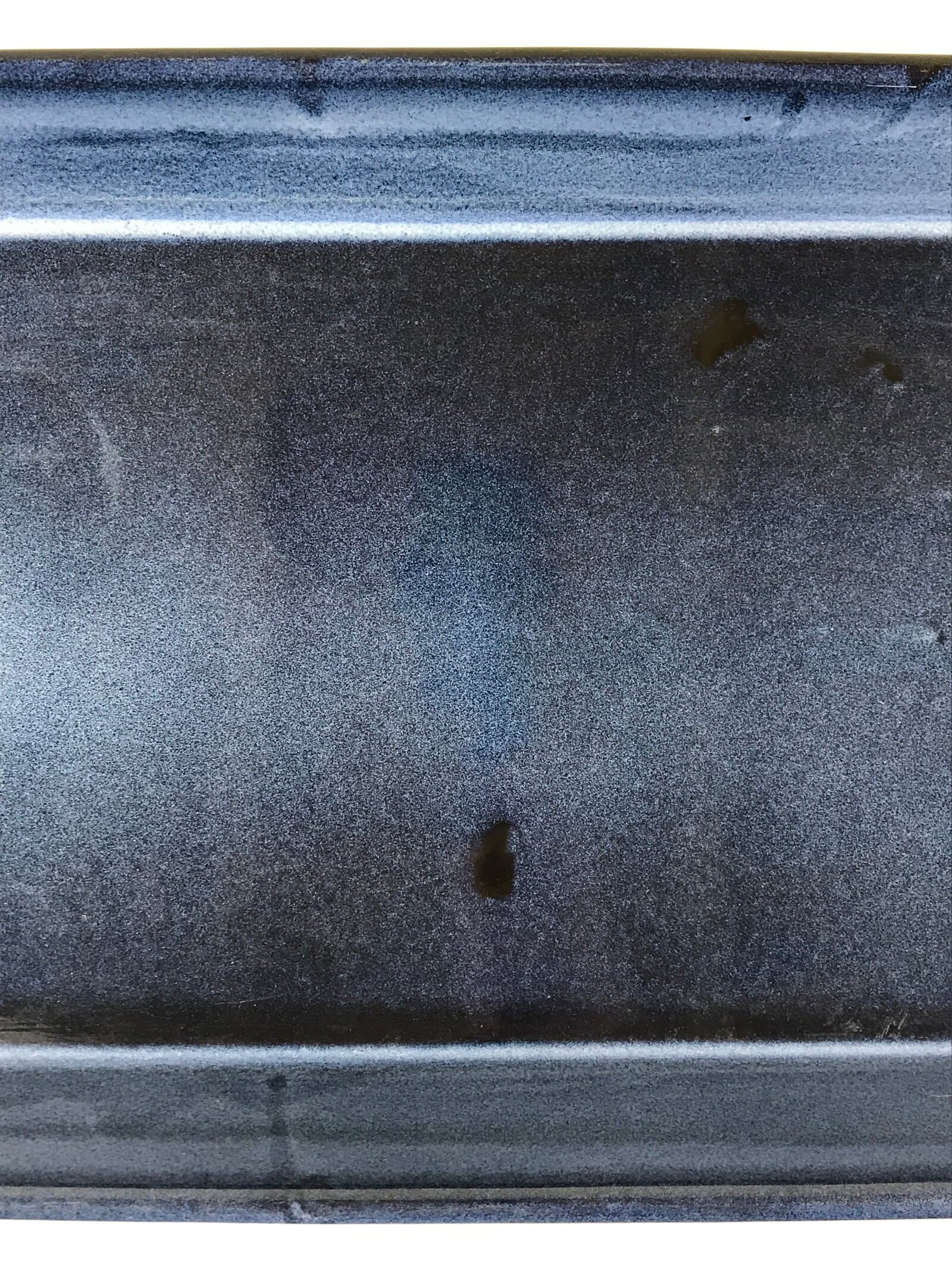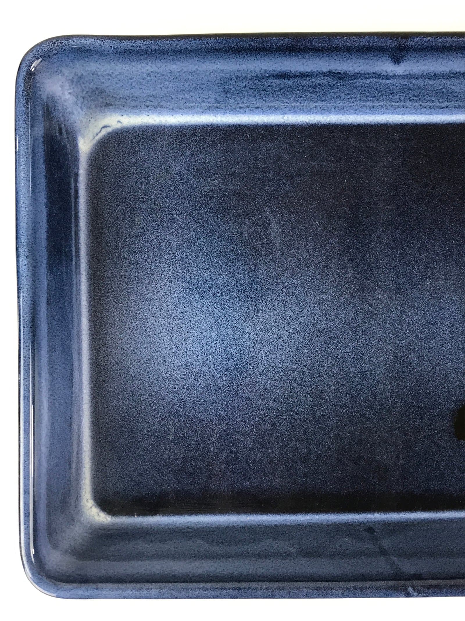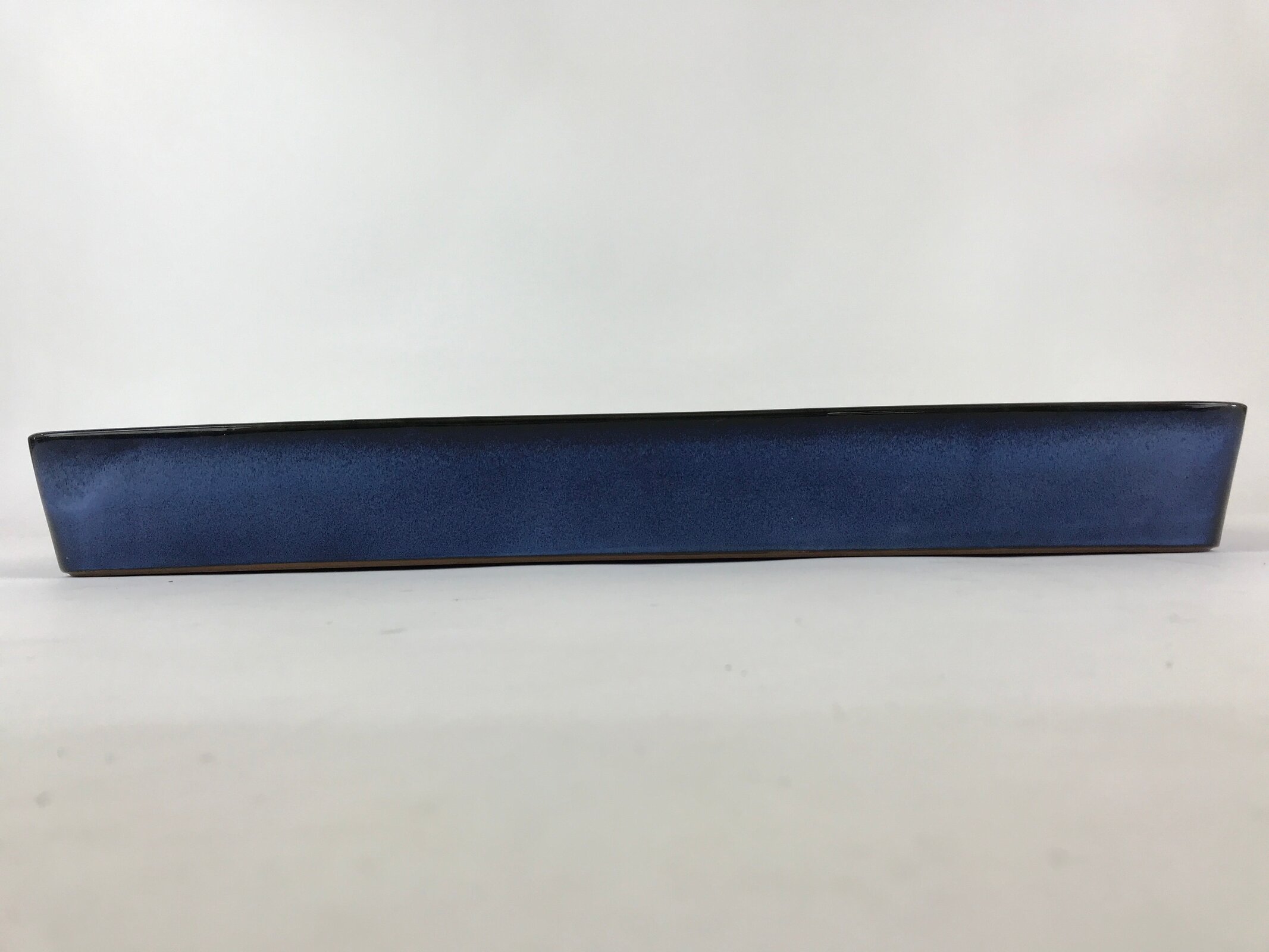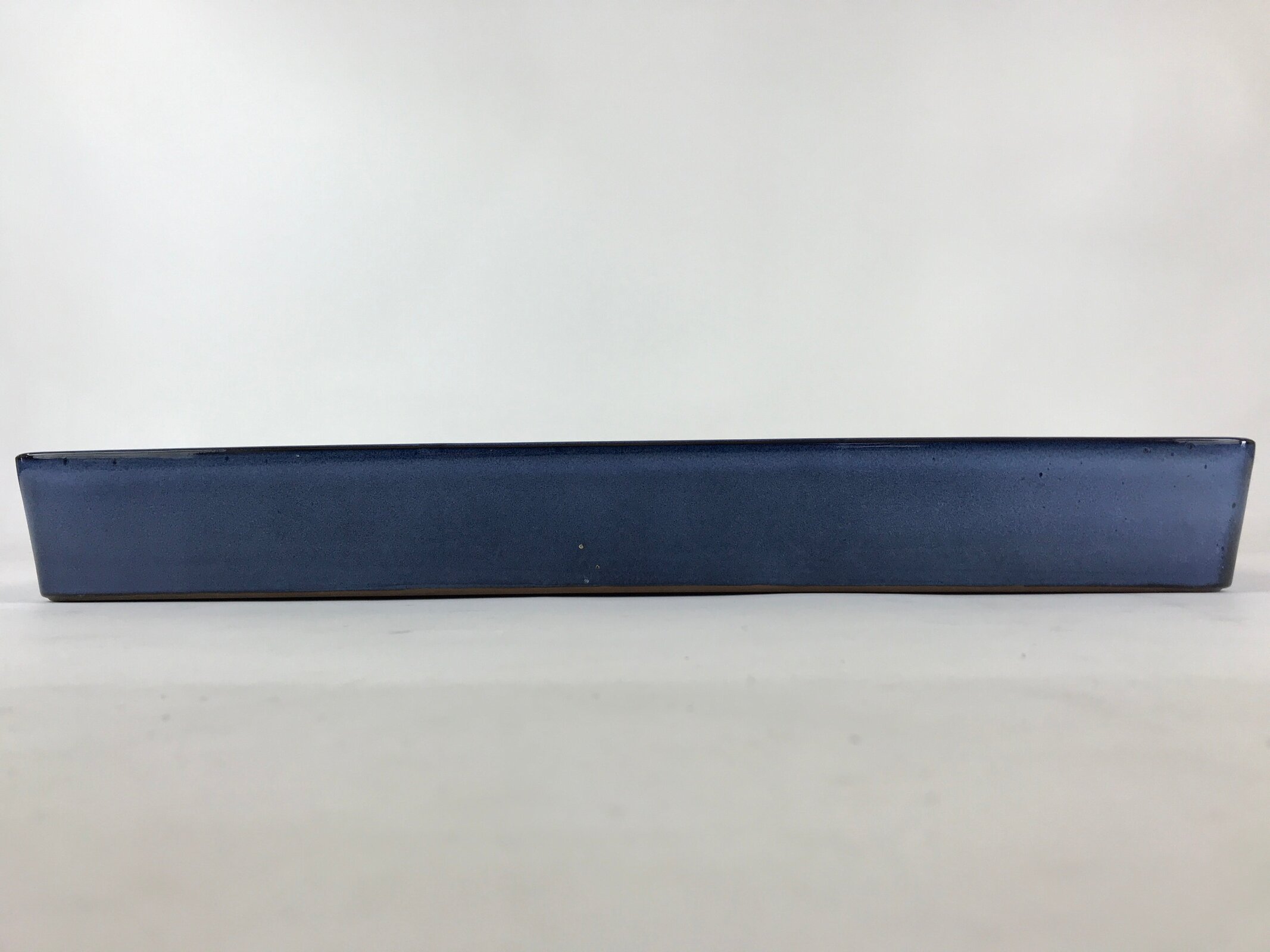 This is a Japanese vintage ceramic flower vase Suiban. It is a shallow flat vase used in the ikebana flower arrangement in Japan. Blue rectangle shape.