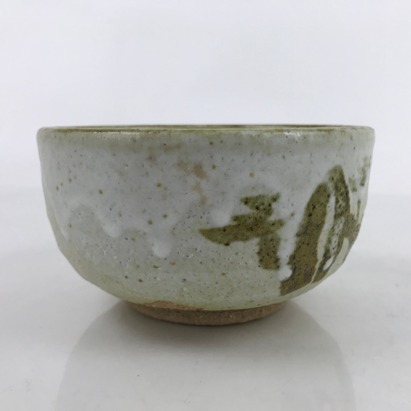 This is a vintage Japanese ceramic green tea bowl matcha chawan. It has a white glaze over a beige base. The body has a handpainted design with a whiter melting glaze from the rim. A dent called Chadamari is on the inside bottom. Around the foot, it is not glazed.