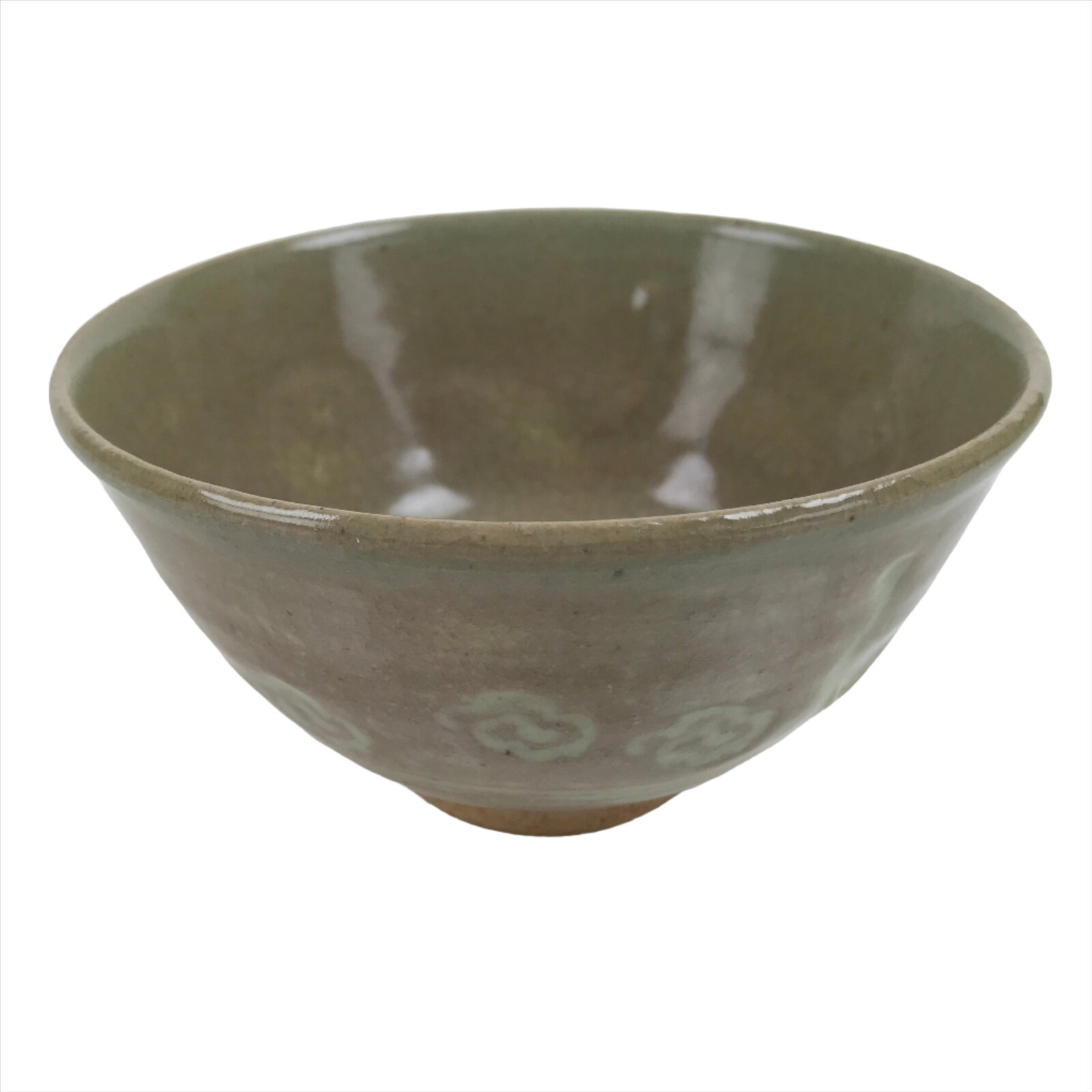 This is a vintage Japanese ceramic green tea bowl, or matcha chawan. It is a brown glaze with green spots. The inside is also mostly green with crackles. It has engraved white flowers and ducks all around and is signed on the bottom. It is sturdy and easy to handle.