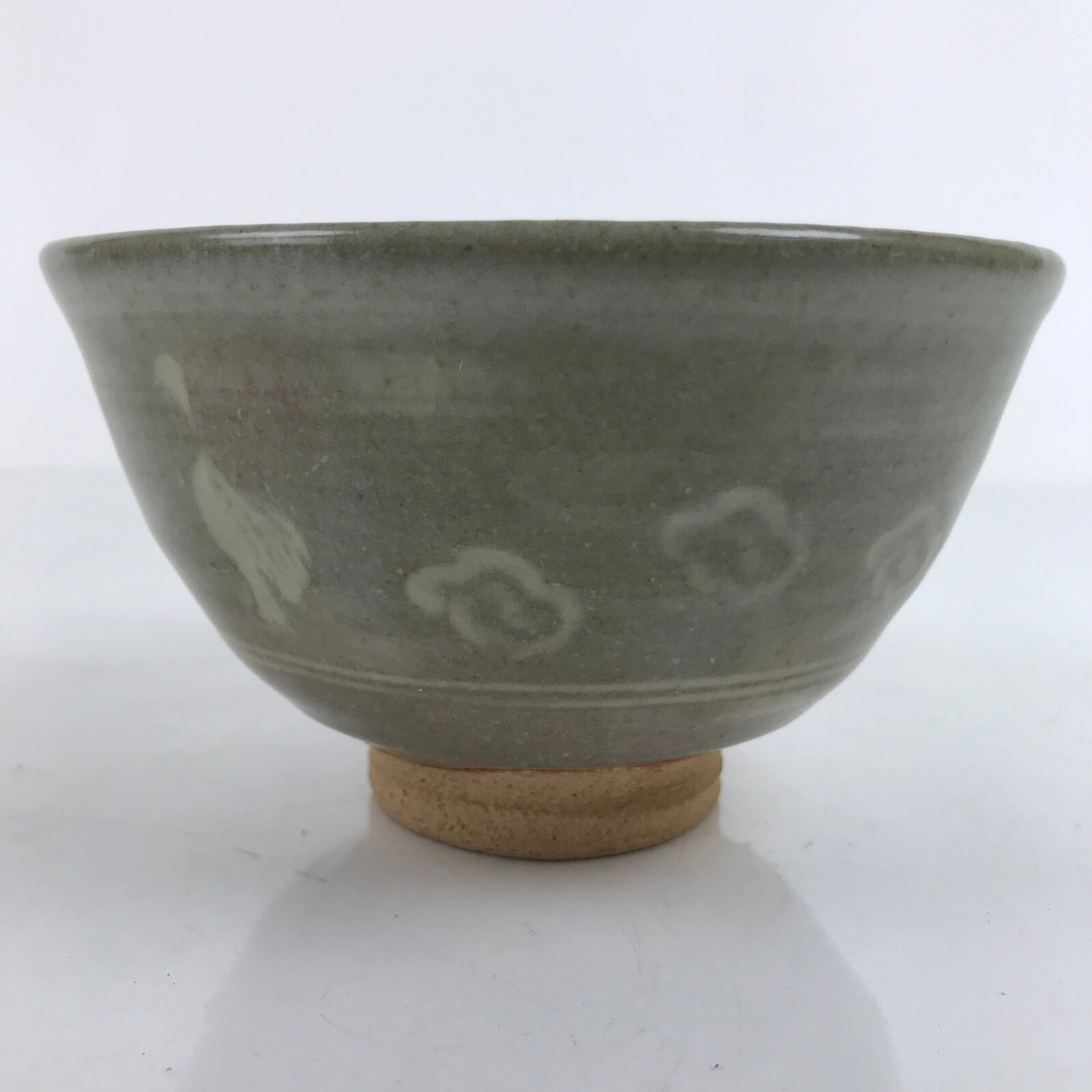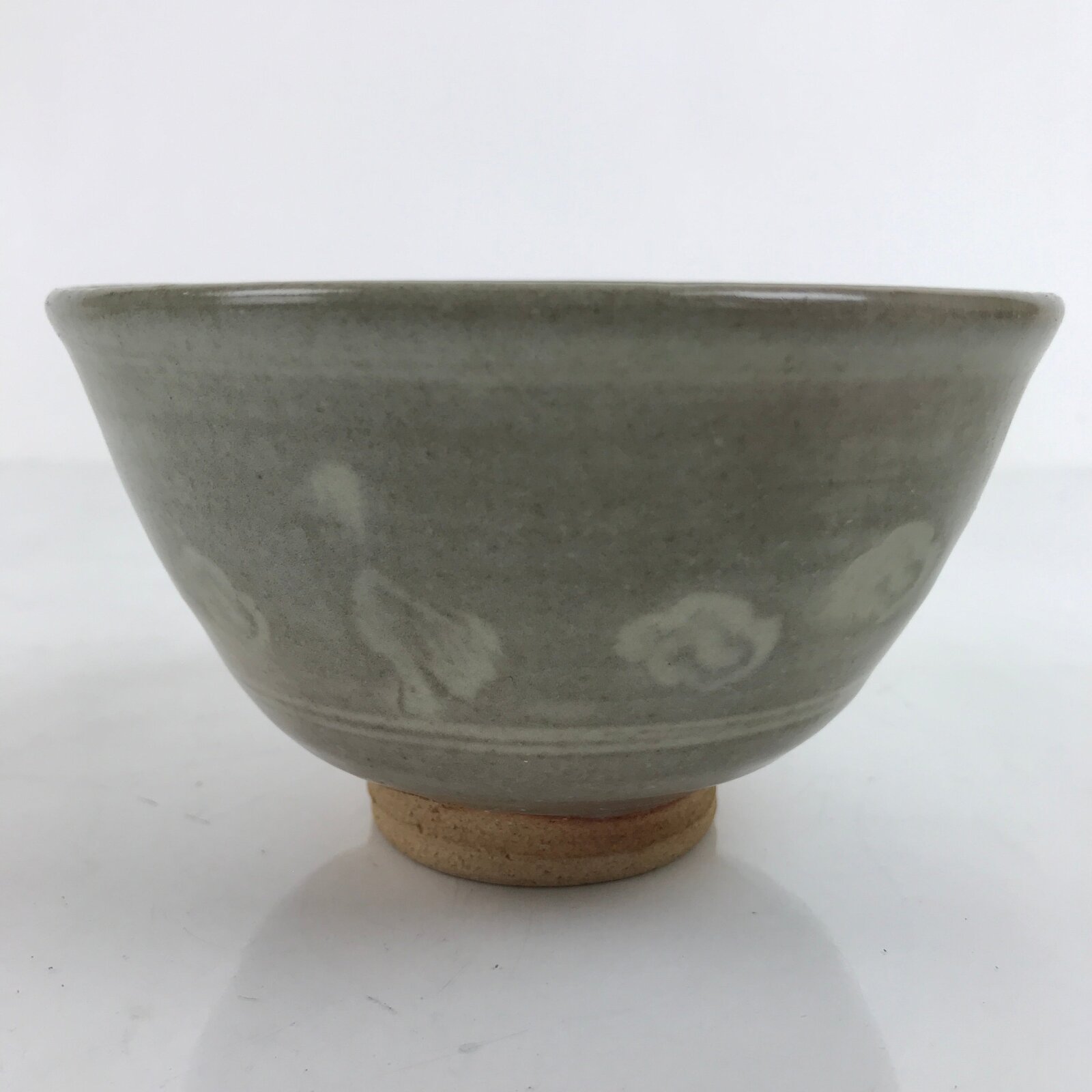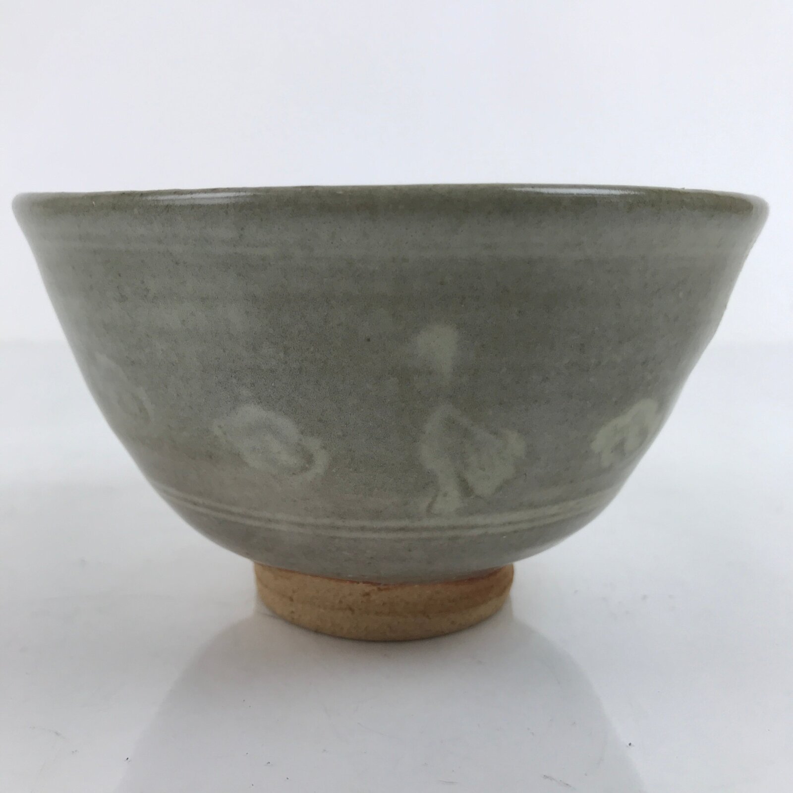 This is a vintage Japanese ceramic green tea bowl, or matcha chawan. It is a grayish green matte glaze with engraved white flowers and ducks. It is signed on the bottom. It is sturdy and easy to handle.