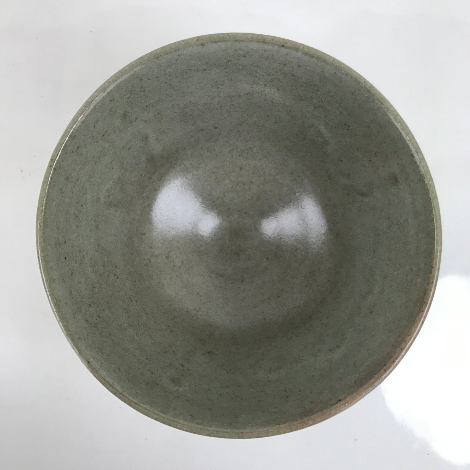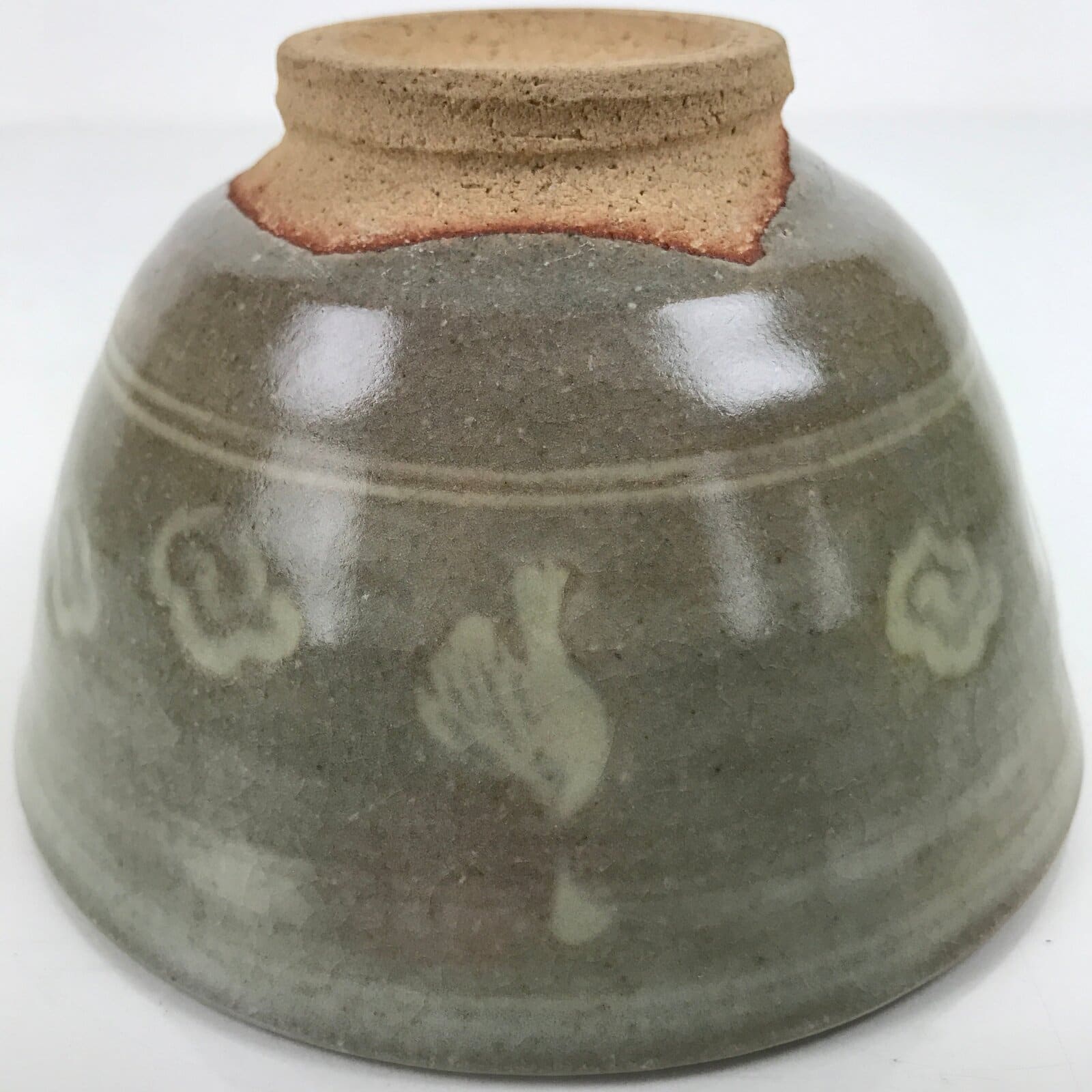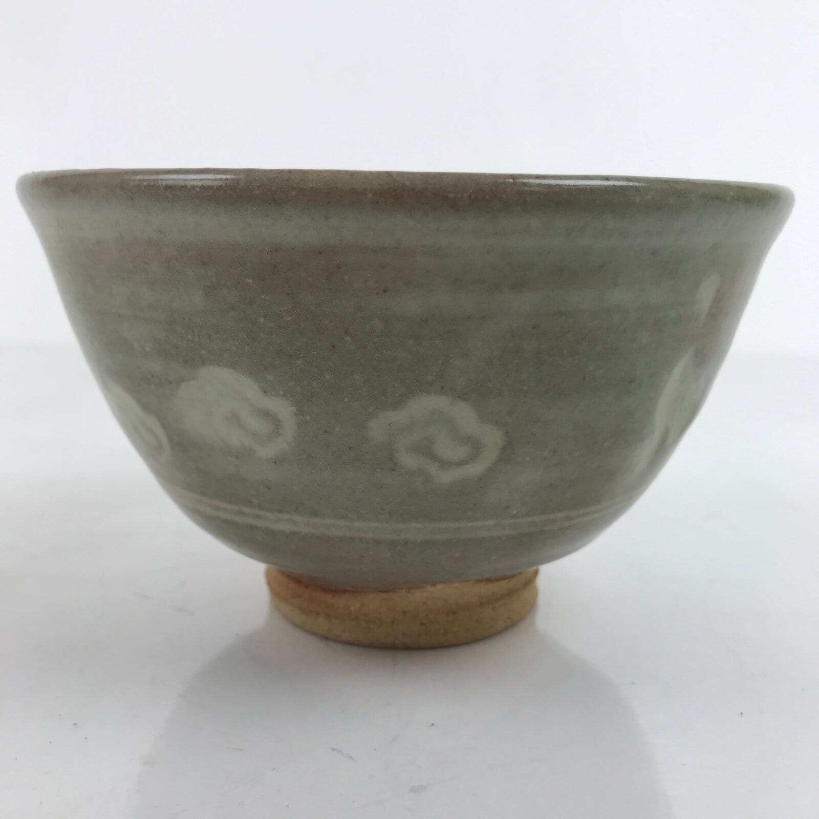 This is a vintage Japanese ceramic green tea bowl, or matcha chawan. It is a grayish green matte glaze with engraved white flowers and ducks. It is signed on the bottom. It is sturdy and easy to handle.