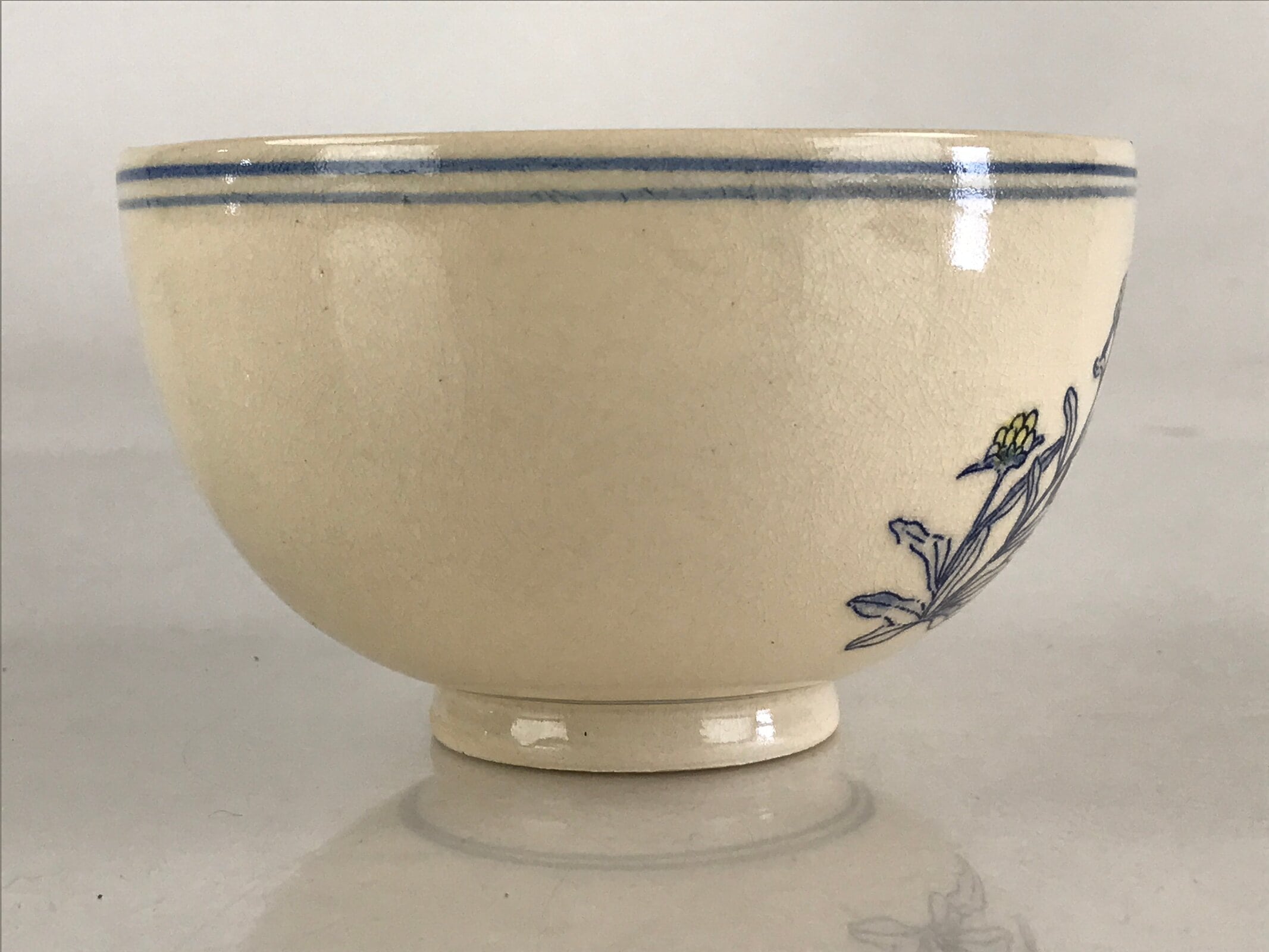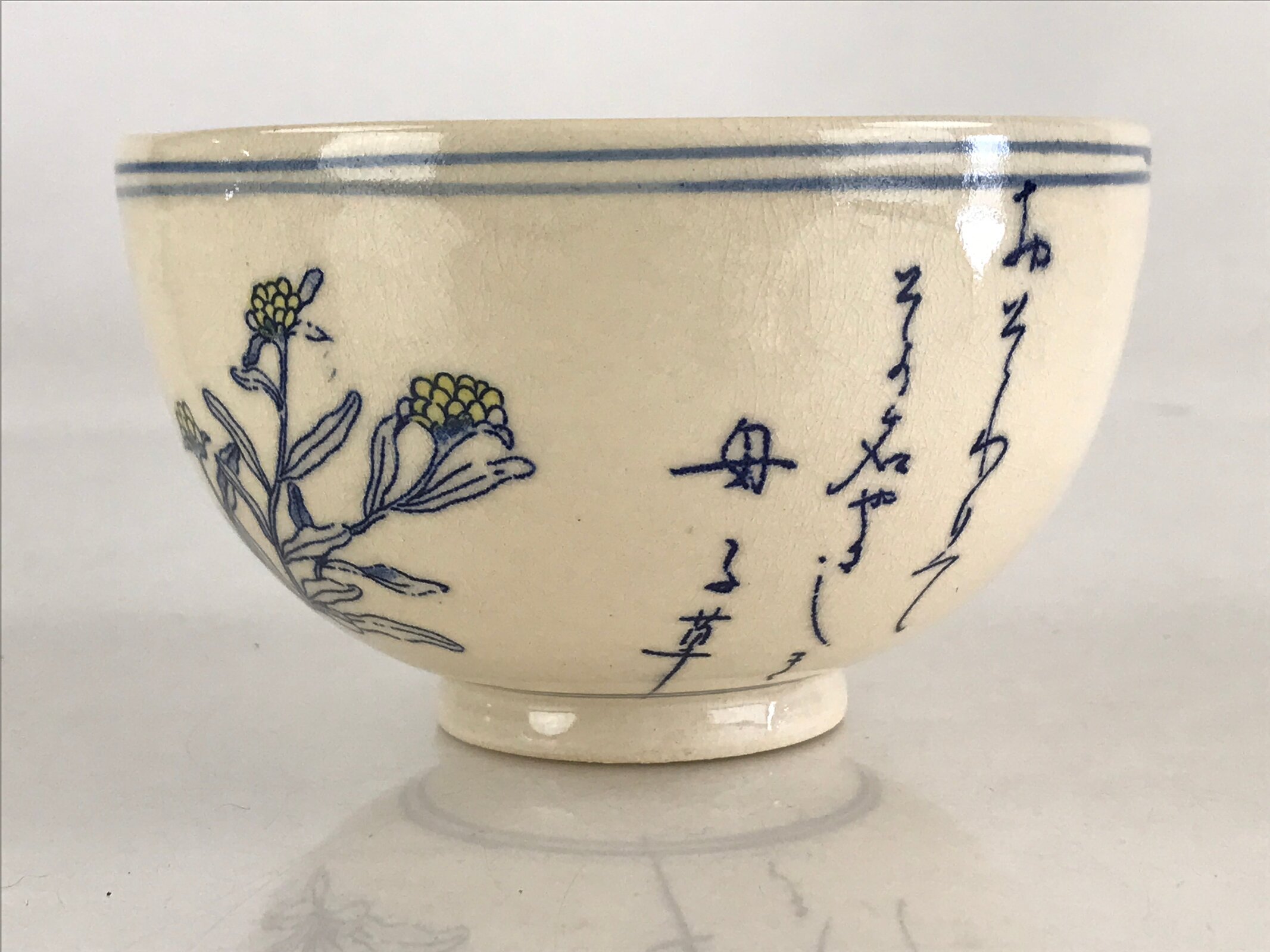This is a Japanese vintage green tea bowl, Matcha Chawan. Pseudognaphalium affine flower and poetry drew on the bowl. This flower is called Hahakogusa (Mother and child) in Japanese. Poetry means “Someone taught me this flower’s name is Hahakogusa. What a gentle name”. Green tea bowls are not only for drinking tea these are also for appreciating tea bowls as works of art. These have various sizes and styles. Shallow bowls are used in summer which is for the tea to cool quickly, and deep bowls are used in winter to keep the tea hot for a longer time.