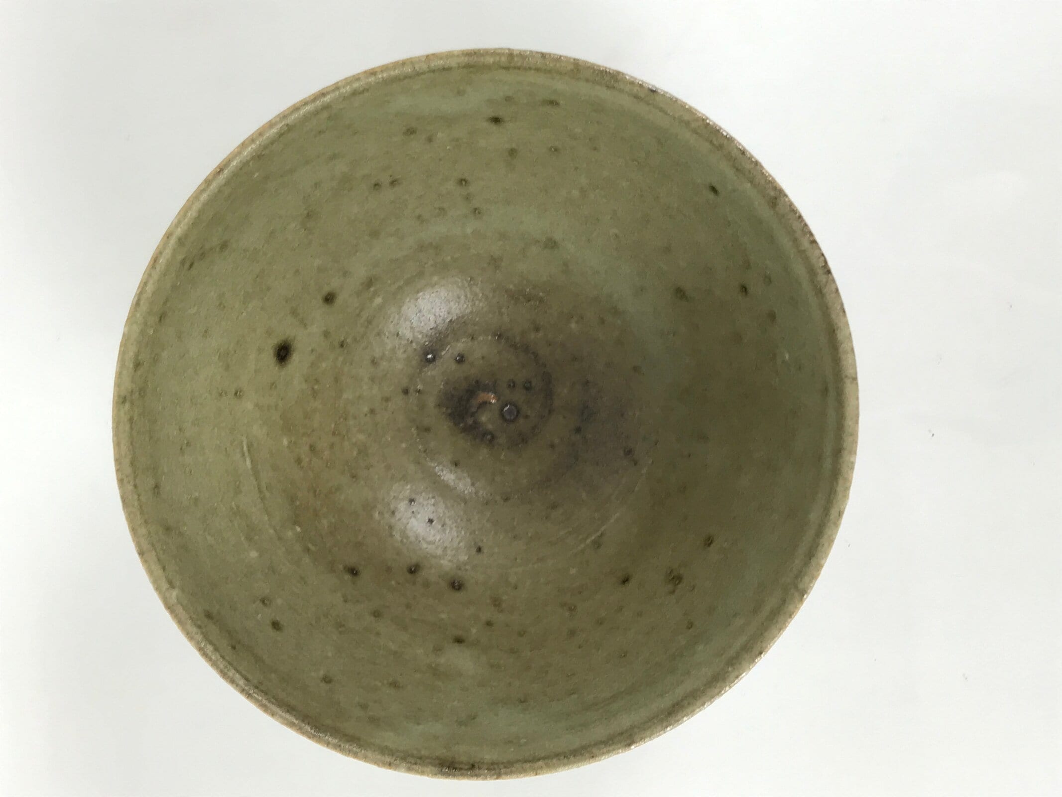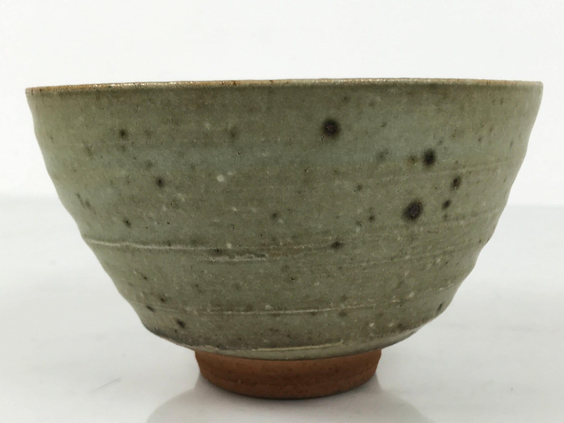 This is a vintage Japanese ceramic green tea bowl or matcha chawan. This bowl has a grayish-green glaze on a brown base. It features wheel-throwing rings (rokurome), black spots, and glaze drips. There is a signature around the foot.