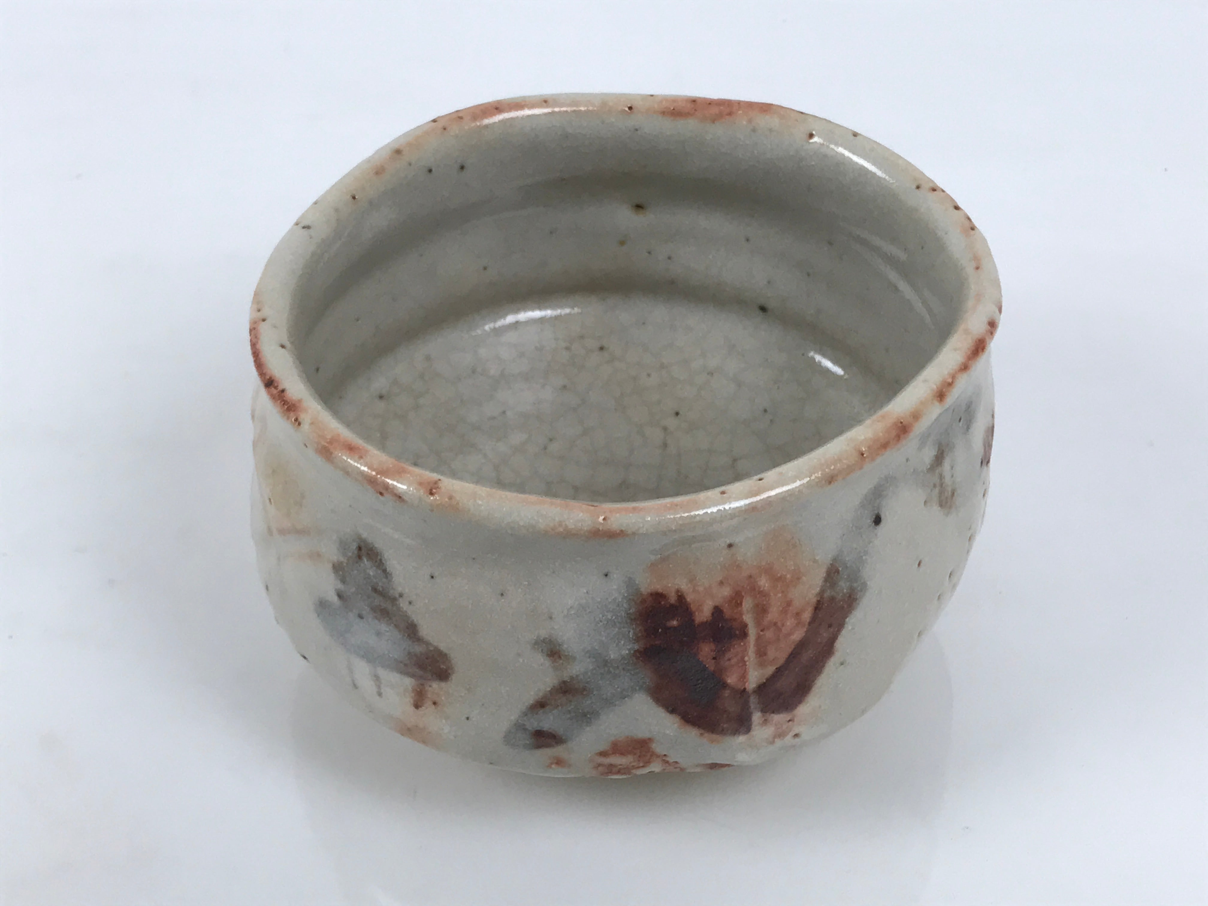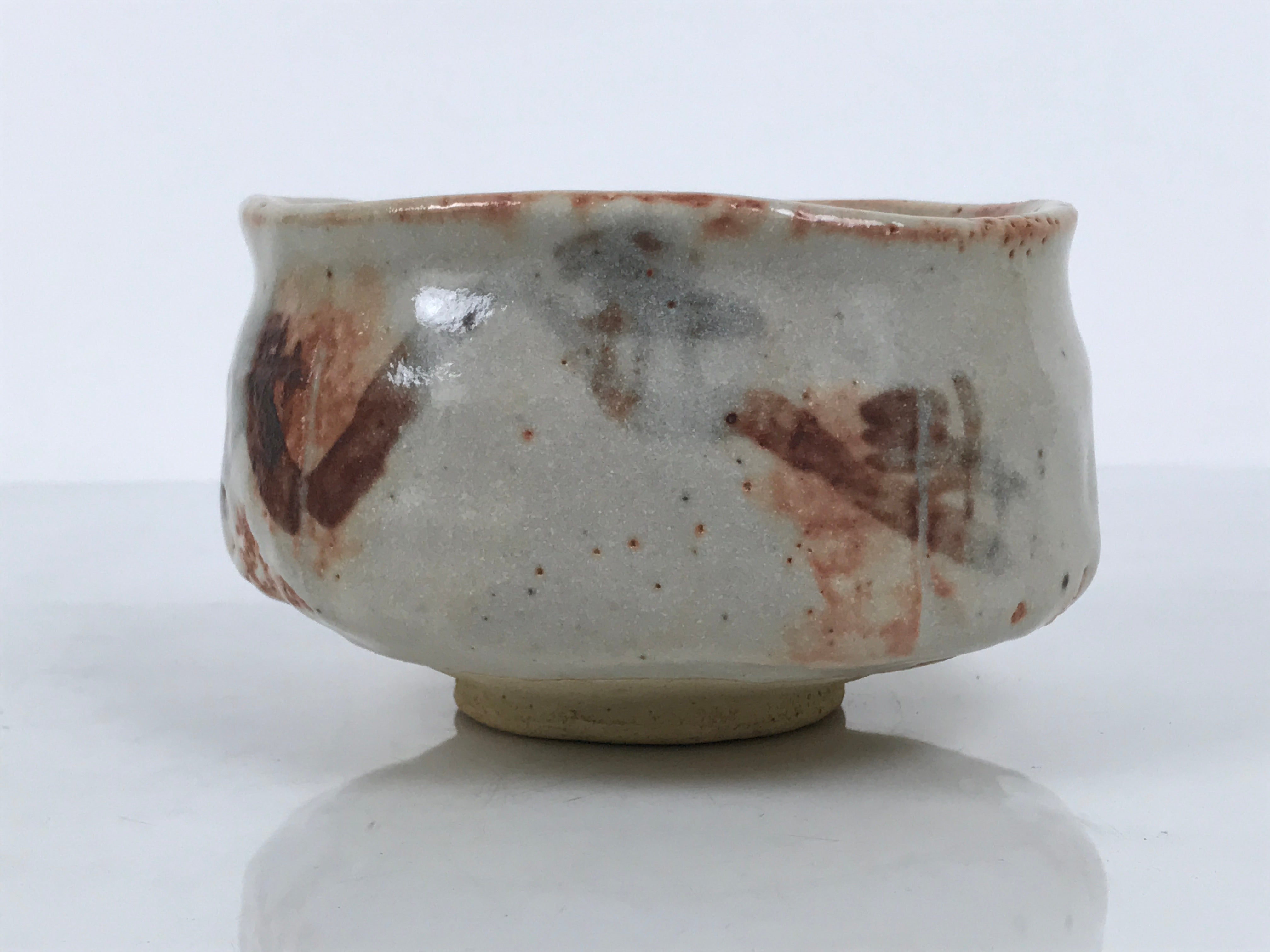This is a vintage Japanese ceramic green tea bowl or matcha chawan. This piece is a perfect example of classic shino style, with a white glaze, pockmarks, and orangish-brown accents. It has a brown design on the side and crackles inside the bottom. The shape is slightly irregular, hand-formed with an organic profile, in Raku style. There is a signature around the foot. It is sturdy and easy to handle.