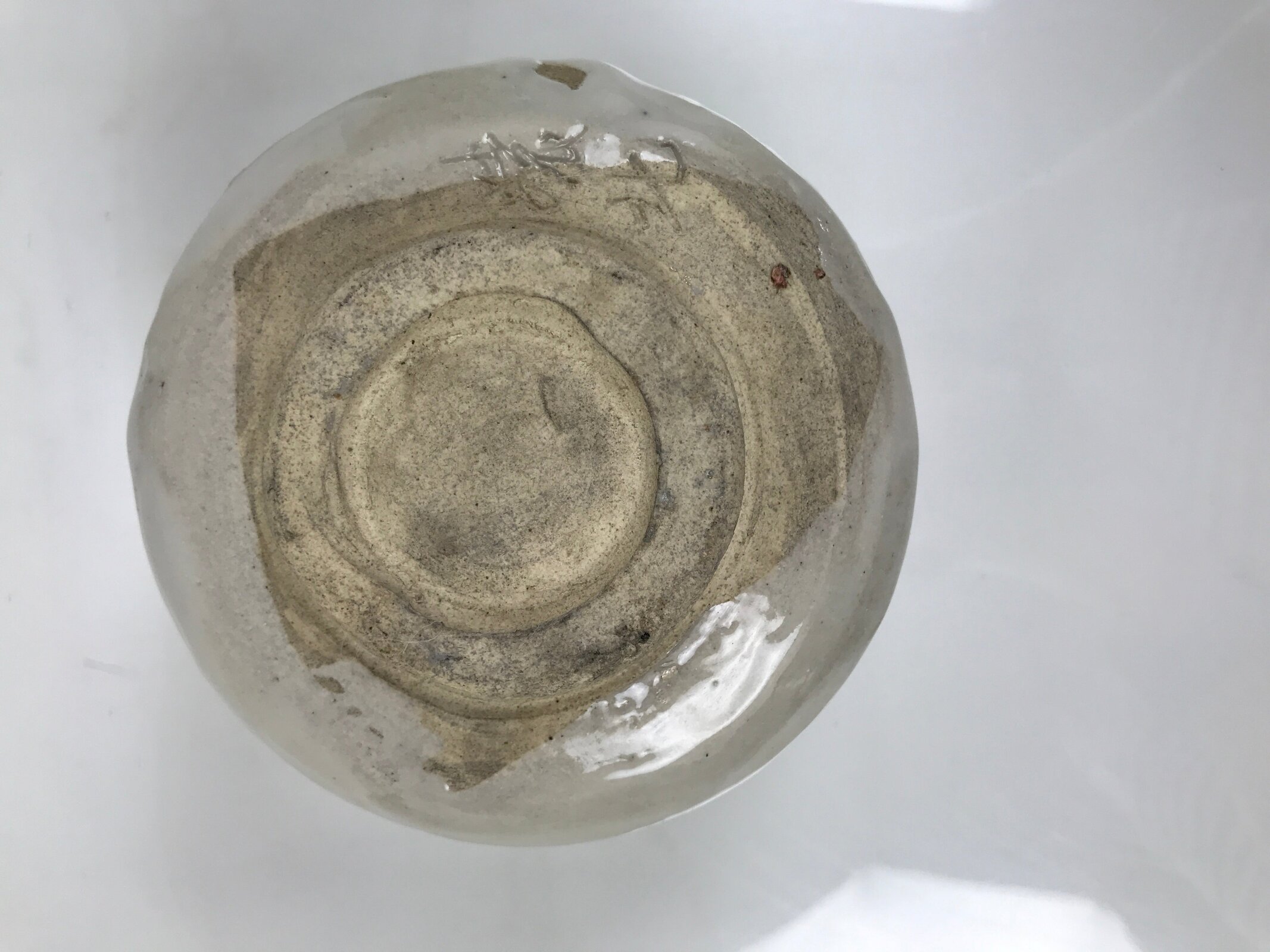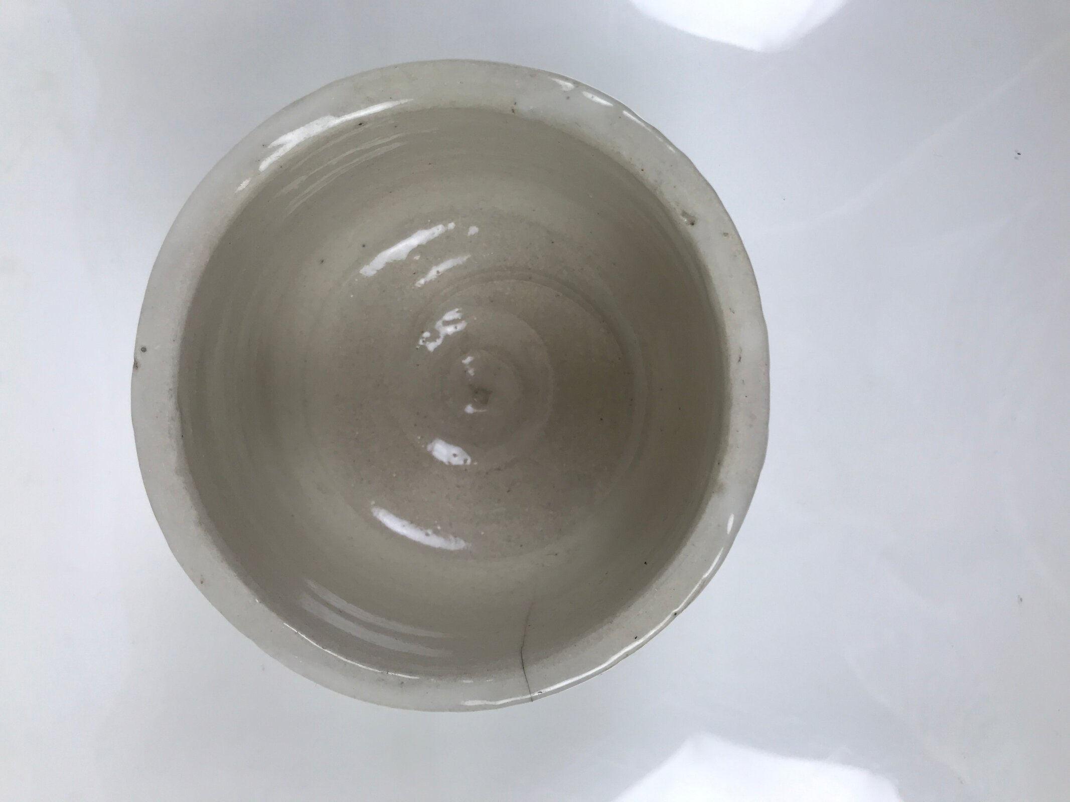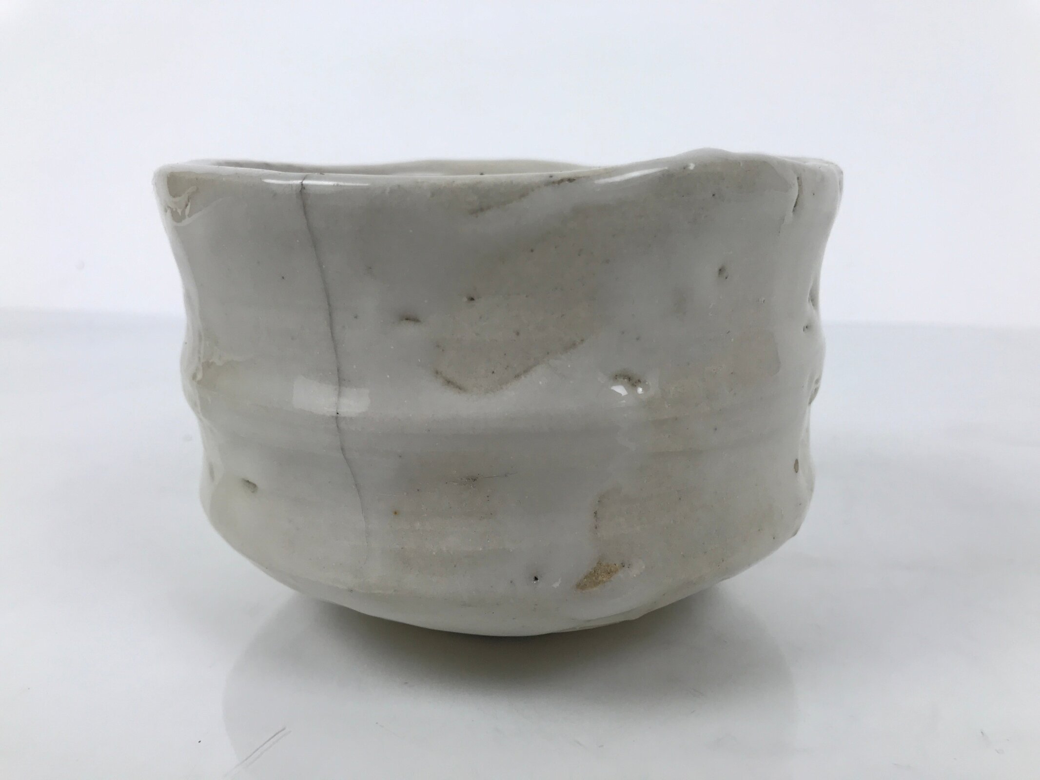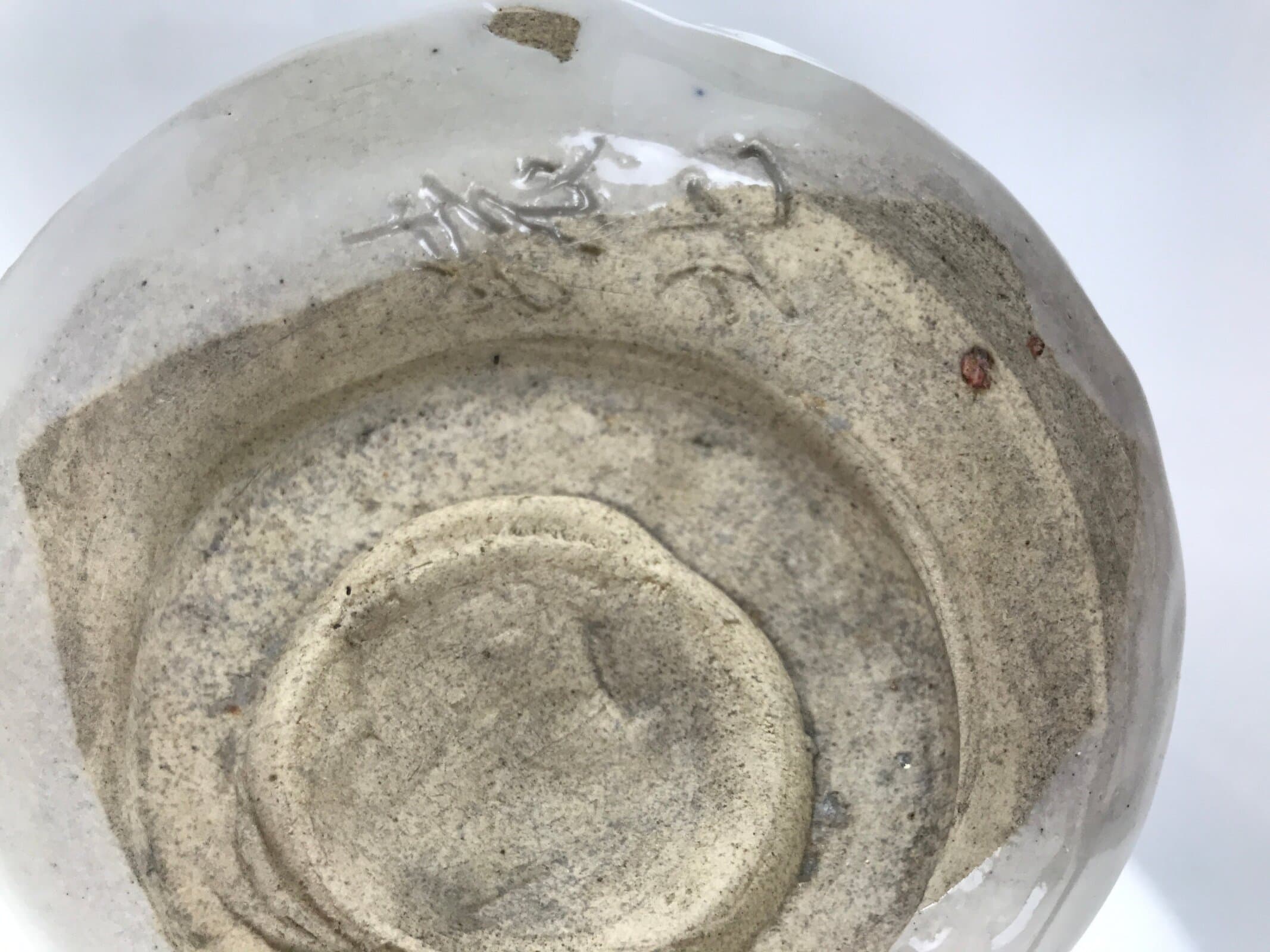 This is a vintage Japanese ceramic green tea bowl or matcha chawan. This thick bowl is glossy white. It has a Rokurome pattern on the side and hand-formed irregularity on the rim. There is a signature near the foot.
