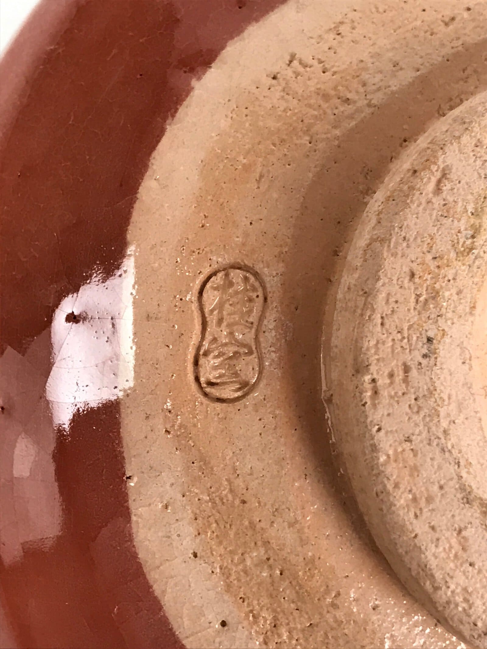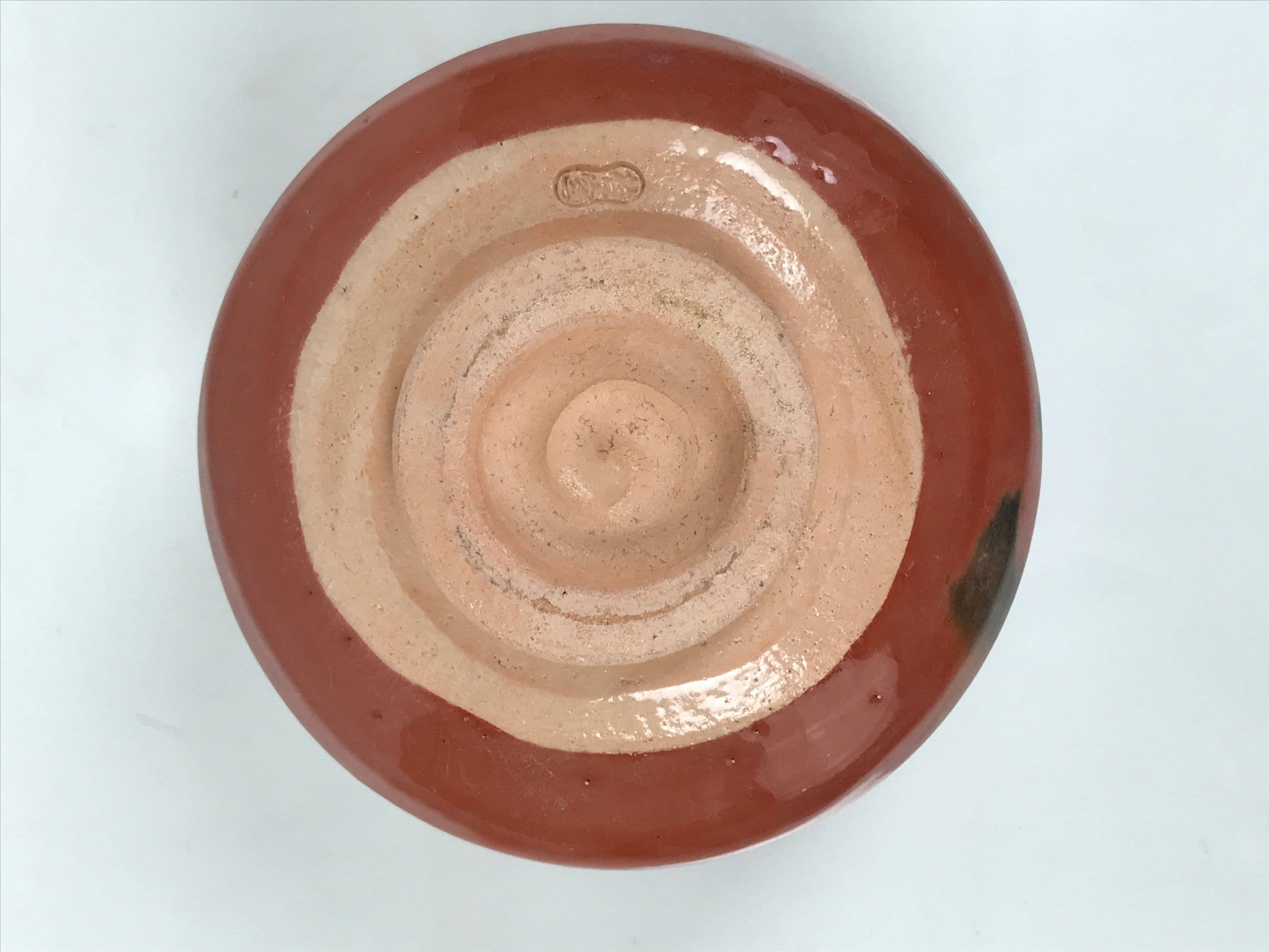 This is a vintage Japanese ceramic green tea bowl or matcha chawan in the Raku ware style. This bowl has a brownish-red glossy glass glaze with brown spots. The glaze makes an off-white glaze drip inside the bowl. There is a sign on the foot.