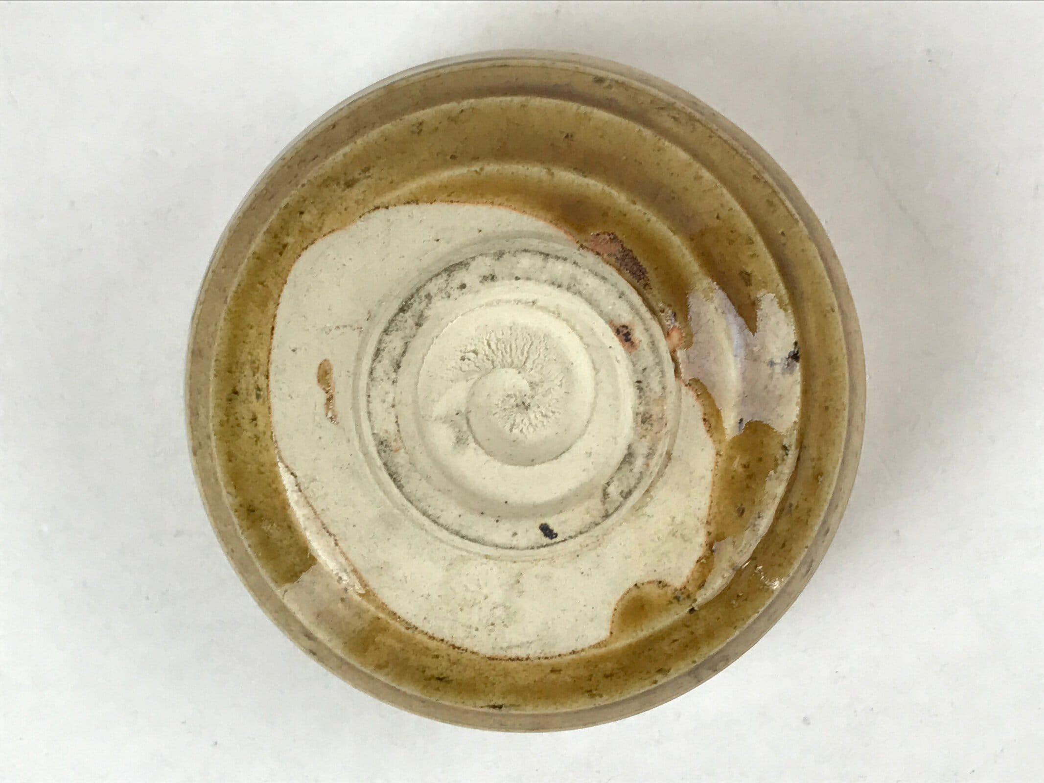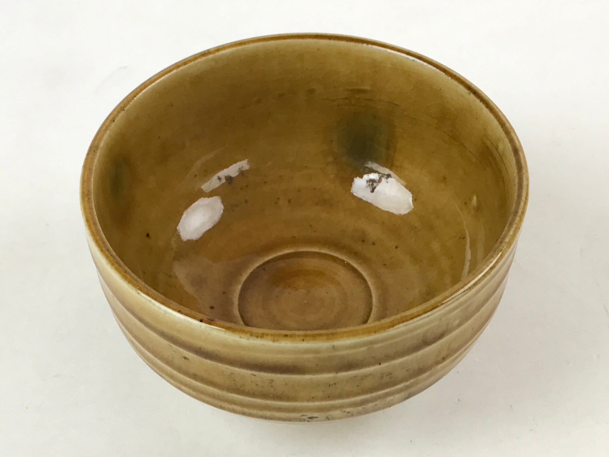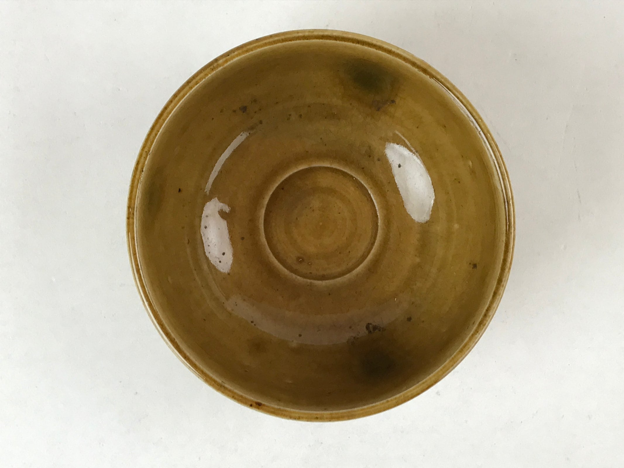 This is a vintage Japanese ceramic green tea bowl, Matcha Chawan. It is dark yellow with some olive-green highlights. This bowl has a glossy finish. This sturdy bowl is easy to handle. Green tea bowls are traditionally used for preparing and drinking green tea during tea ceremonies but can be used in many scenes of modern everyday life.