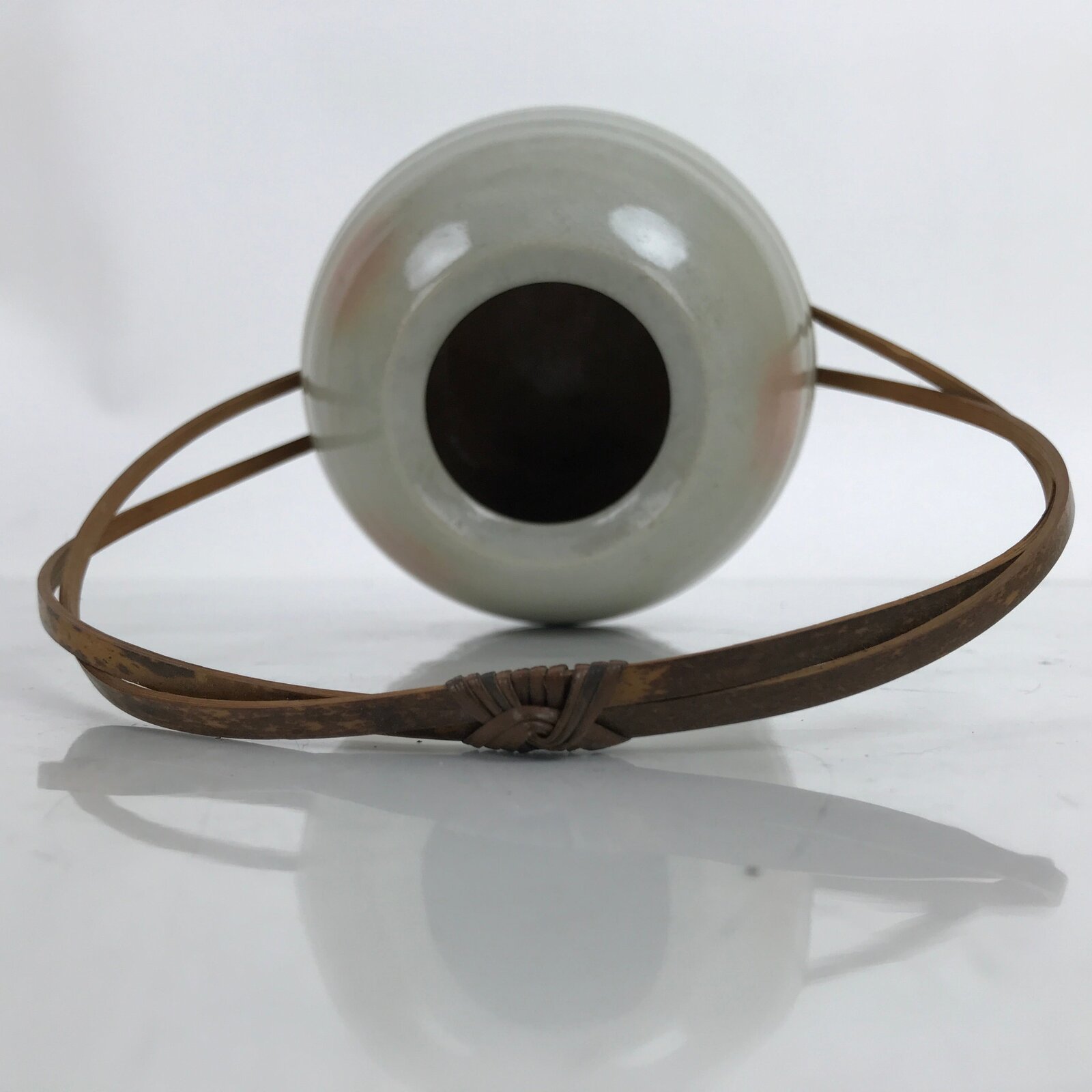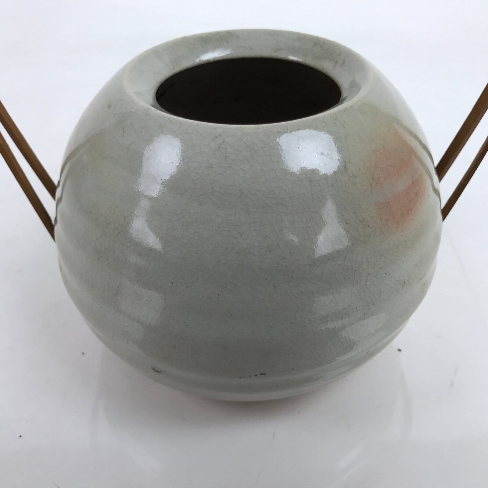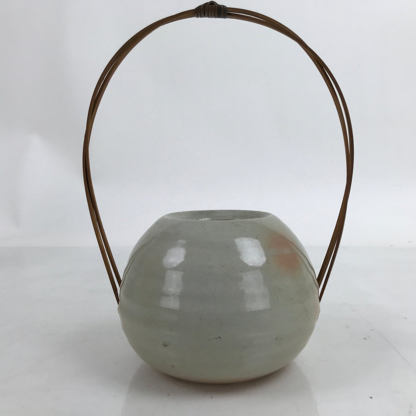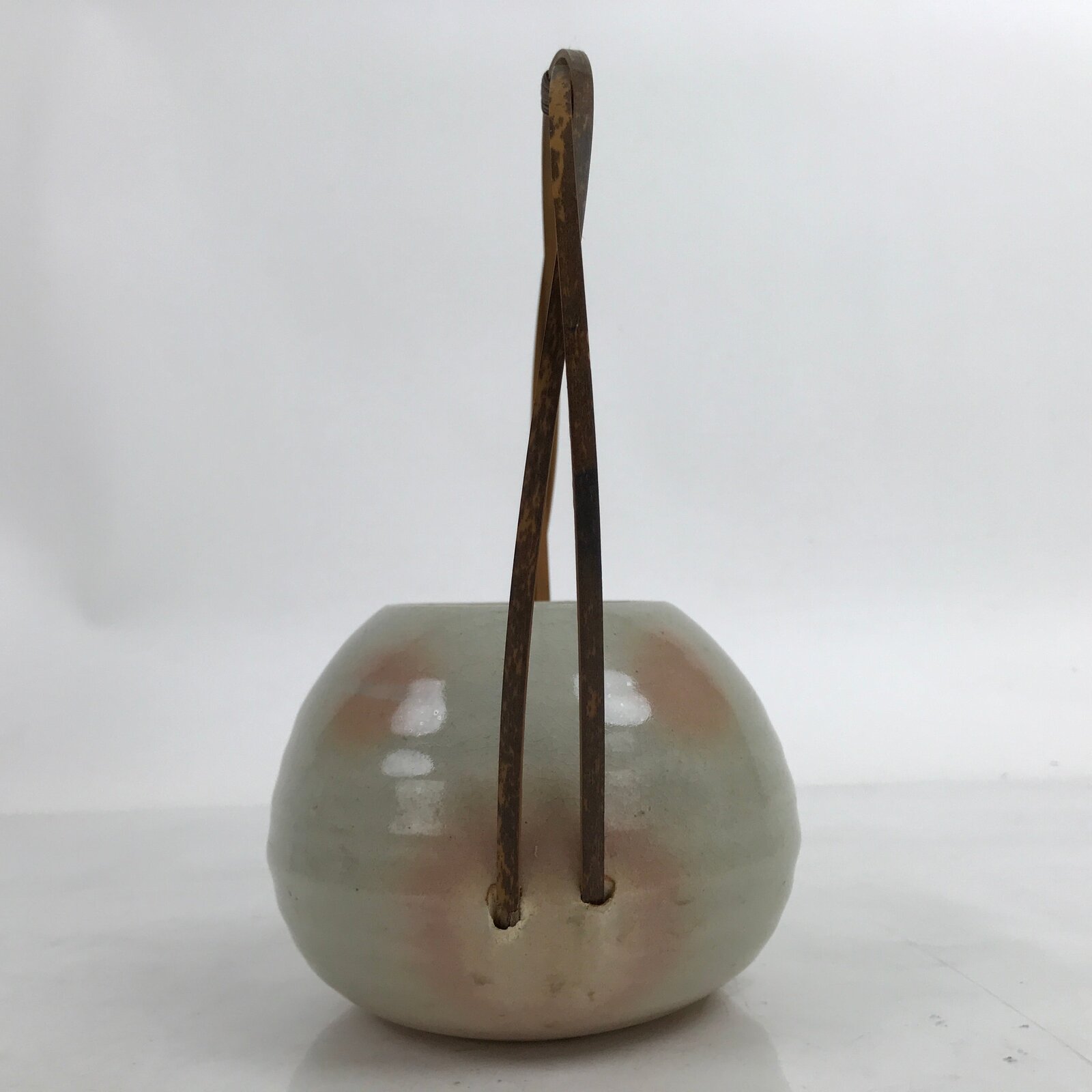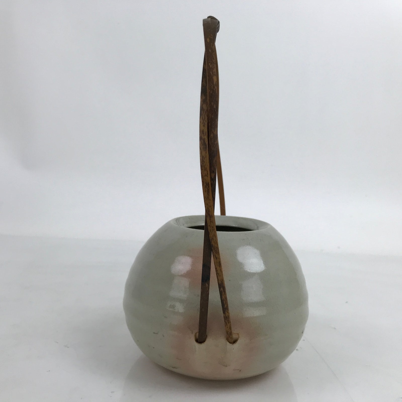 This is a vintage Japanese ceramic flower vase, or kabin. This Hagi ware vase is a beautiful example of ceramic and bamboo fusion. The vase is short and round with a gray glaze and little pink spots. The handle is made of two arching strip of bamboo that fit inside holes on the sides of the vase and glued in place. It can be used for all types of flower arrangements both ikebana and casual.