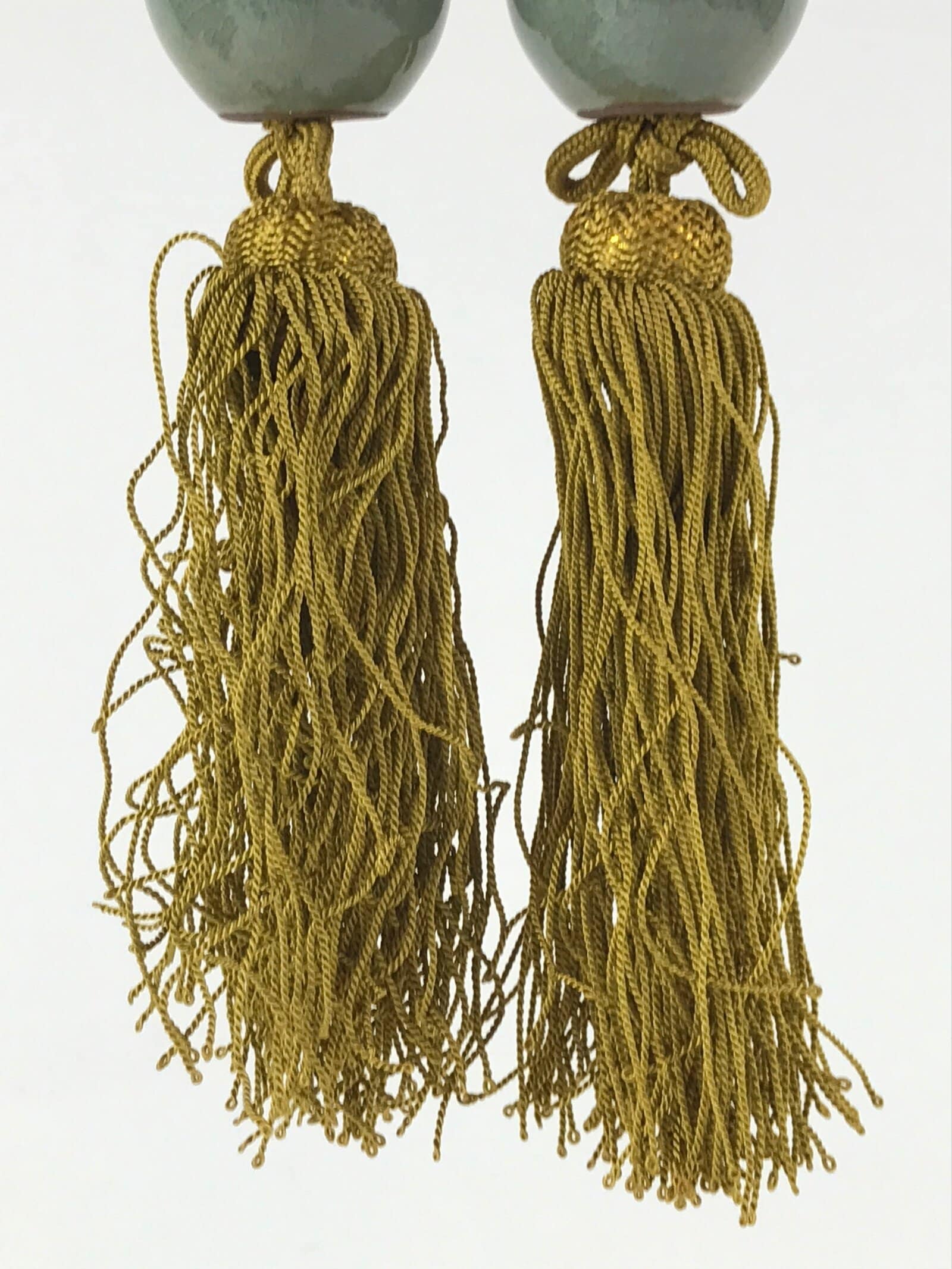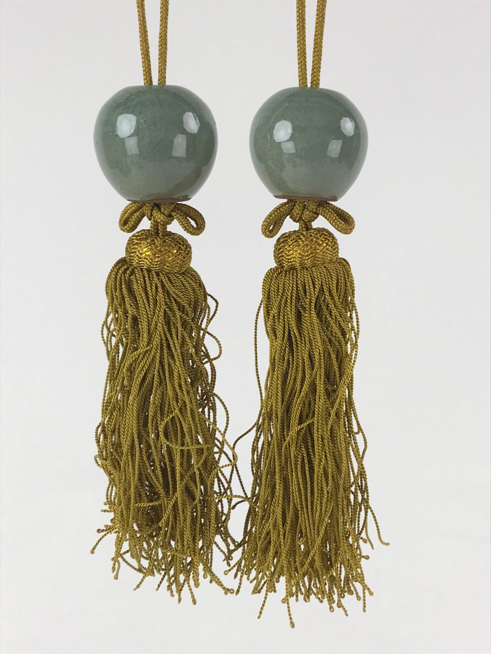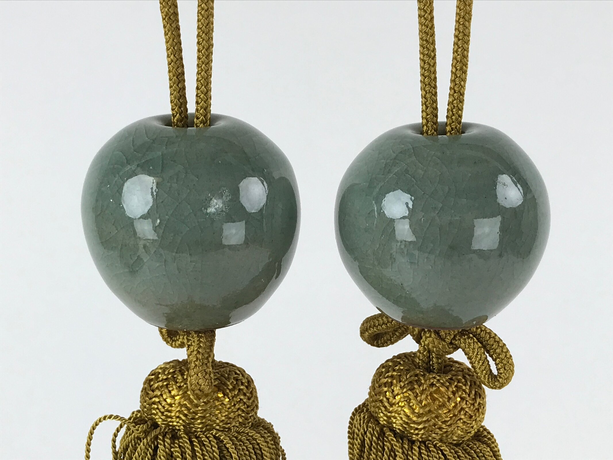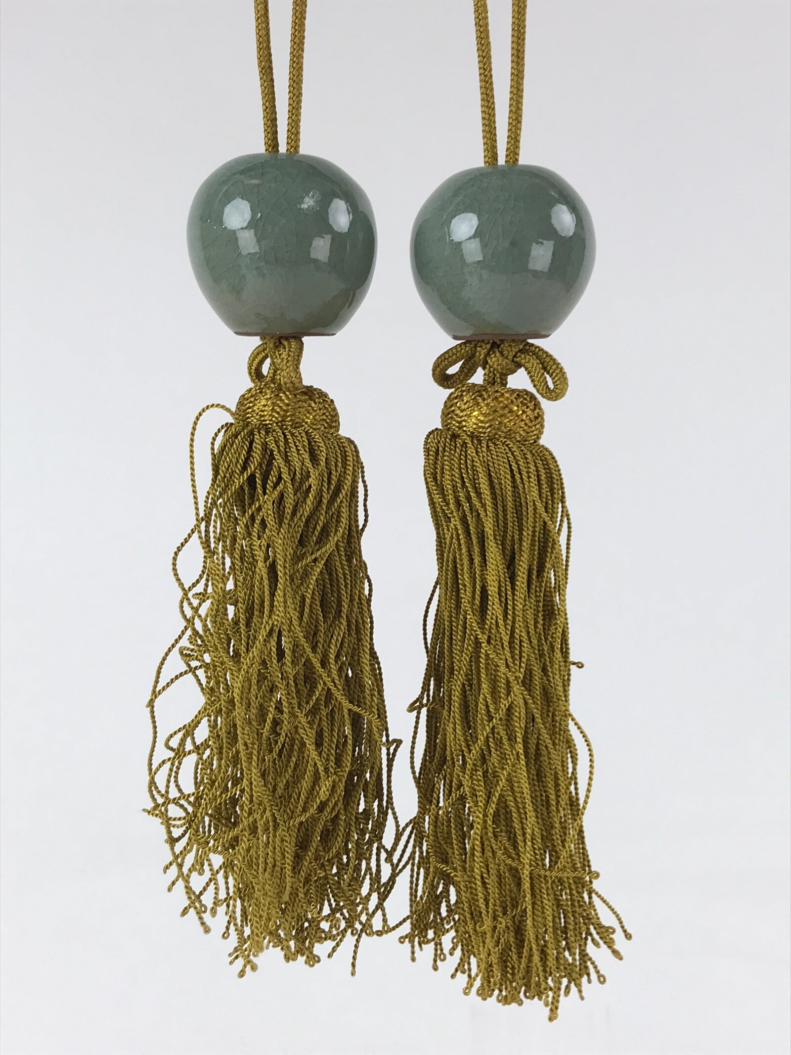 This is a pair of Japanese hanging scroll (kakejiku) weights, fuchin. With a crackled green glaze, the main feature of this piece is round ceramic spheres paired with golden silk tassels. Fuchin is a decoration that hangs on both ends of the bottom of a hanging scroll. It’s a decoration and a weight.