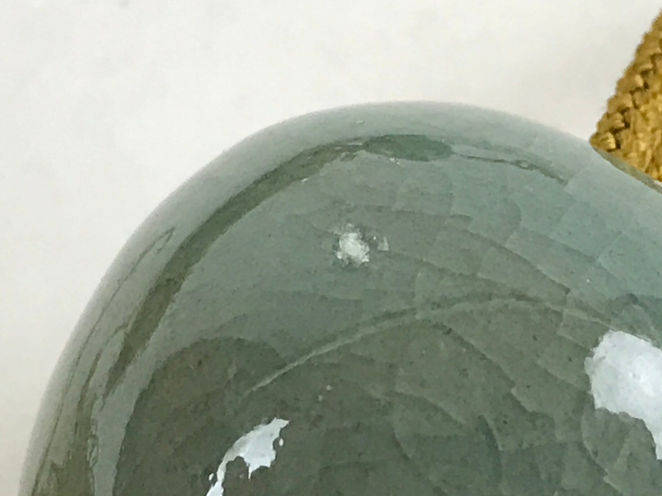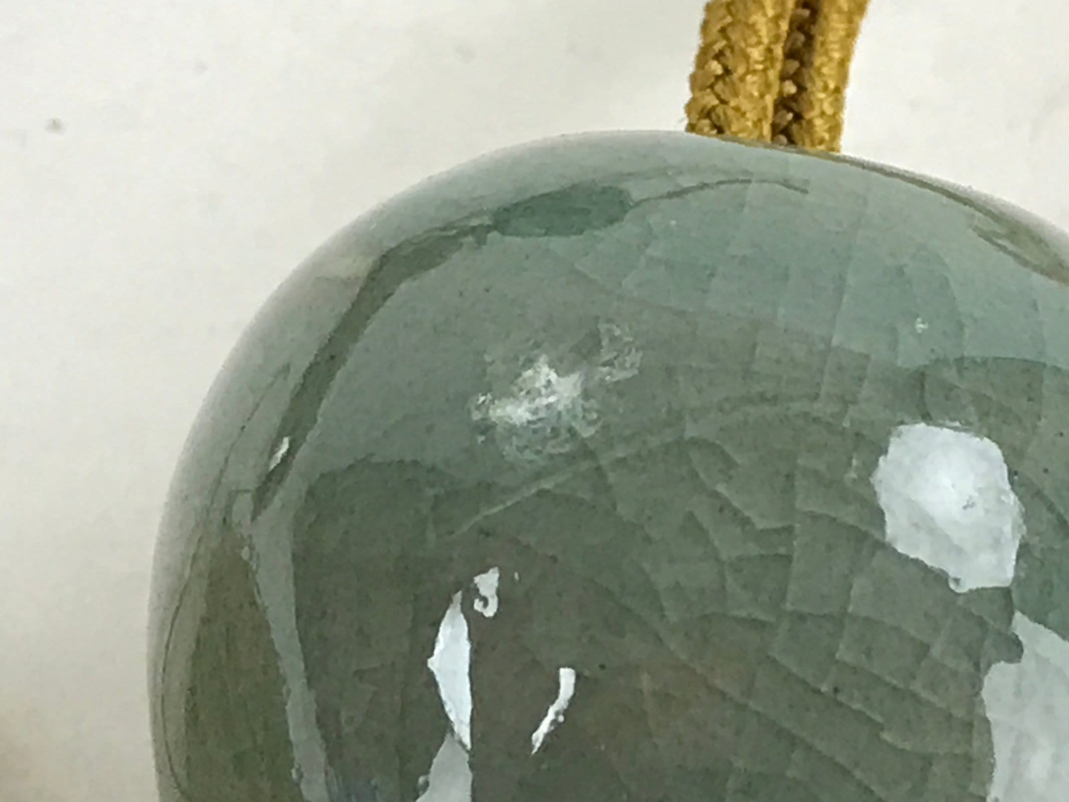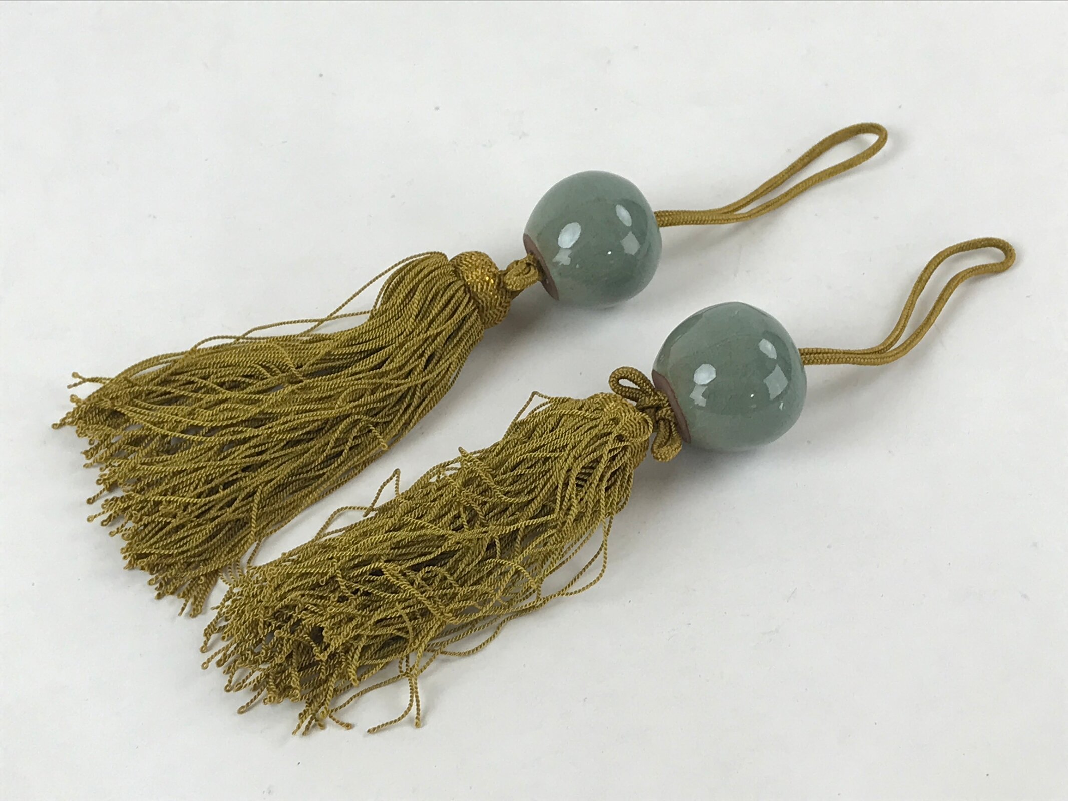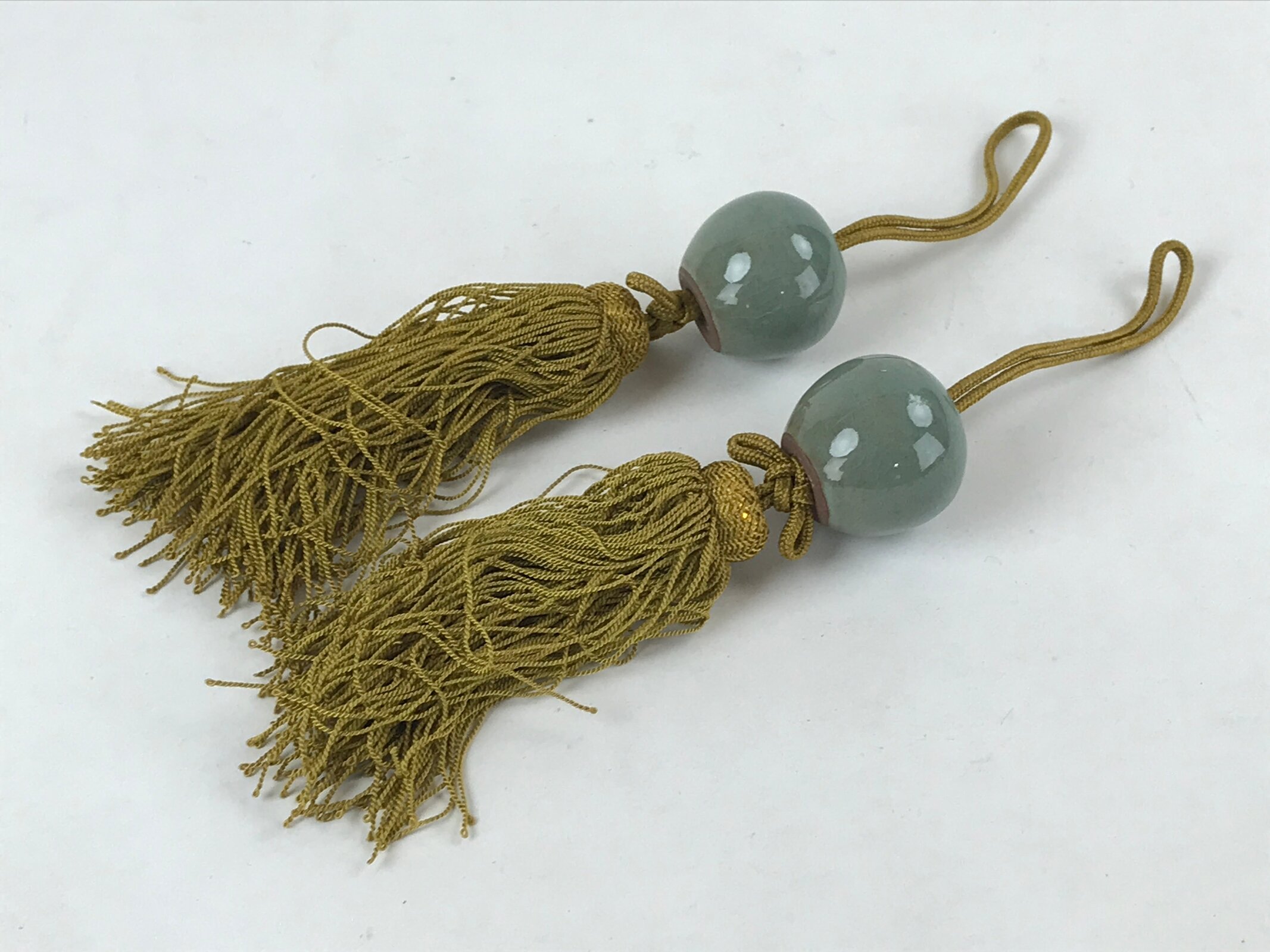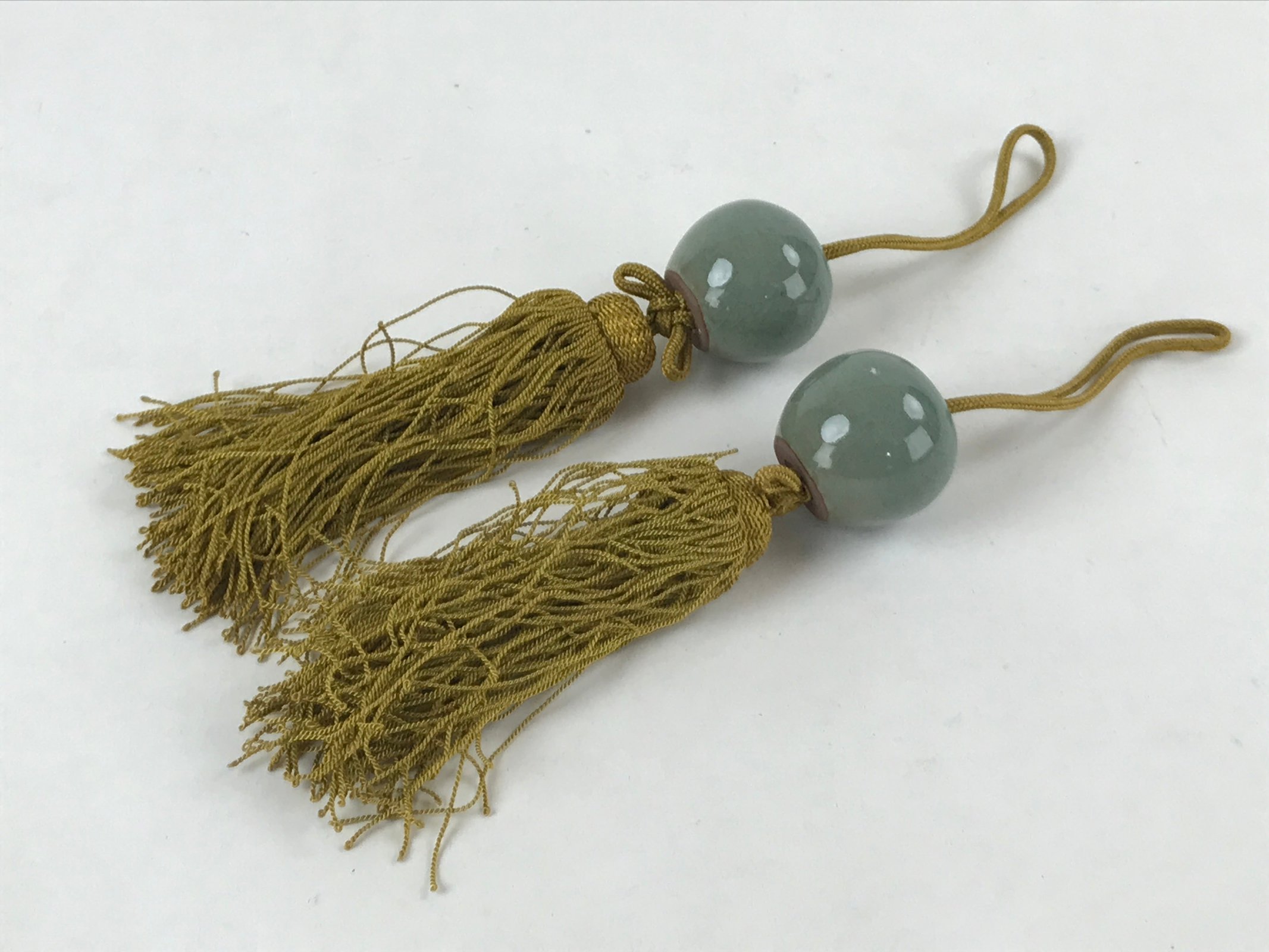 This is a pair of Japanese hanging scroll (kakejiku) weights, fuchin. With a crackled green glaze, the main feature of this piece is round ceramic spheres paired with golden silk tassels. Fuchin is a decoration that hangs on both ends of the bottom of a hanging scroll. It’s a decoration and a weight.