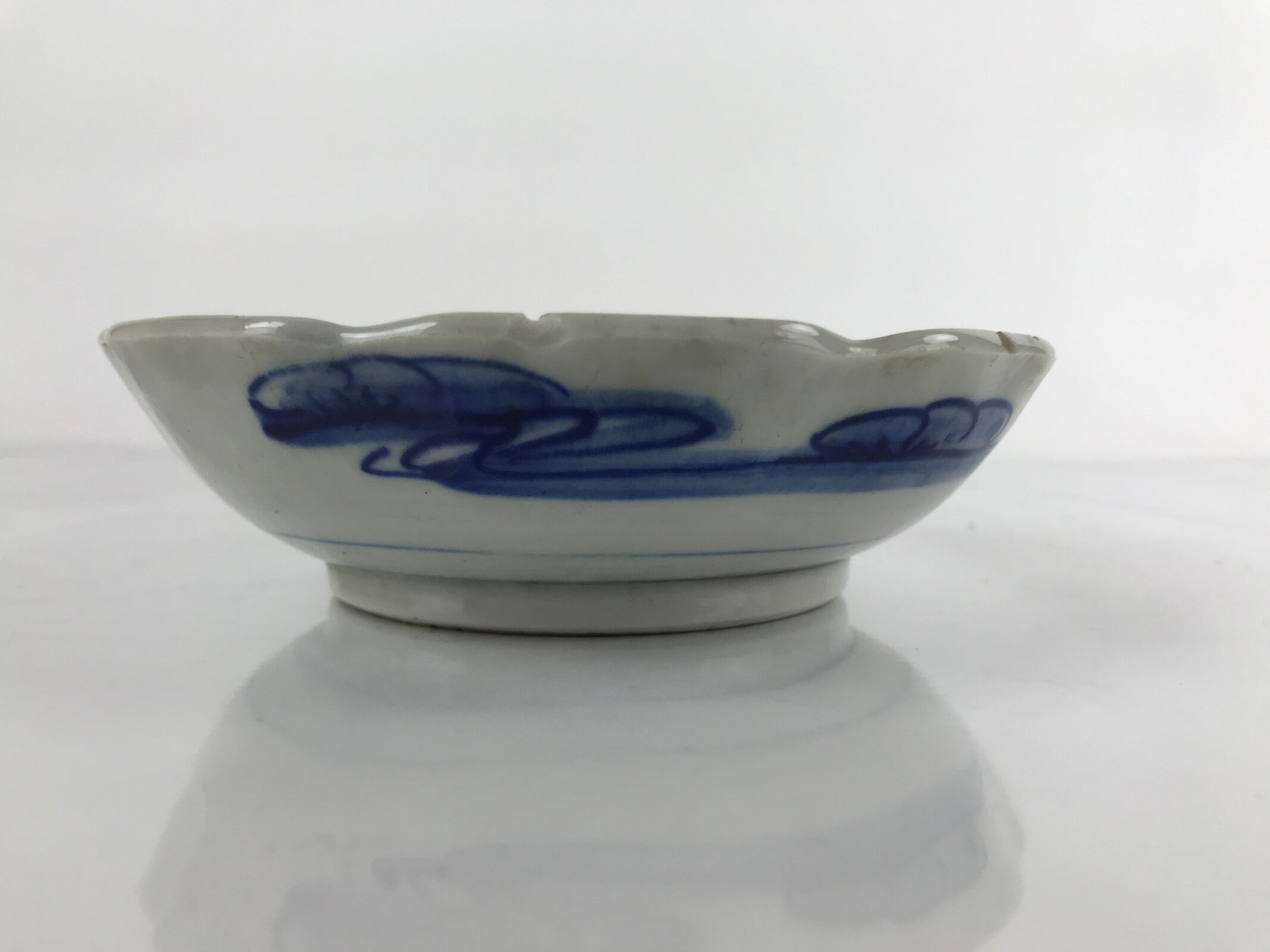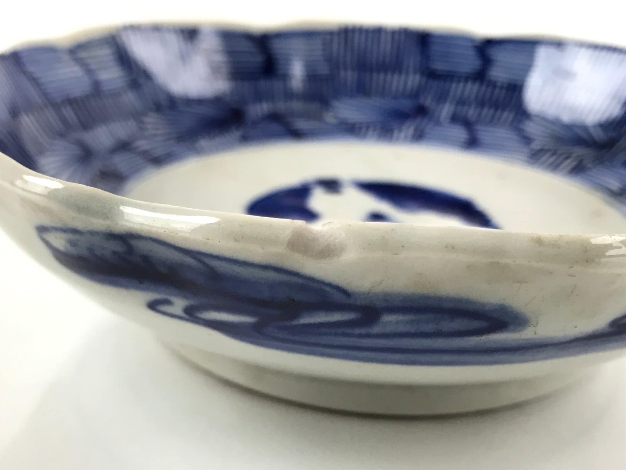 This item is an antique Japanese ceramic bowl. Handcrafted, this bowl, also called namasu, is used mainly for salads and other types of dressed chopped vegetables. It is white and blue sometsuke that features a hatched line inner border design as well as some floral and other nature motifs at the center. The outside edge has pine tree-looking designs. It has a petaled edge for extra decoration.